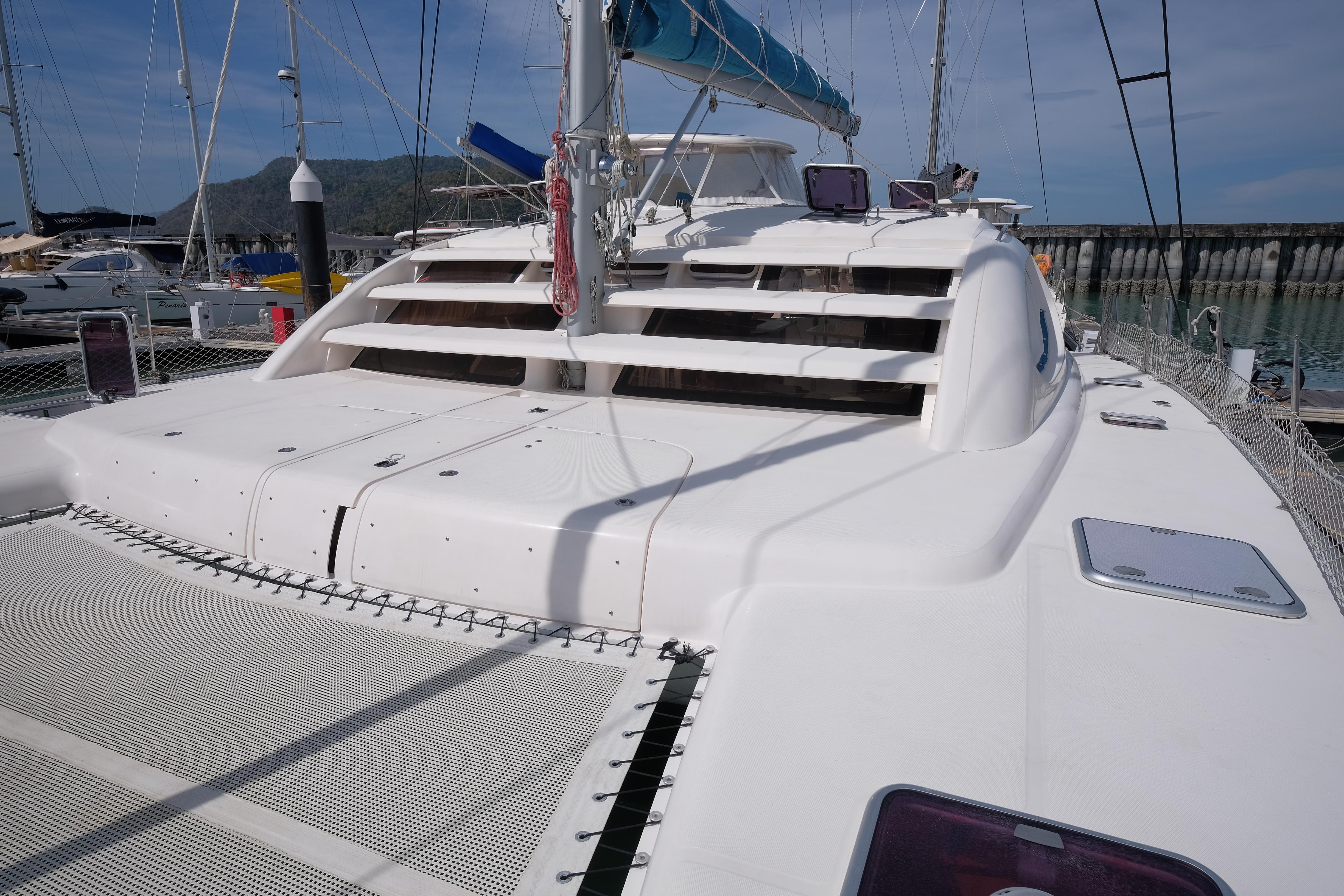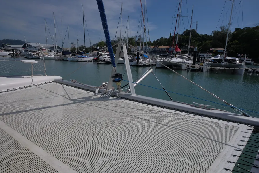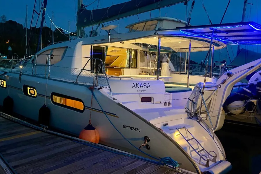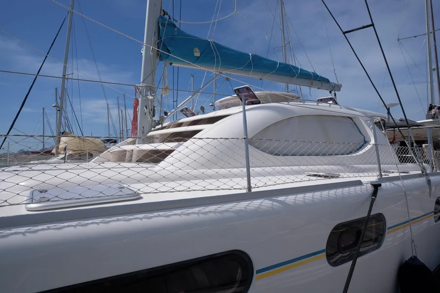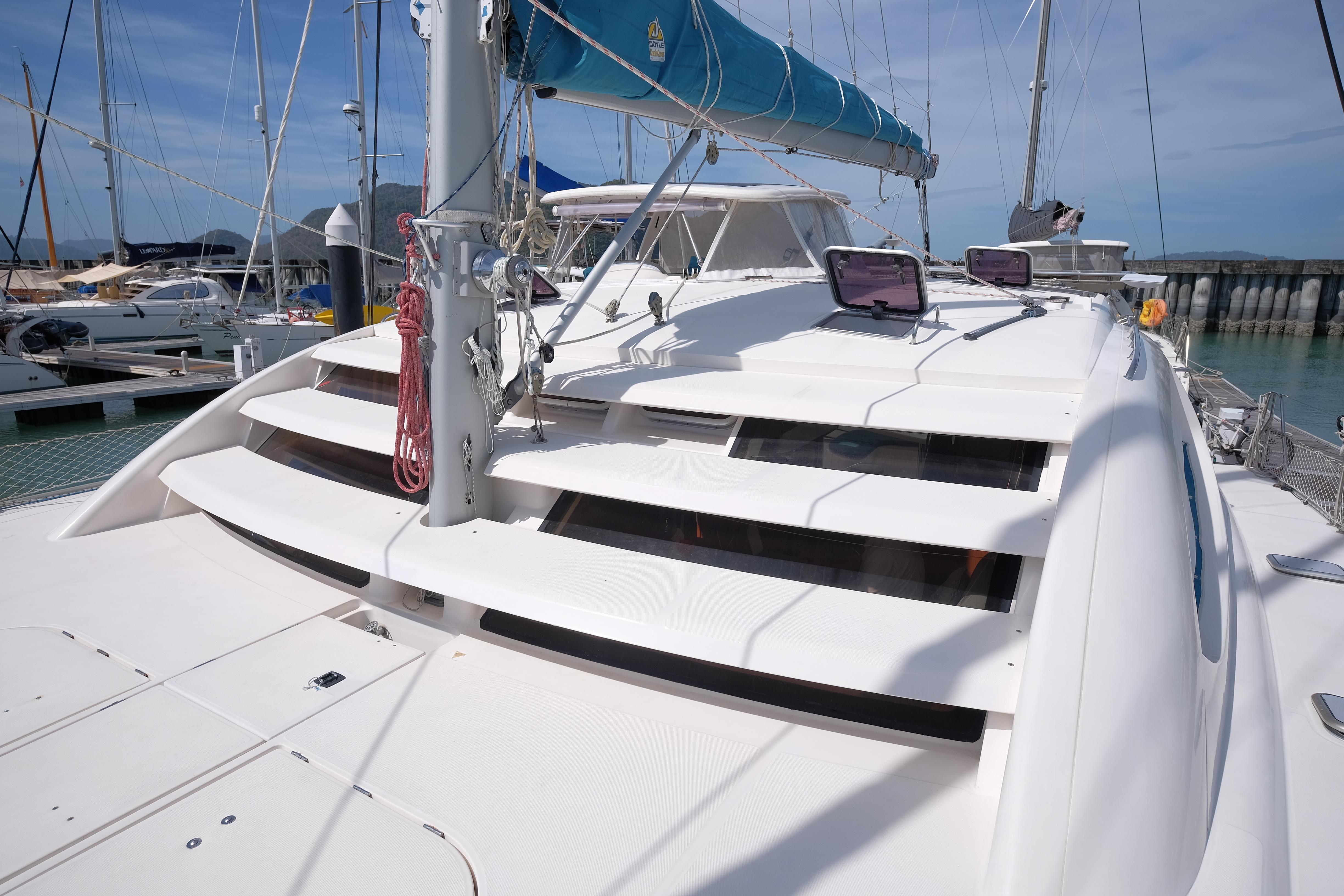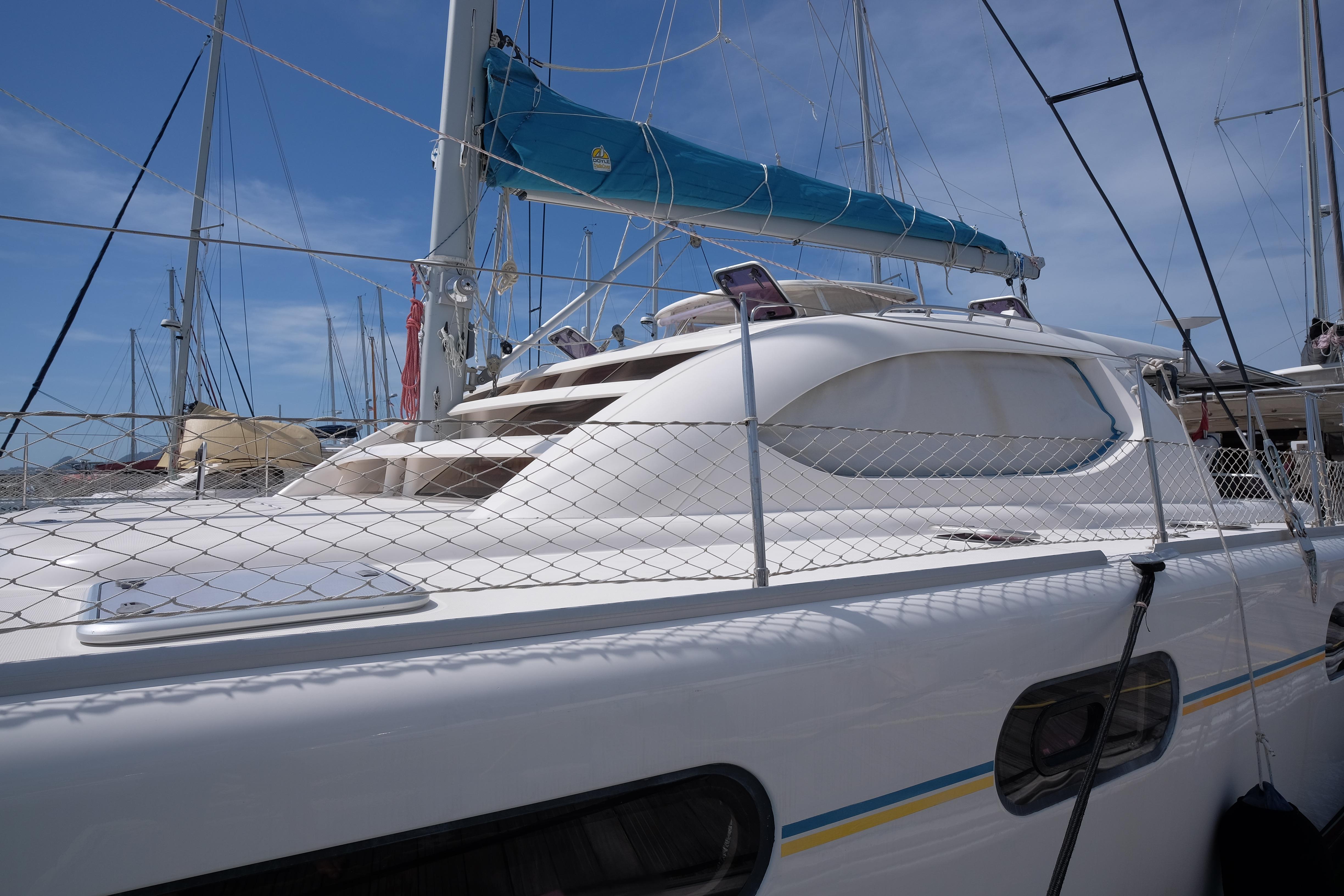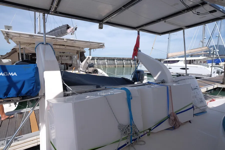 Lernen Sie AKASA kennen, eine sehr intelligente Langstrecken-Katze. Die Leopard 46 wurde zwischen 2006 und 2012 gebaut und weltweit exportiert, AKASA wurde 2009 vom Stapel gelassen. Sie kommt heute als kompletter Cruising Cat auf den Markt und ihre Besitzer haben nicht nur ihr Boot so gut ausgestattet, sondern ihre Wartung zeigt auch eine Tiefe von Wissen, die ein solcher Bonus für Käufer ist. Das Boot wurde vor kurzem für eine gründliche Inspektion des Rumpfes herausgeholt, alle Beschichtungen entfernt und Hunderte von Feuchtigkeitsmessungen vorgenommen. Die Messwerte waren perfekt und das Boot wurde im Februar 2026 mit frischem Antifouling wieder ins Wasser gelassen. Nur als vorbeugende Maßnahme für die Zukunft haben die Eigner zwei neue Kraftstofftanks aus Kunststoff anfertigen lassen, die so dimensioniert sind, dass sie durch die Tür unter Deck passen. Diese werden derzeit an den Davits gelagert.