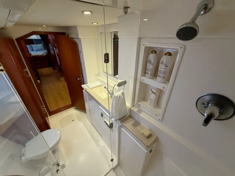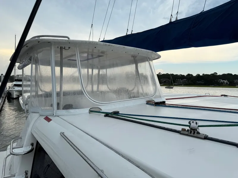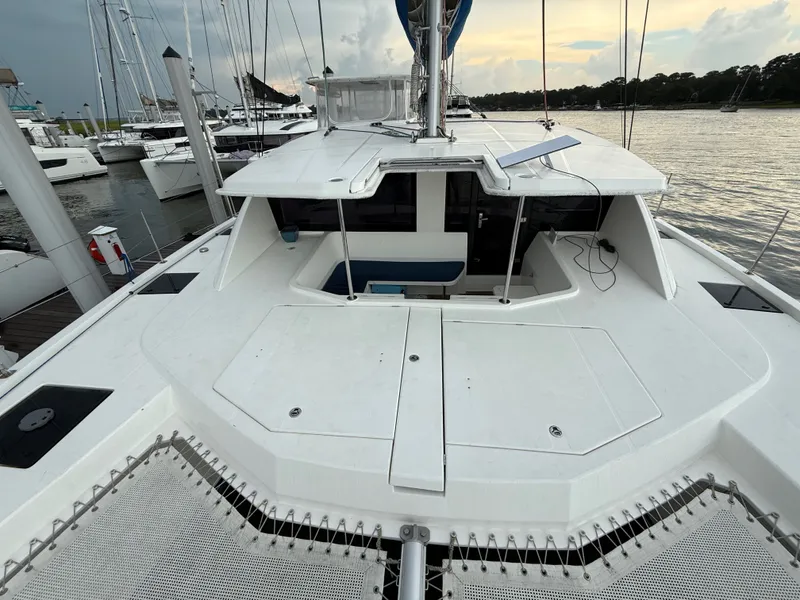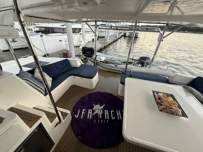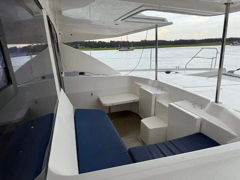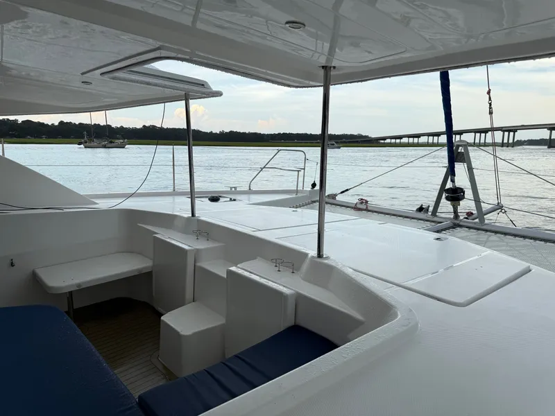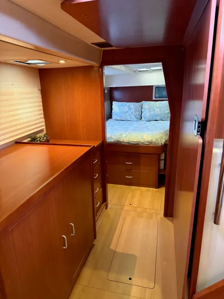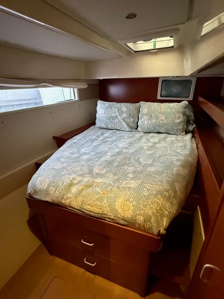 The saloon is bright and inviting, with wraparound seating, cherry finishes, and a large convertible dining table. The starboard hull features the coveted „owner’s suite“ with queen berth, desk/vanity, and abundant storage. The ensuite head includes a separate shower. The port hull offers two guest cabins each with private head and shower. Custom mattresses throughout elevate onboard comfort.