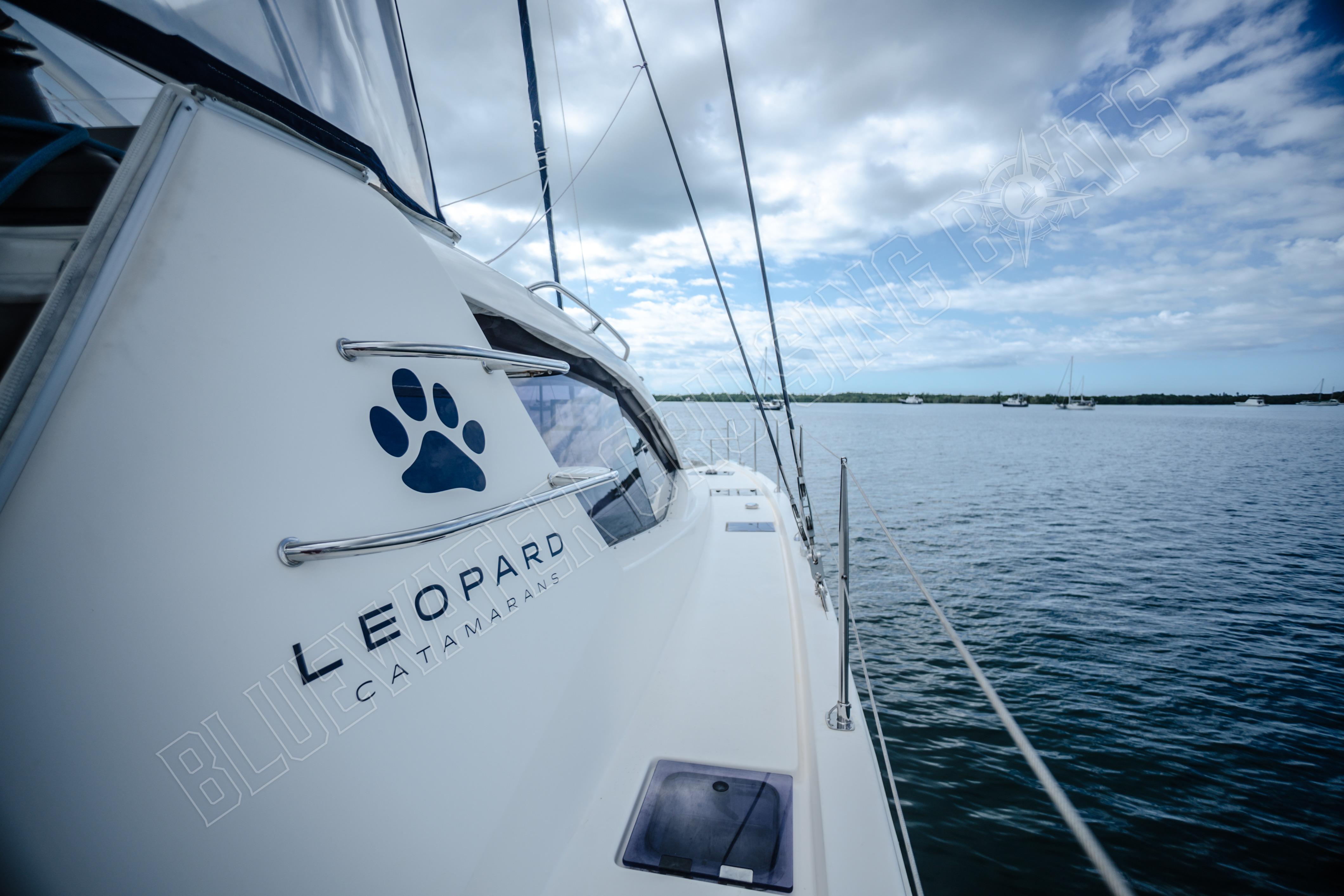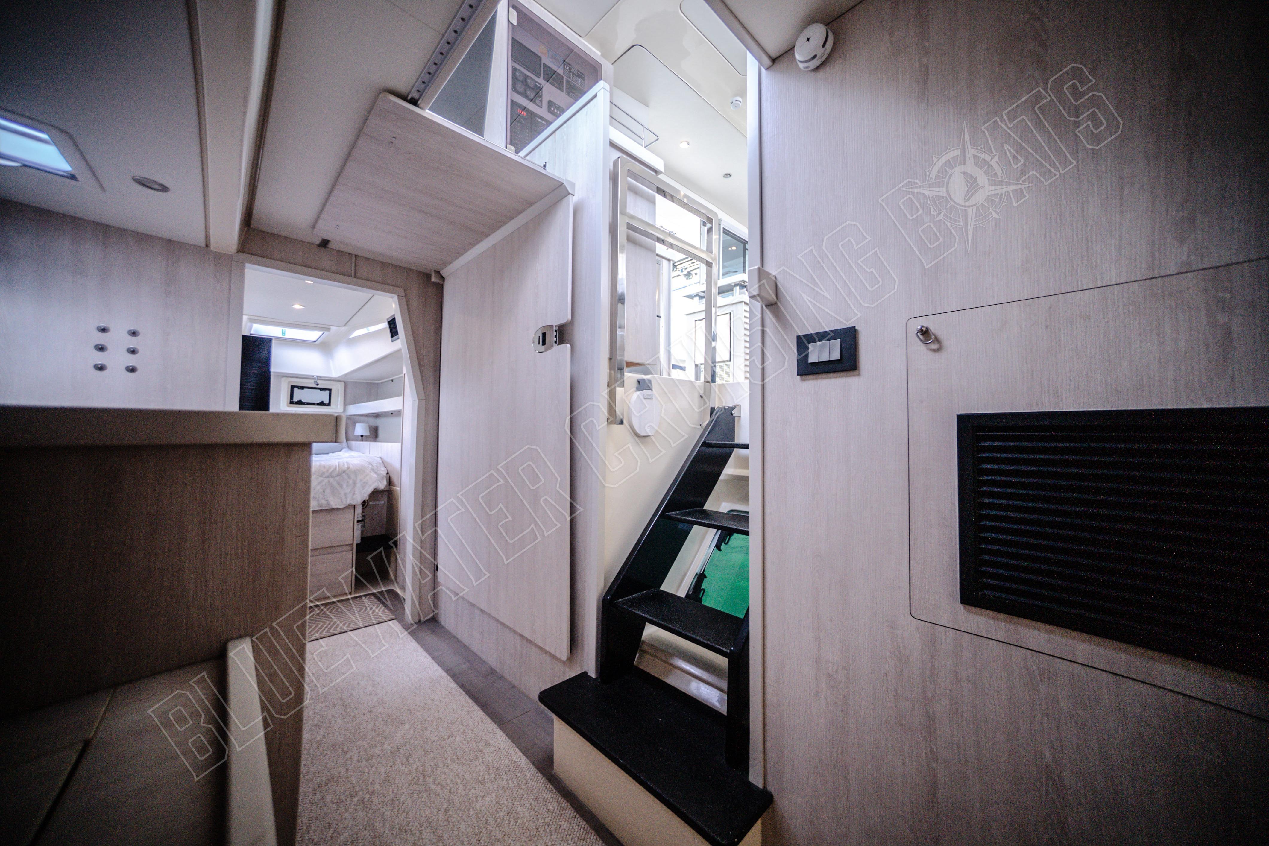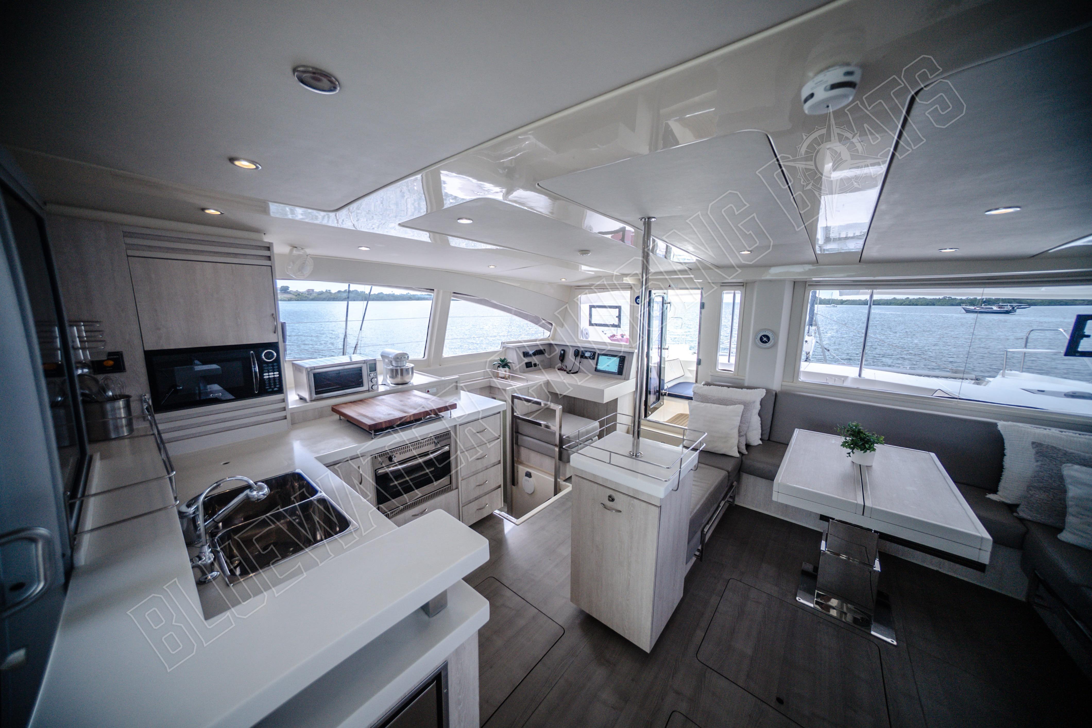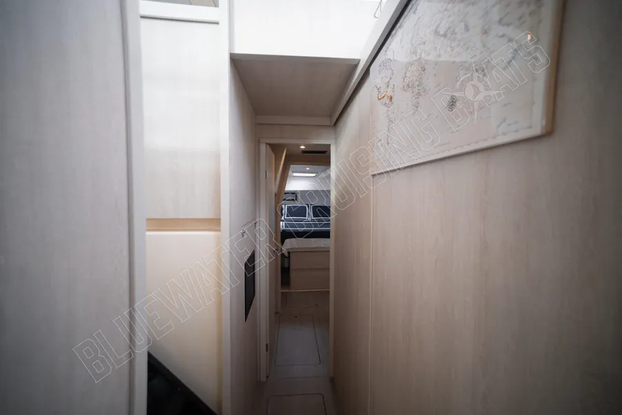 Beim Betreten des Schiffes vom hinteren Cockpit aus werden die Gäste in einem hellen und einladenden Hauptsalon begrüßt, der von großzügigen Fenstern umgeben ist, die für ausgezeichnetes natürliches Licht und einen Panoramablick sorgen. Eines der charakteristischen Merkmale des Designs der Leopard 48 ist die vordere Salontür, die direkt zum vorderen Cockpit-Sitzbereich führt. Dieses einzigartige Merkmal verbessert die Luftzirkulation im gesamten Schiff und schafft gleichzeitig einen zusätzlichen sozialen Raum zum Entspannen während der Fahrt oder zum Genießen der Brise vor Anker. Vom Salon aus führen Niedergänge in jeden Rumpf, wo die Eignersuite und die Gästeunterkünfte so angeordnet sind, dass sie sowohl komfortabel als auch funktional sind. Das Ergebnis ist ein Layout, das sich offen und verbunden anfühlt und dennoch private Rückzugsmöglichkeiten für alle an Bord bietet.