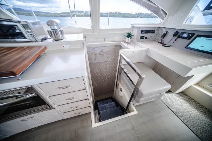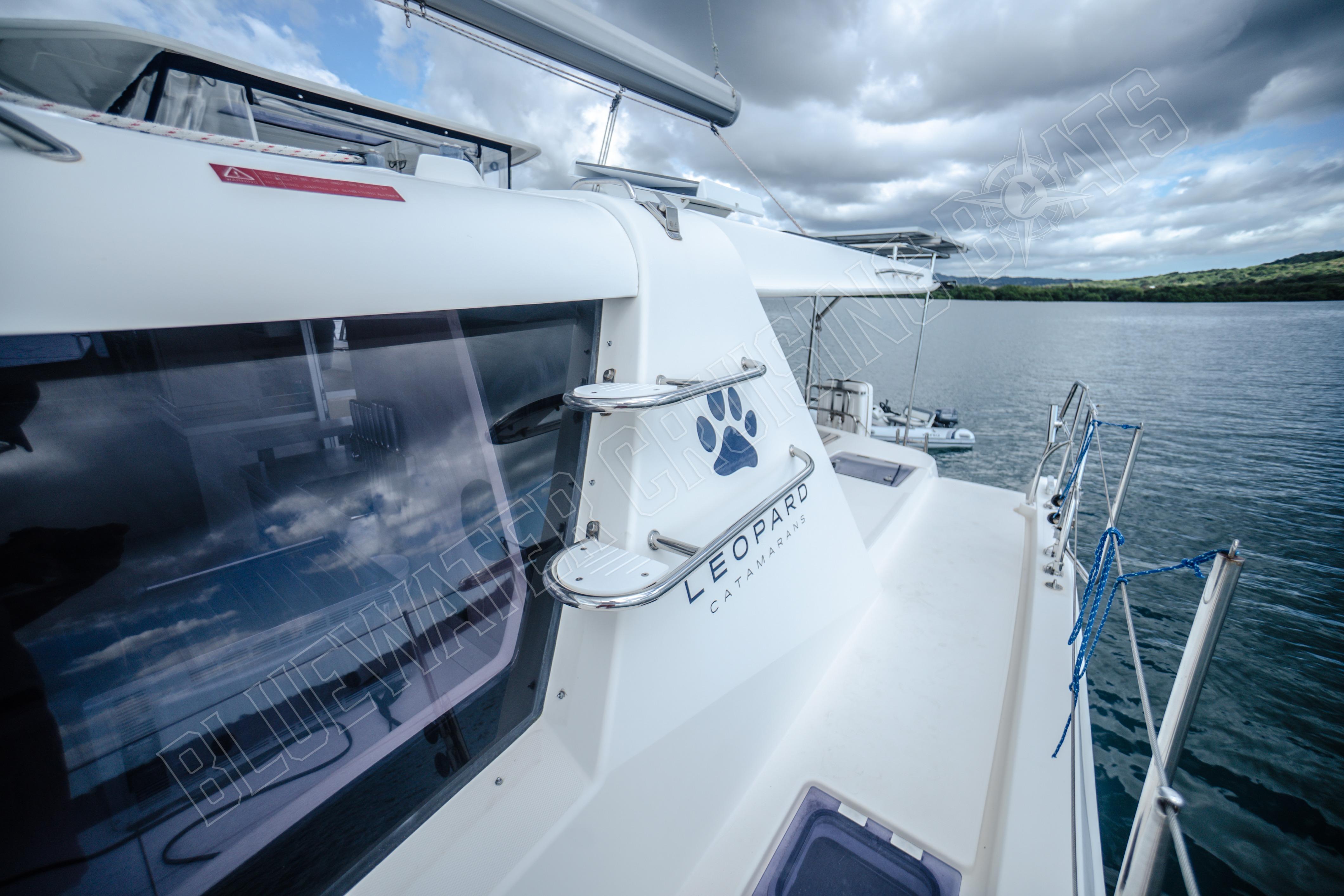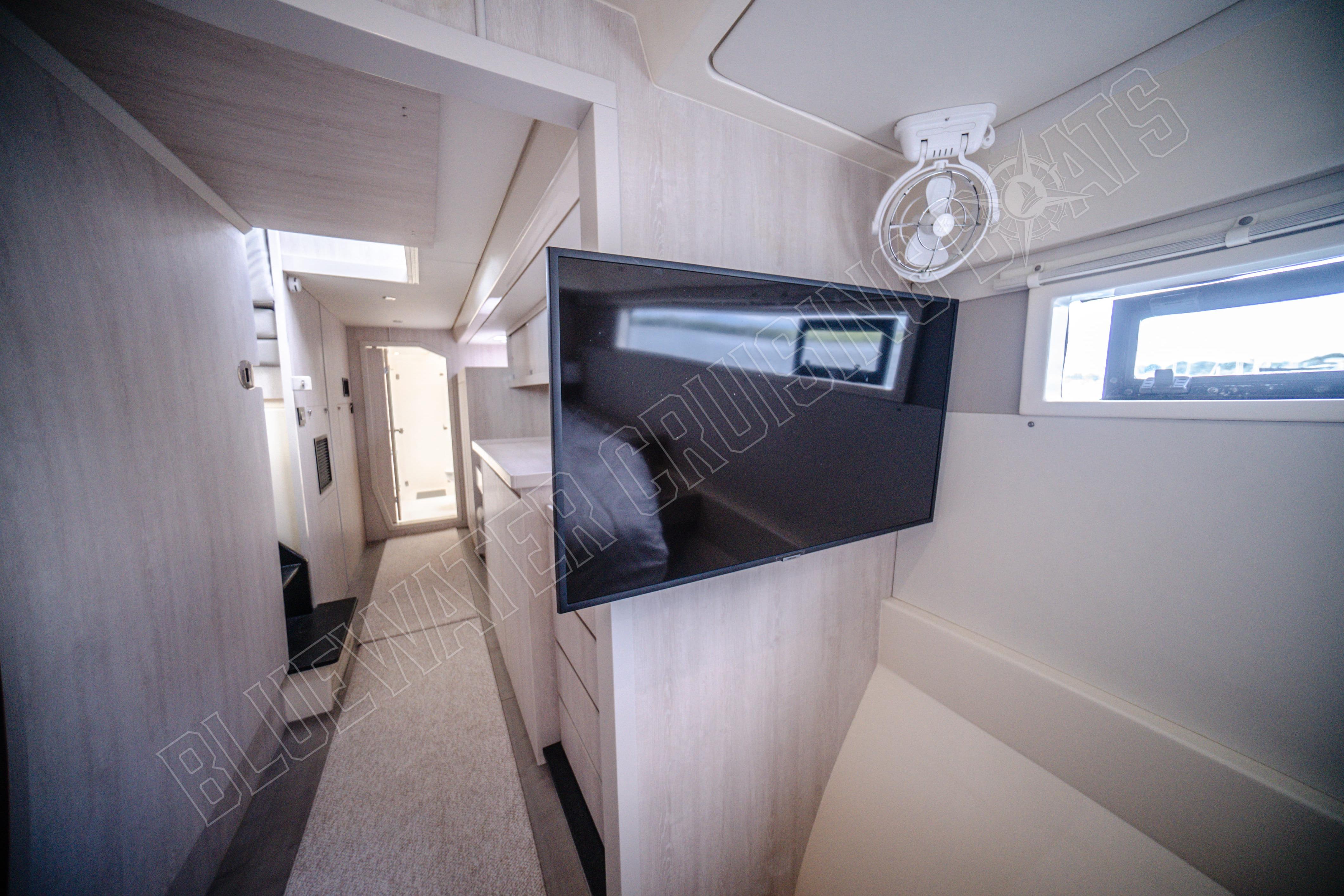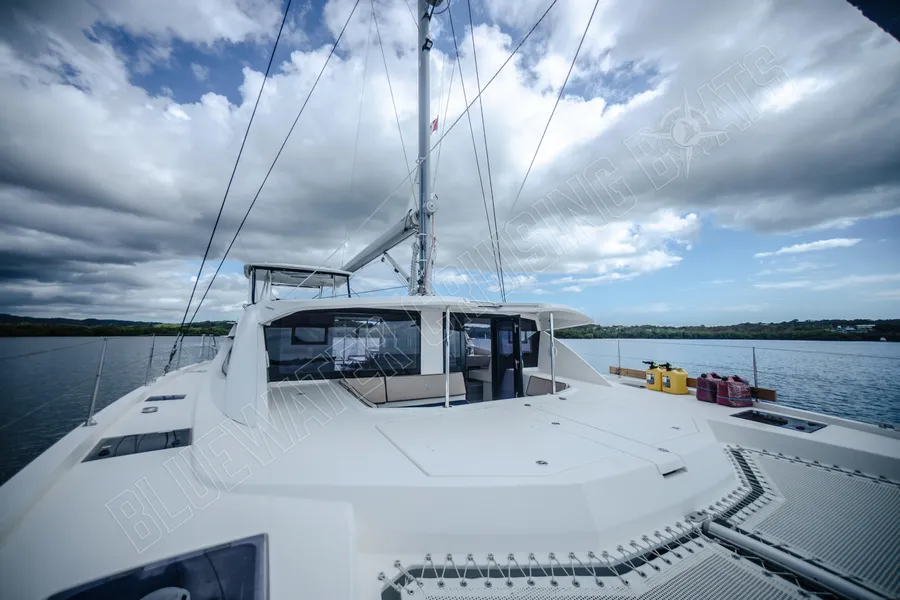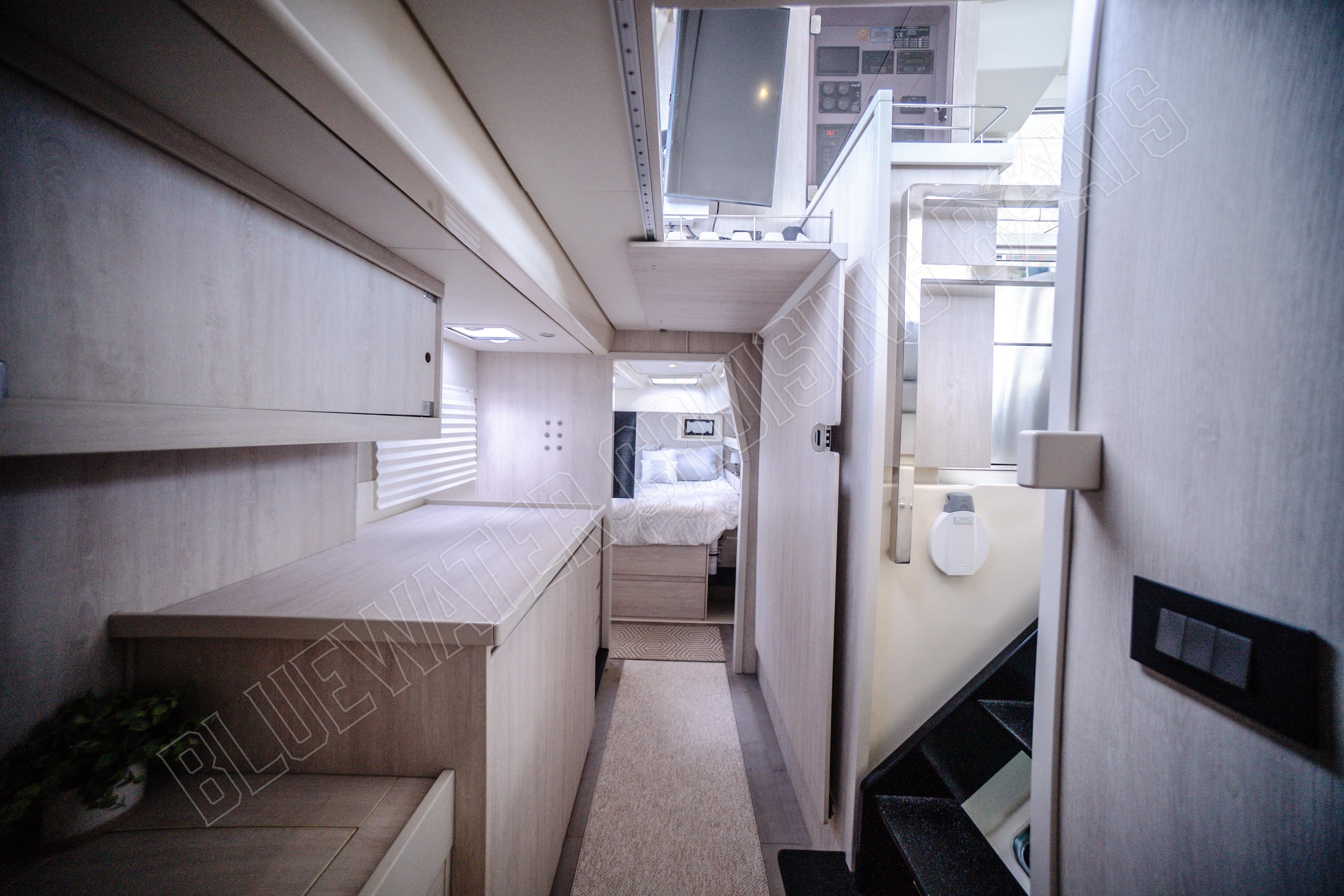 Beim Betreten des Schiffes vom hinteren Cockpit aus werden die Gäste in einem hellen und einladenden Hauptsalon begrüßt, der von großzügigen Fenstern umgeben ist, die für ausgezeichnetes natürliches Licht und einen Panoramablick sorgen. Eines der charakteristischen Merkmale des Designs der Leopard 48 ist die vordere Salontür, die direkt zum vorderen Cockpit-Sitzbereich führt. Dieses einzigartige Merkmal verbessert die Luftzirkulation im gesamten Schiff und schafft gleichzeitig einen zusätzlichen sozialen Raum zum Entspannen während der Fahrt oder zum Genießen der Brise vor Anker. Vom Salon aus führen Niedergänge in jeden Rumpf, wo die Eignersuite und die Gästeunterkünfte so angeordnet sind, dass sie sowohl komfortabel als auch funktional sind. Das Ergebnis ist ein Layout, das sich offen und verbunden anfühlt und dennoch private Rückzugsmöglichkeiten für alle an Bord bietet.