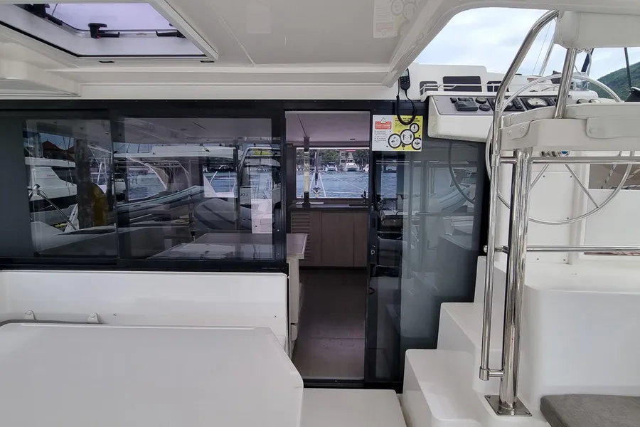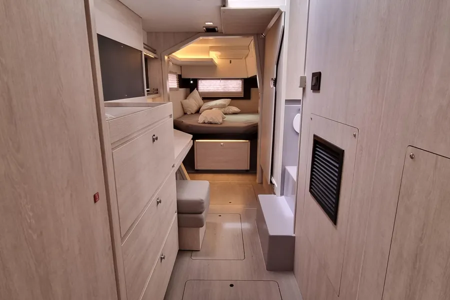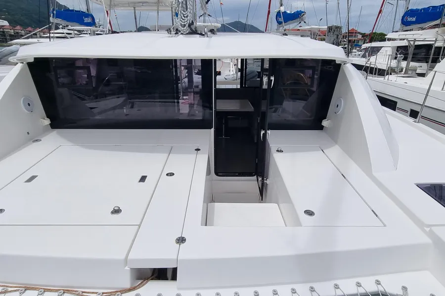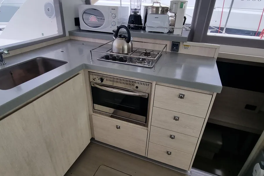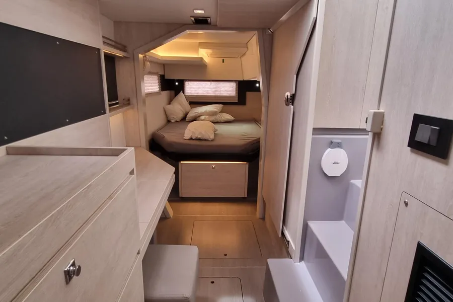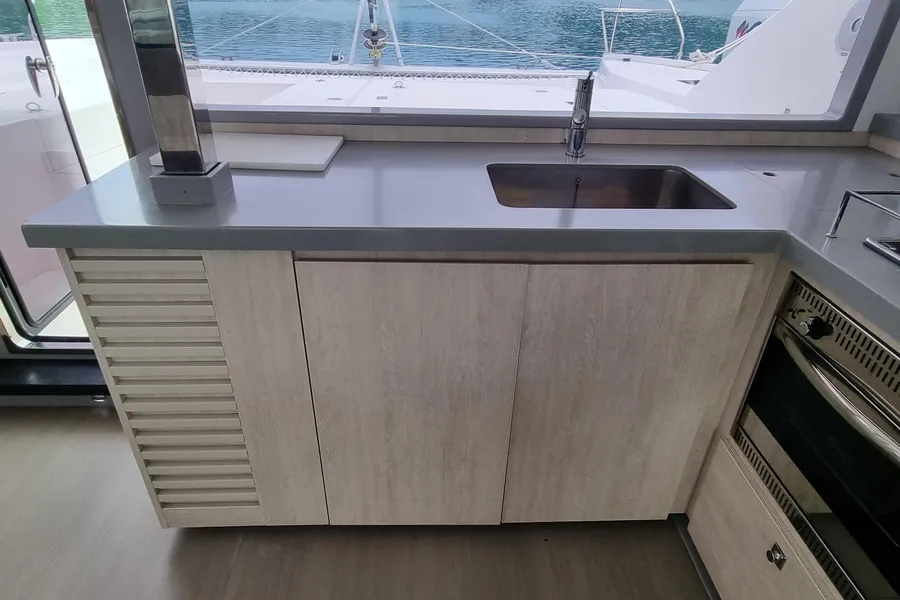 BUILDERS REMARKS: The Leopard 40’s innovative interior layout, increased volume in the hulls, and expanded windows and doors that blur the lines between inside and out combine to make the interior space feel like a larger yacht. The unique forward-facing galley stands in front of a large window with an adjacent access door to the forward platform. Aft, a forward-facing settee and dining table are separated from the aft cockpit seating area by sliding glass doors. These doors and windows enhance the open concept feel, allow for exceptional ventilation, and facilitate easy navigation in and around the yacht.