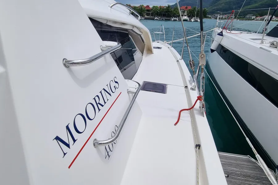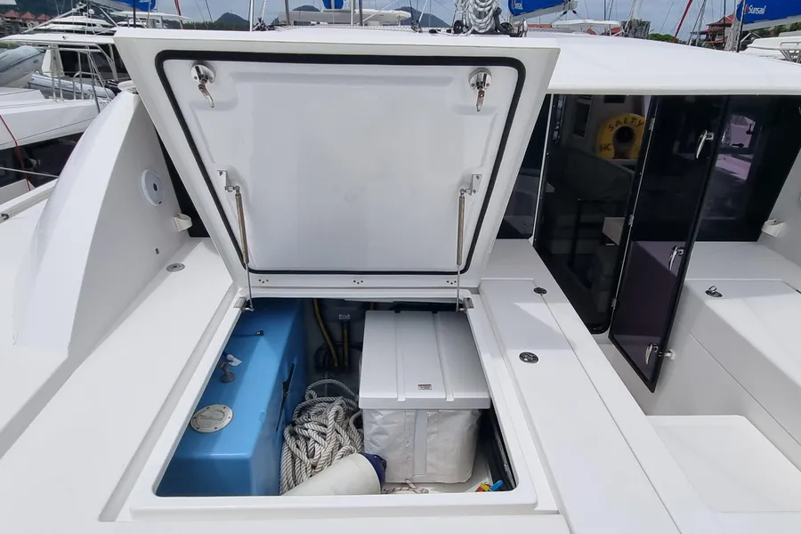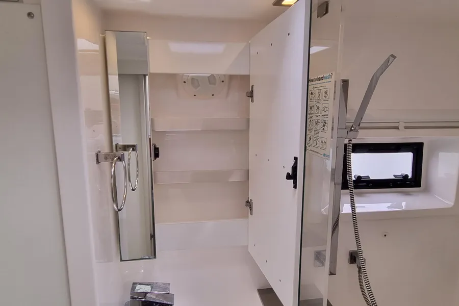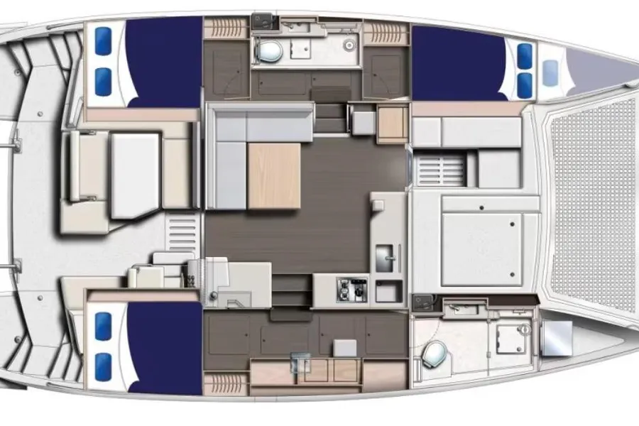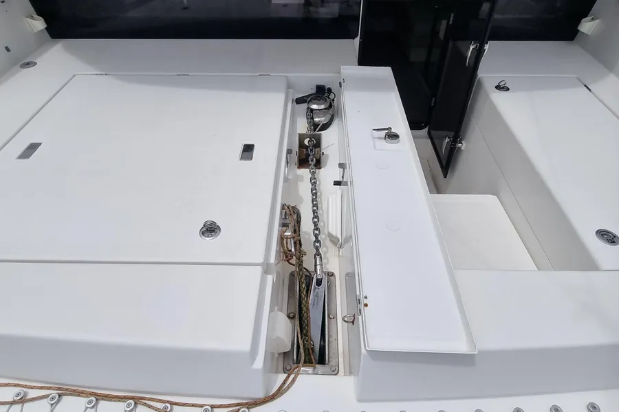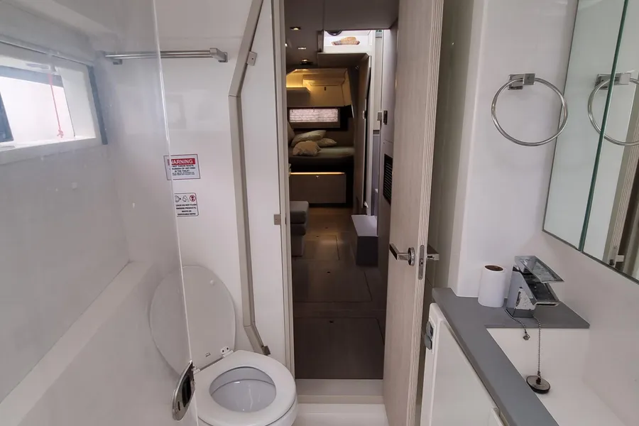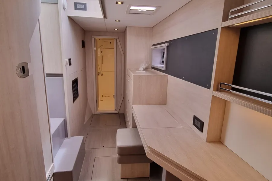 BUILDERS REMARKS: The Leopard 40’s innovative interior layout, increased volume in the hulls, and expanded windows and doors that blur the lines between inside and out combine to make the interior space feel like a larger yacht. The unique forward-facing galley stands in front of a large window with an adjacent access door to the forward platform. Aft, a forward-facing settee and dining table are separated from the aft cockpit seating area by sliding glass doors. These doors and windows enhance the open concept feel, allow for exceptional ventilation, and facilitate easy navigation in and around the yacht.