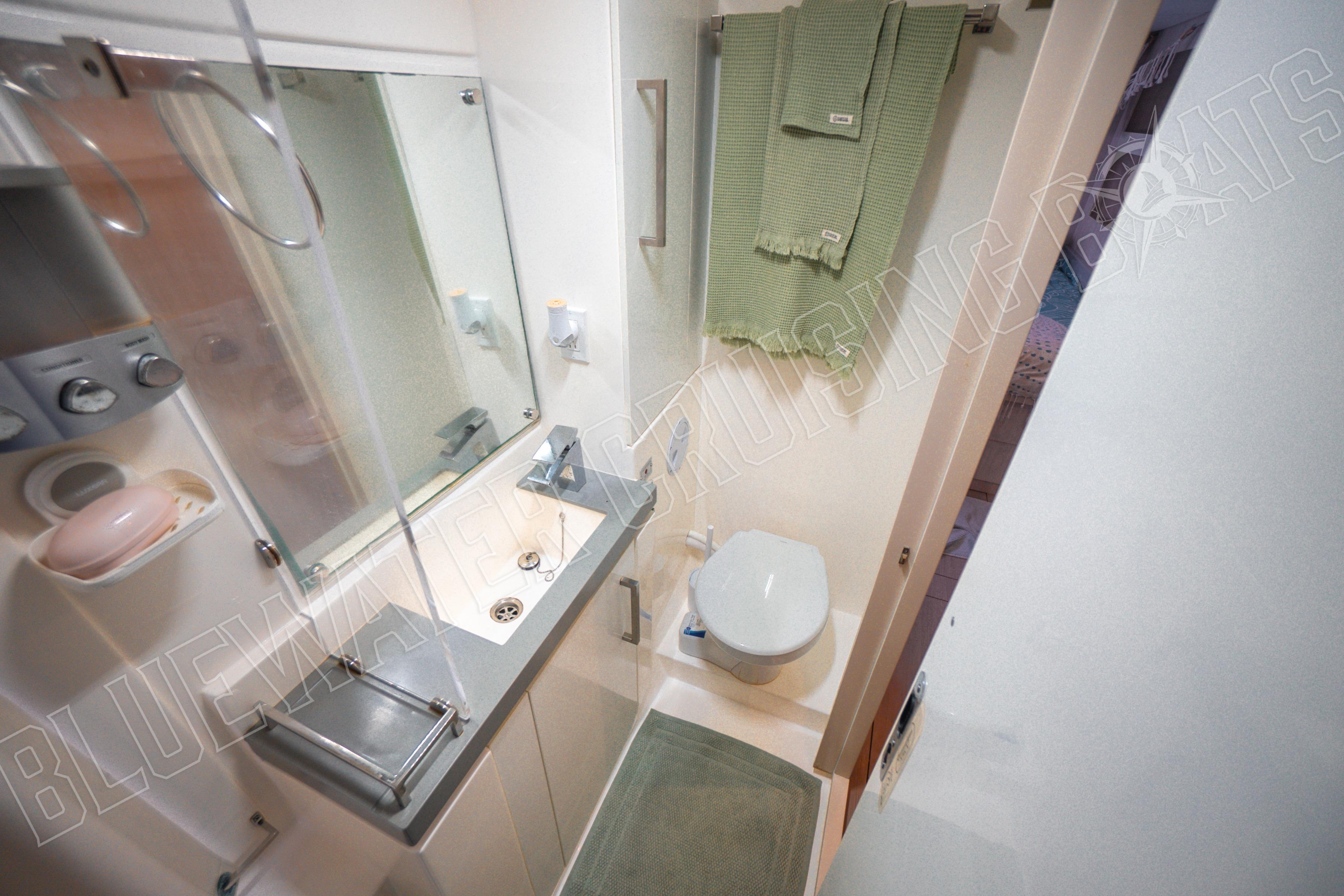 Die Sea Dog verfügt über ein Layout mit vier Kabinen und vier Nasszellen, wobei sich die Eignersuite im Steuerbordrumpf befindet. Ein Zimmer und eine Toilette für jede Person, so dass die Privatsphäre gewahrt bleibt und man sich keine Toilette mit einer anderen Person teilen muss.