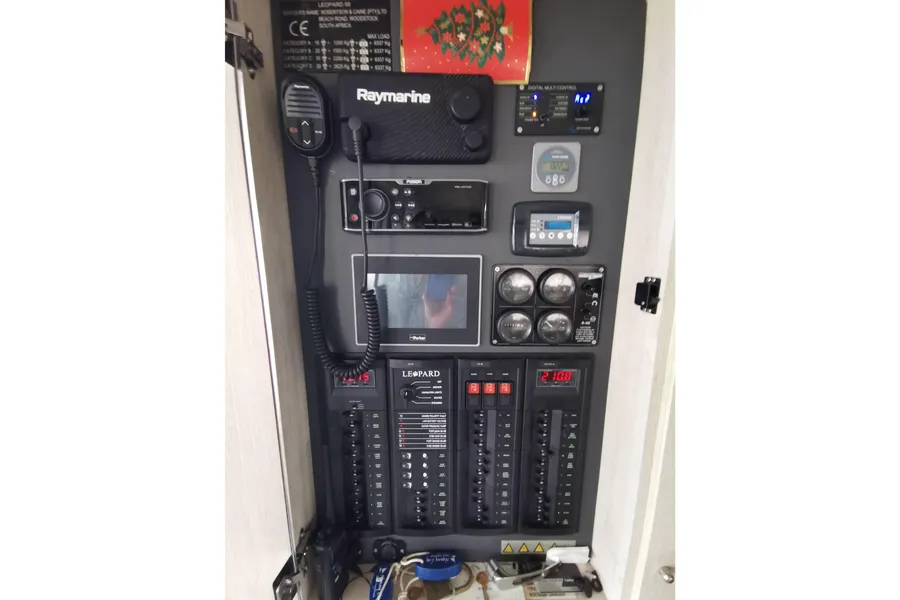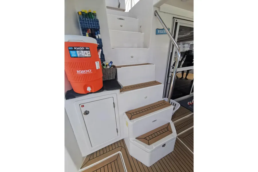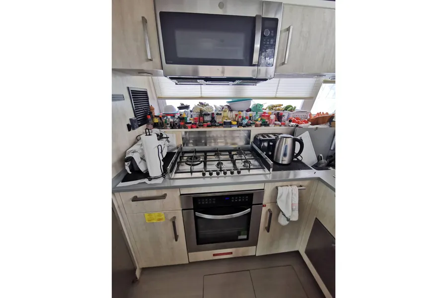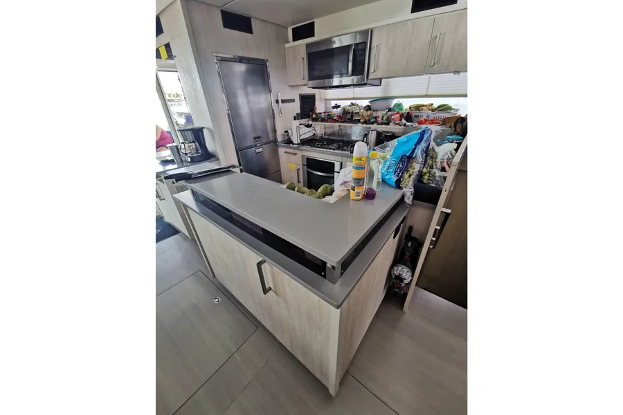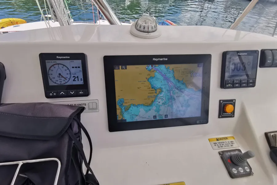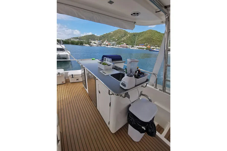 Venture up to the enormous fly bridge and captain from the helm station with a 360-degree vantage point, all sail control lines within arm’s reach, electric winches and a fully equipped Raymarine Navigation System. Performance under sail is nothing short of impeccable and made all the more pleasurable by fly bridge amenities including stylish lounge seating with an additional propane grill and wet bar/refrigerator.