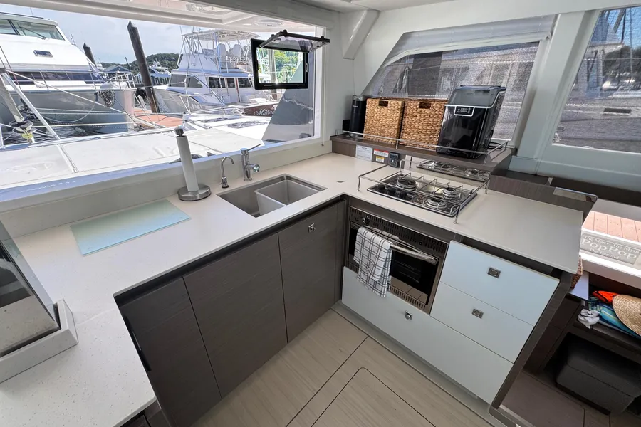 In the saloon, we have added a generous skylight, as well and an additional window in the aft starboard corner facing the helm seat. The forward-facing L-shaped galley is sure to entice any chef!