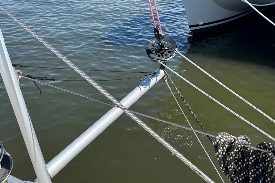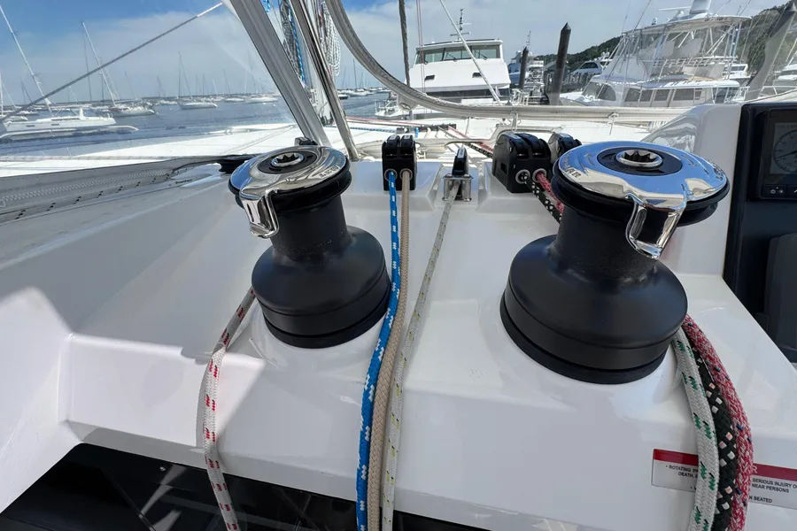 „Jolly Time“ is a rare Leopard 42 that was ordered with the ICW friendly rig / mast to get under fixed bridges on the Intracoastal Waterway. She was factory ordered and upgraded for off grid cruising, solar, lithium, watermaker, and box sprit with code zero for a third sail option.