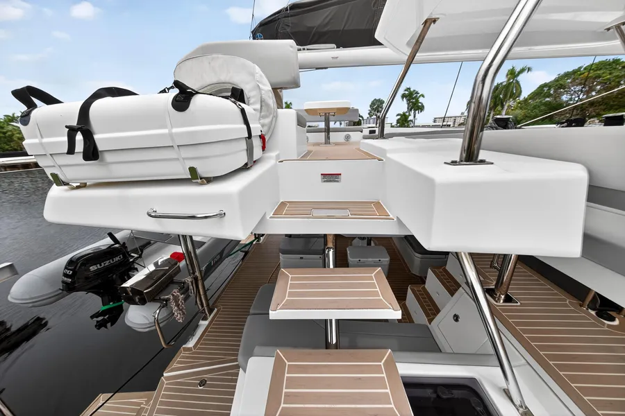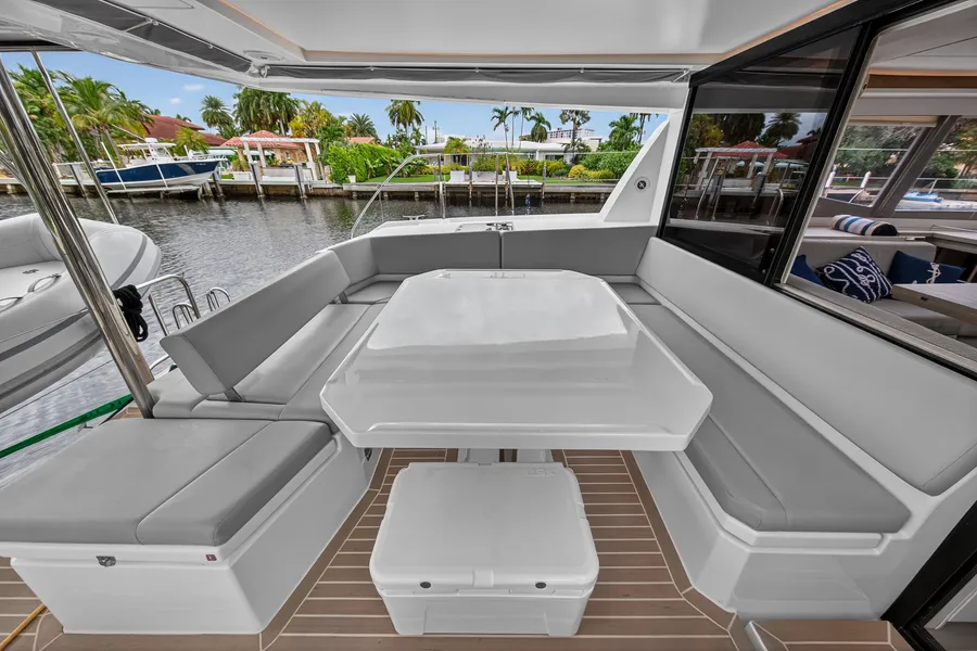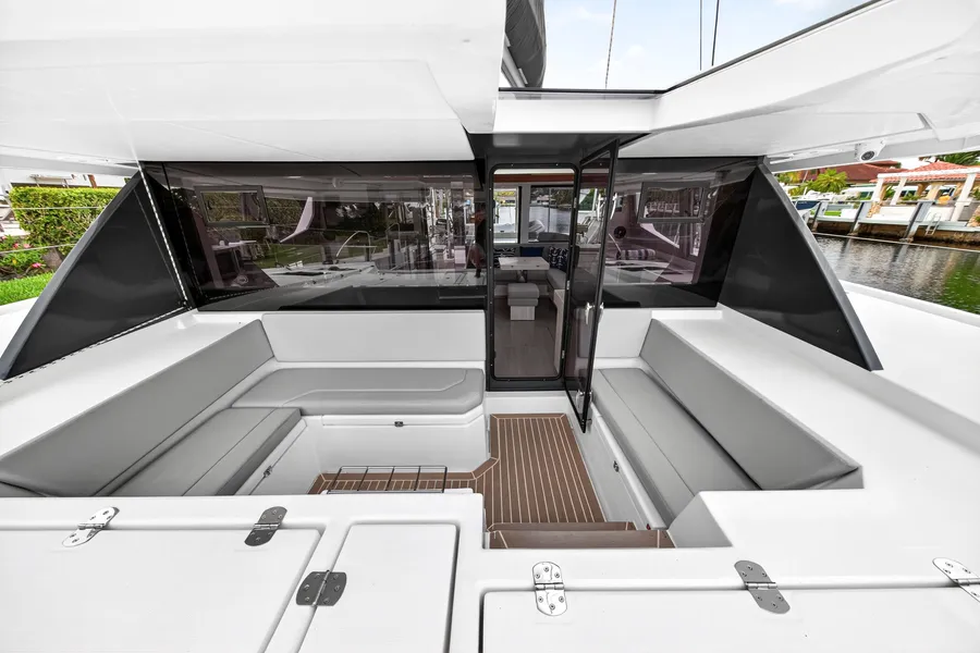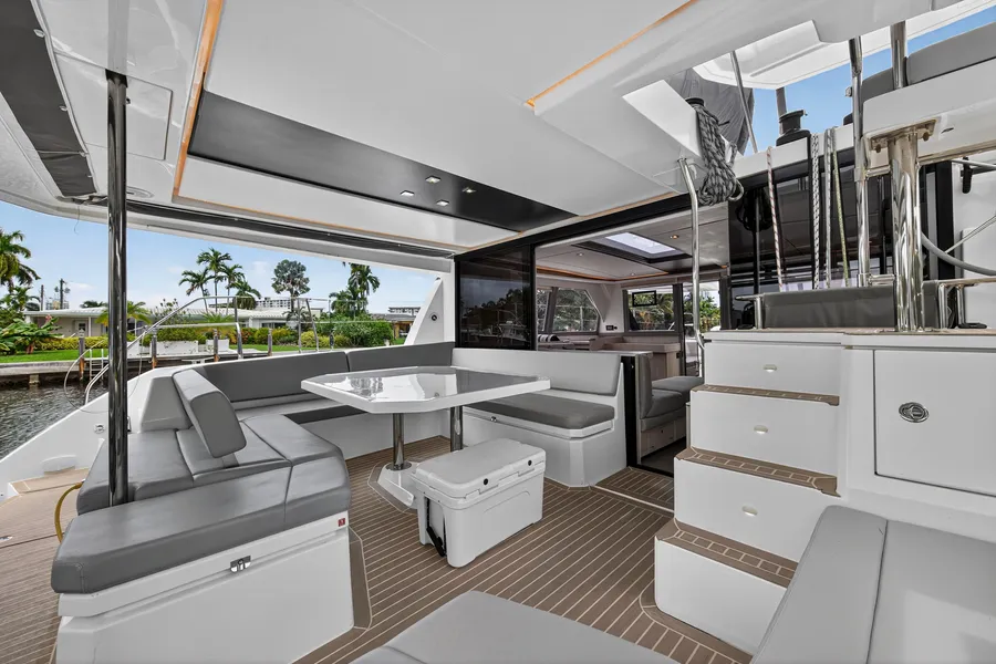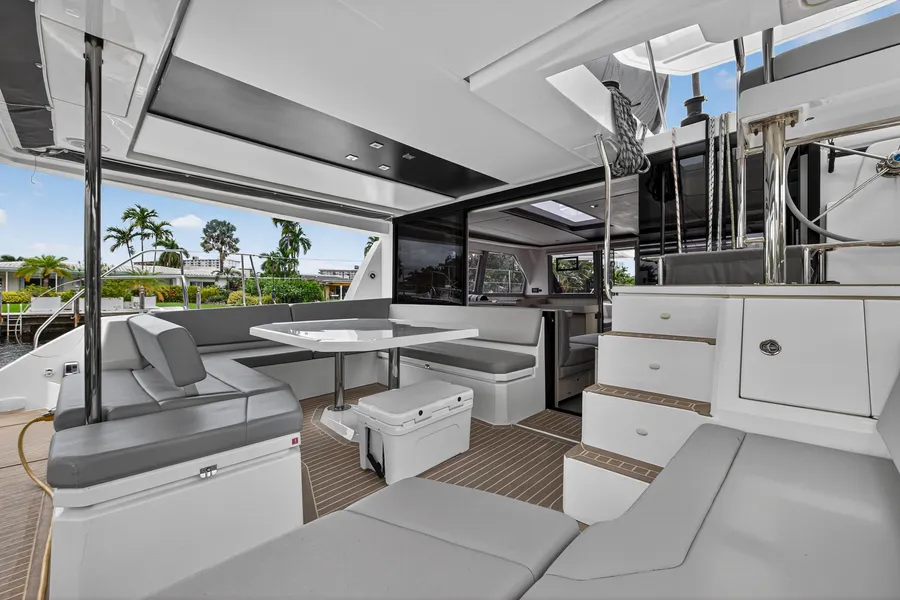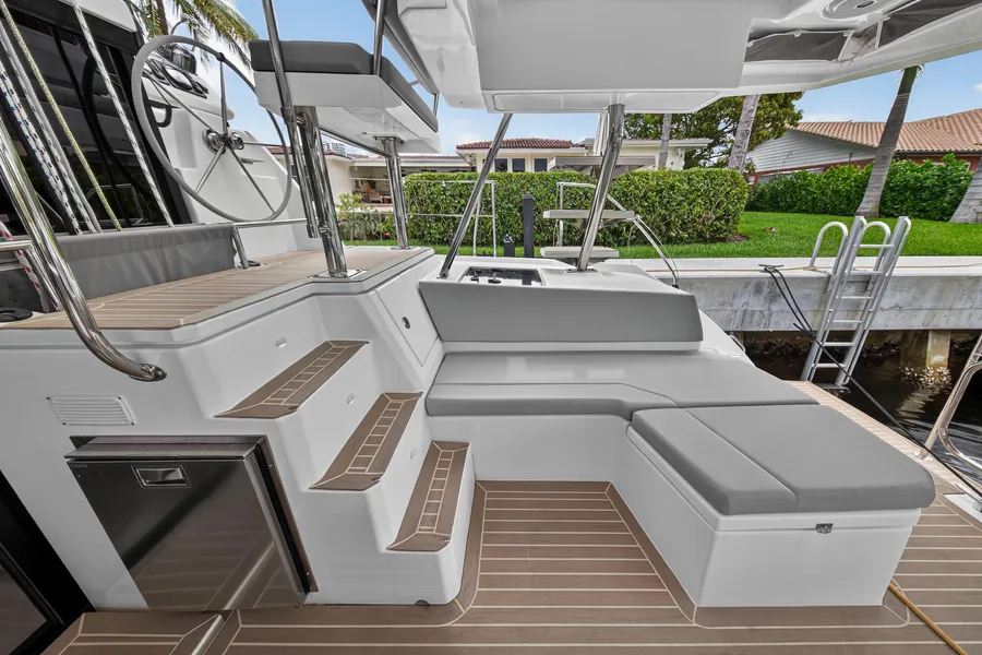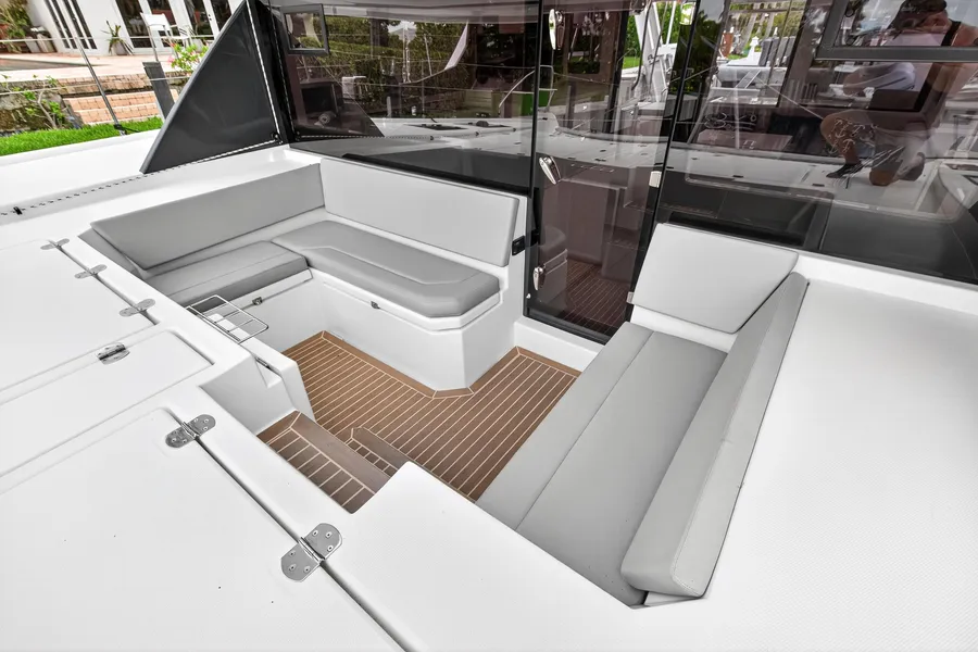 This lounge feature first launched on the award-winning Leopard 50 and like her big sister, the lounge on the Leopard 45 includes a seating area, a sunbed, and a table. Access to the lounge is provided by floating stairs leading up from the aft cockpit, without disrupting the helm station. The helm station remains well protected, and integrated into the cockpit and the rest of the boat.