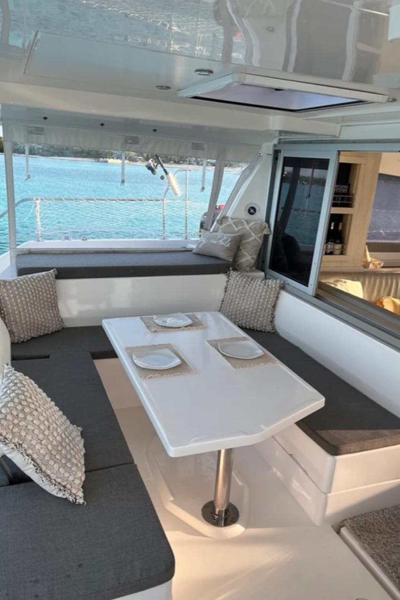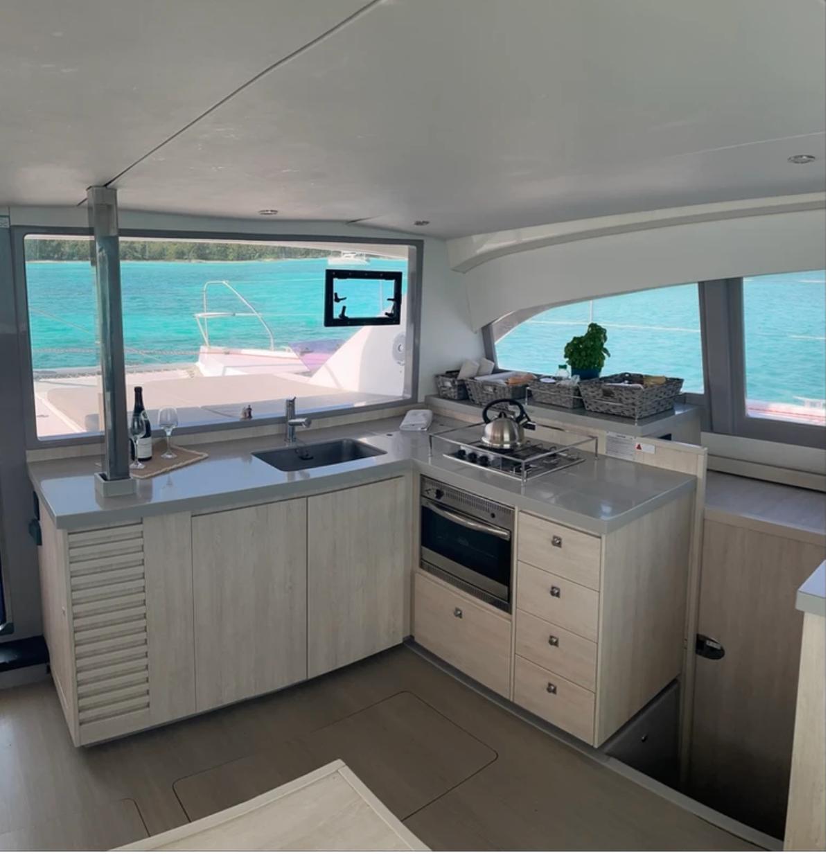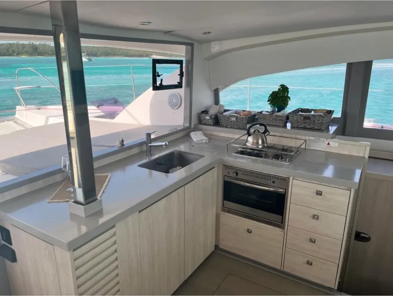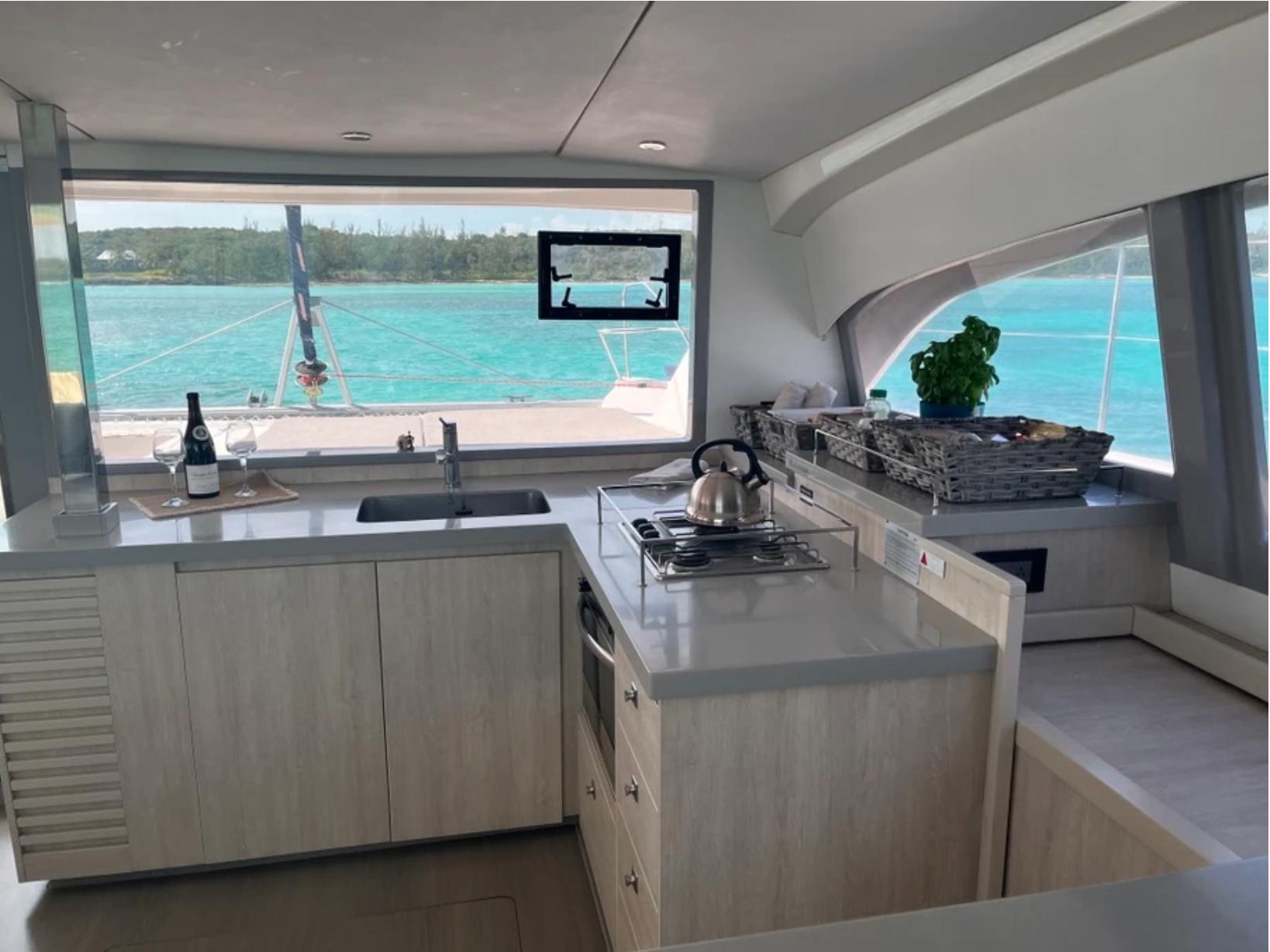 The Leopard 40’s interior design is unlike any Leopard before her. Her galley is located forward and the forward-facing settee and table are now located aft. This allows for a panoramic view with large sliding glass doors between the saloon and the aft cockpit. This arrangement promotes easy communication for guests and an open flow between the saloon and the aft cockpit, and a fusion of indoor and outdoor living space. In addition, the galley area includes a large forward-facing window and an access door to the forward platform of the boat. The access door enhances the open concept feel and easy navigation in and around the yacht. It also promotes ventilation throughout the interior.