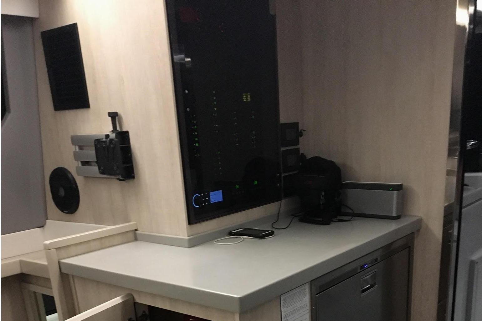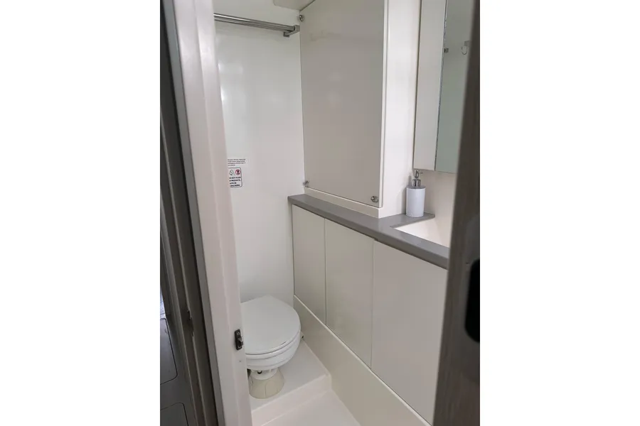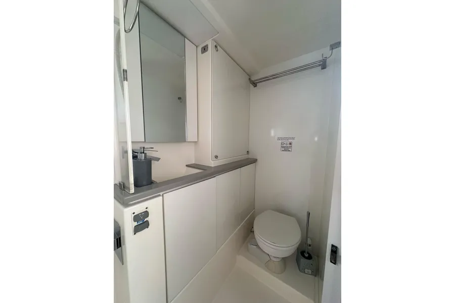 The modern, open salon offers panoramic views, a fully equipped galley, and a cozy lounge, creating a bright and inviting living space. Expansive outdoor areas include a large cockpit, forward trampoline, and a foredeck cocktail lounge, perfect for relaxation and entertainment. With only 3100 engine hours, the boat has been continuously maintained by both the owners and a professional management company.