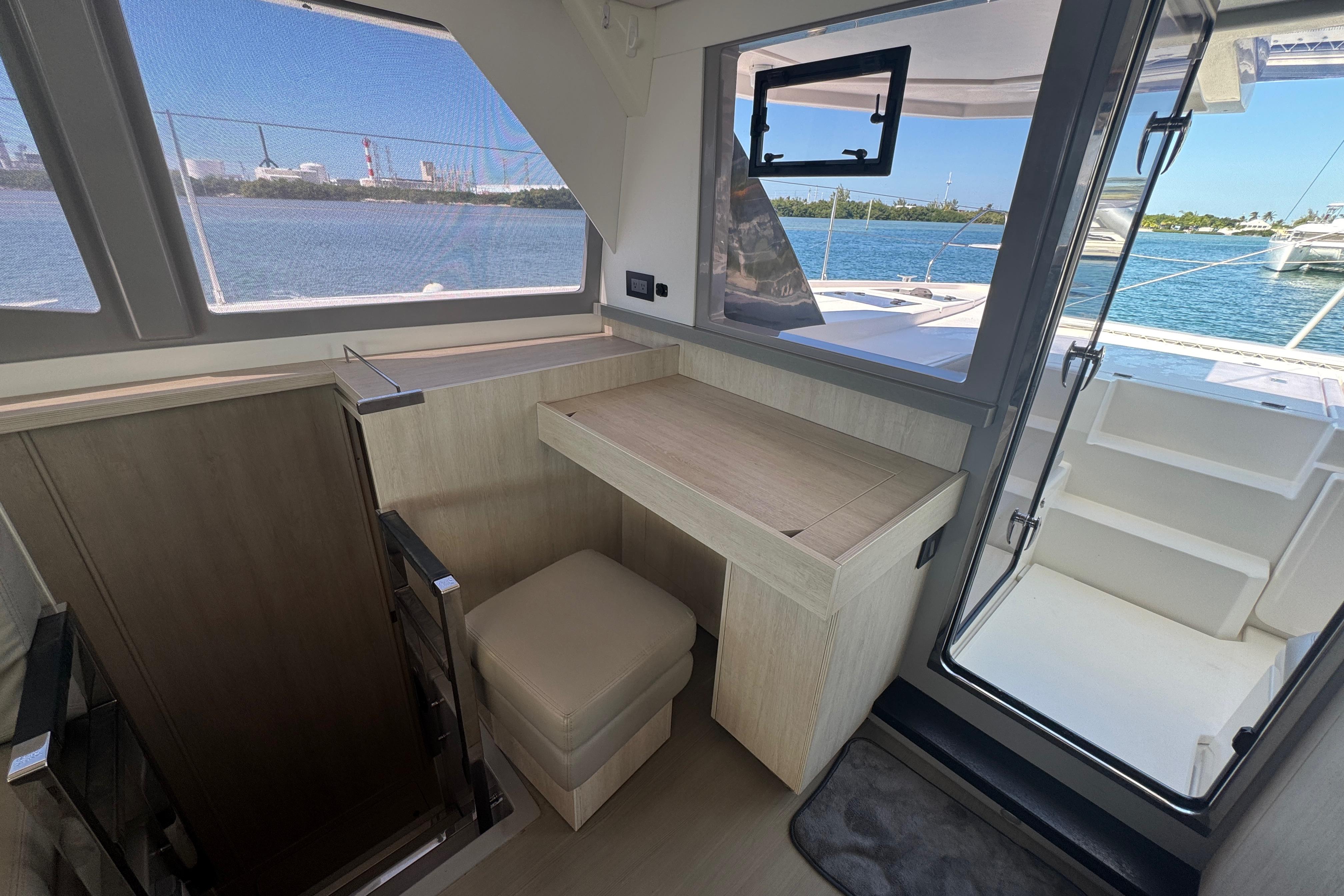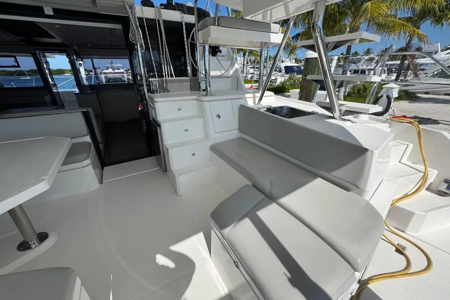 and like her big sister, the lounge on the Leopard 45 includes a seating area, a sunbed, and a table. Access to the lounge is provided by floating stairs leading up from the aft cockpit, without disrupting the helm station. The helm station remains well protected, and integrated into the cockpit and the rest of the boat.