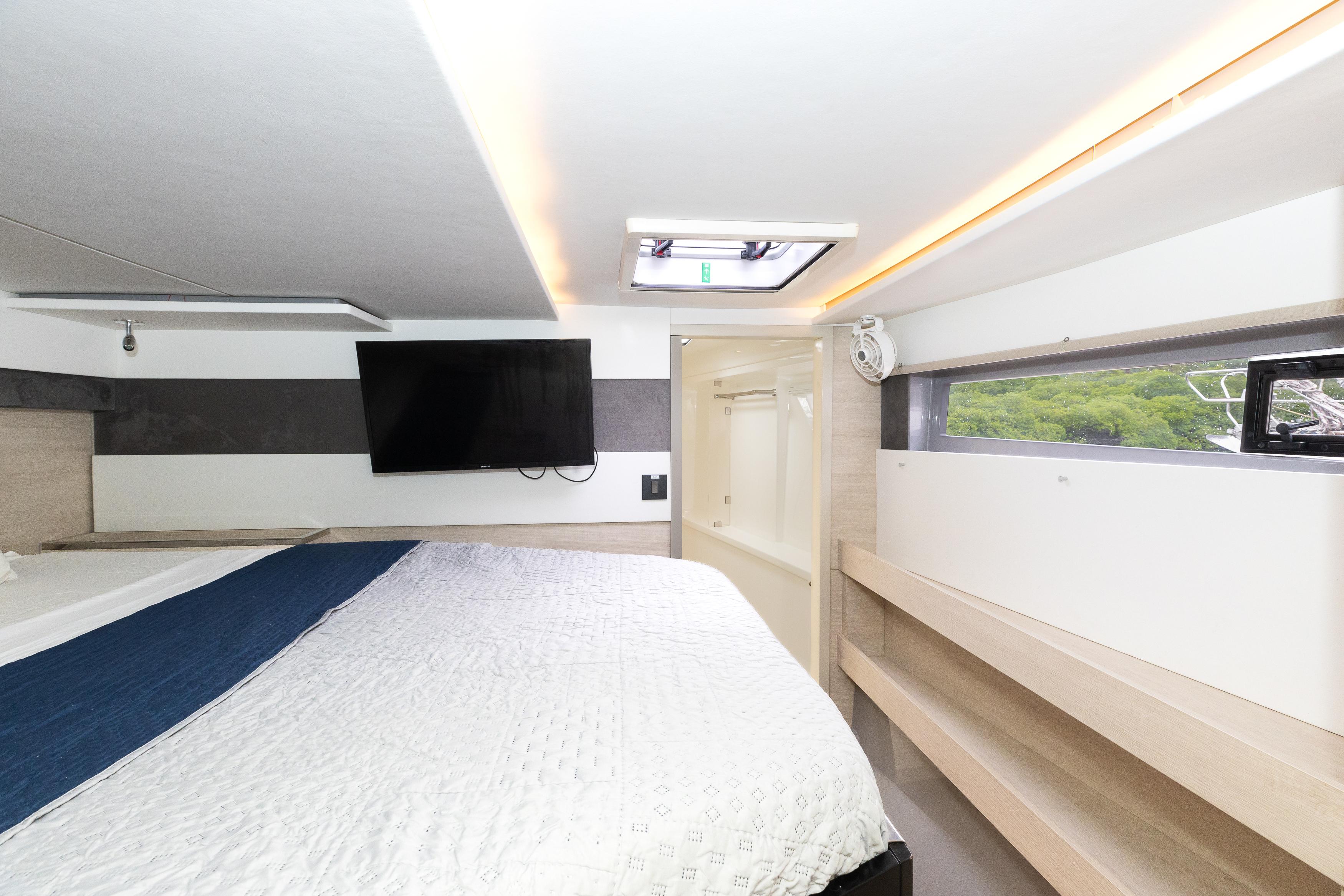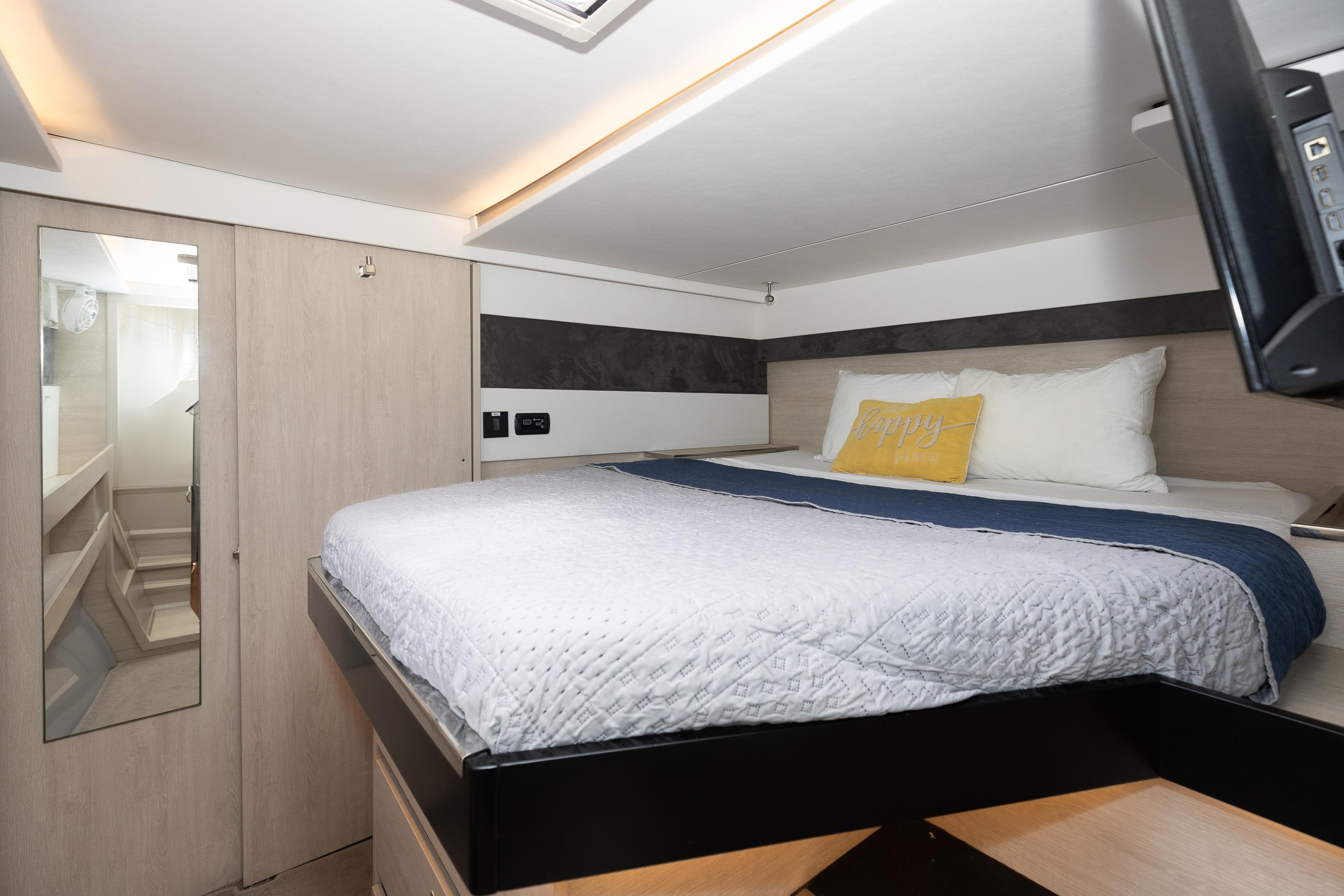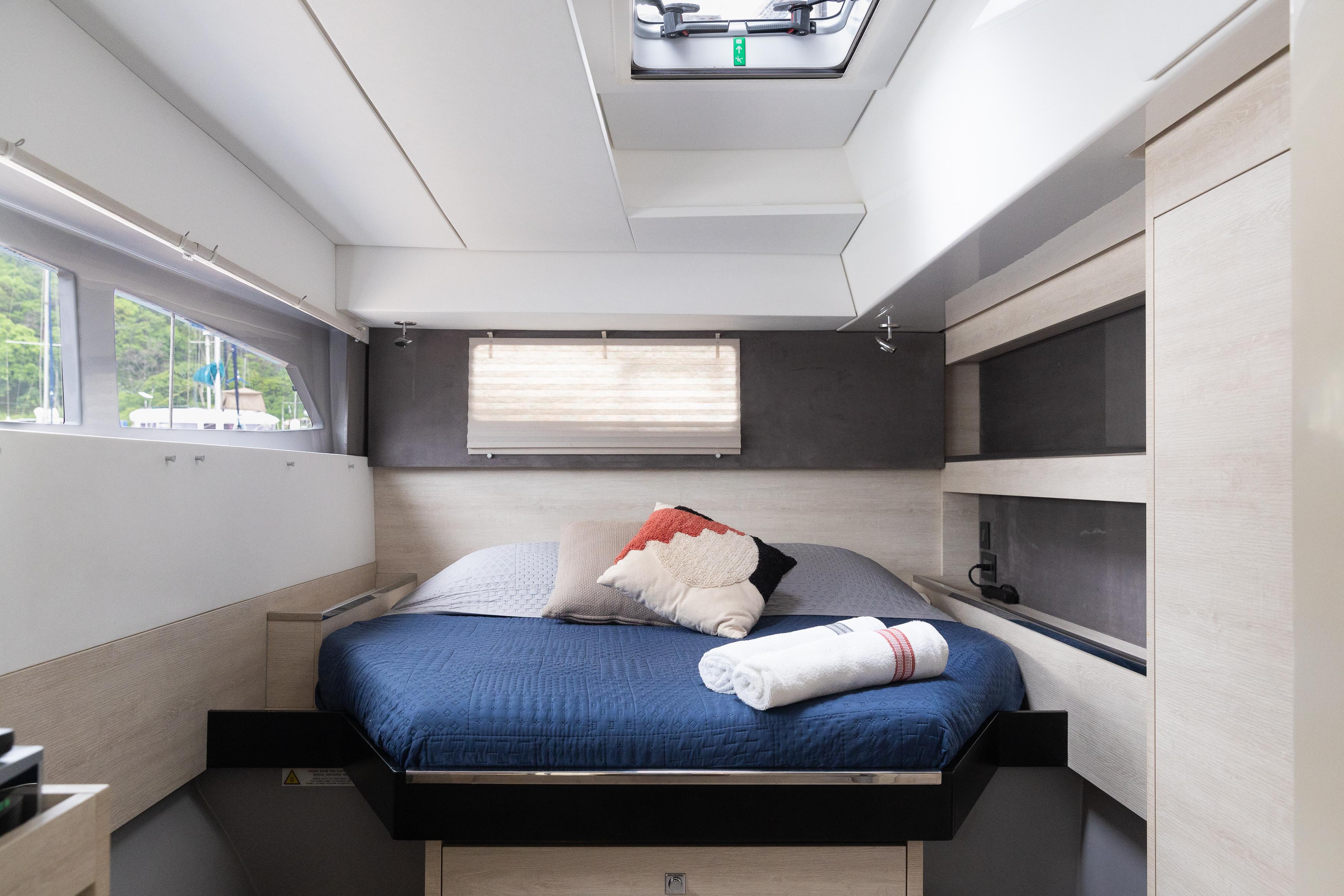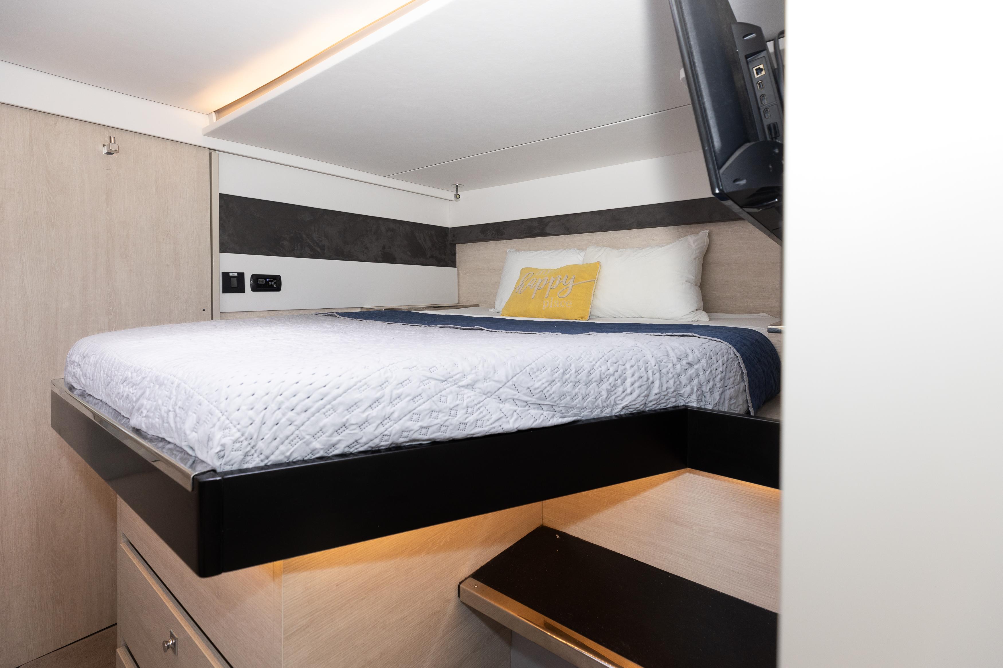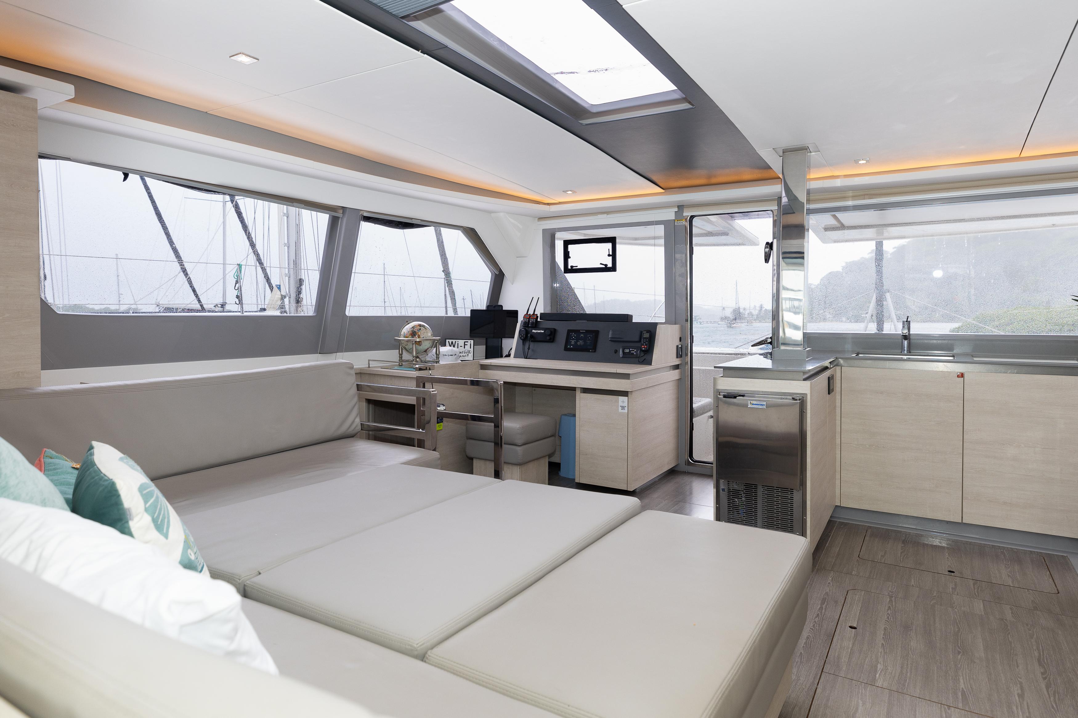 Le Leopard 50 est l’agencement idéal pour tous ceux qui recherchent plus d’espace de vie à l’extérieur car il est équipé d’un flybridge qui comprend un coin salon, une table, un bain de soleil et, en option, des haut-parleurs extérieurs et un store d’ombrage. L’accès se fait par des escaliers flottants partant du cockpit arrière. Une distinction importante par rapport aux configurations de flybridge de voiliers similaires est que lorsque le bateau est sous voiles, les passagers peuvent se déplacer sur le flybridge en bénéficiant d’un espace suffisant pour la tête et sans se soucier des interférences de la bôme. Le flybridge est également situé de manière à rester en contact avec le poste de pilotage, une caractéristique importante que l’on retrouve sur tous les catamarans Leopard.