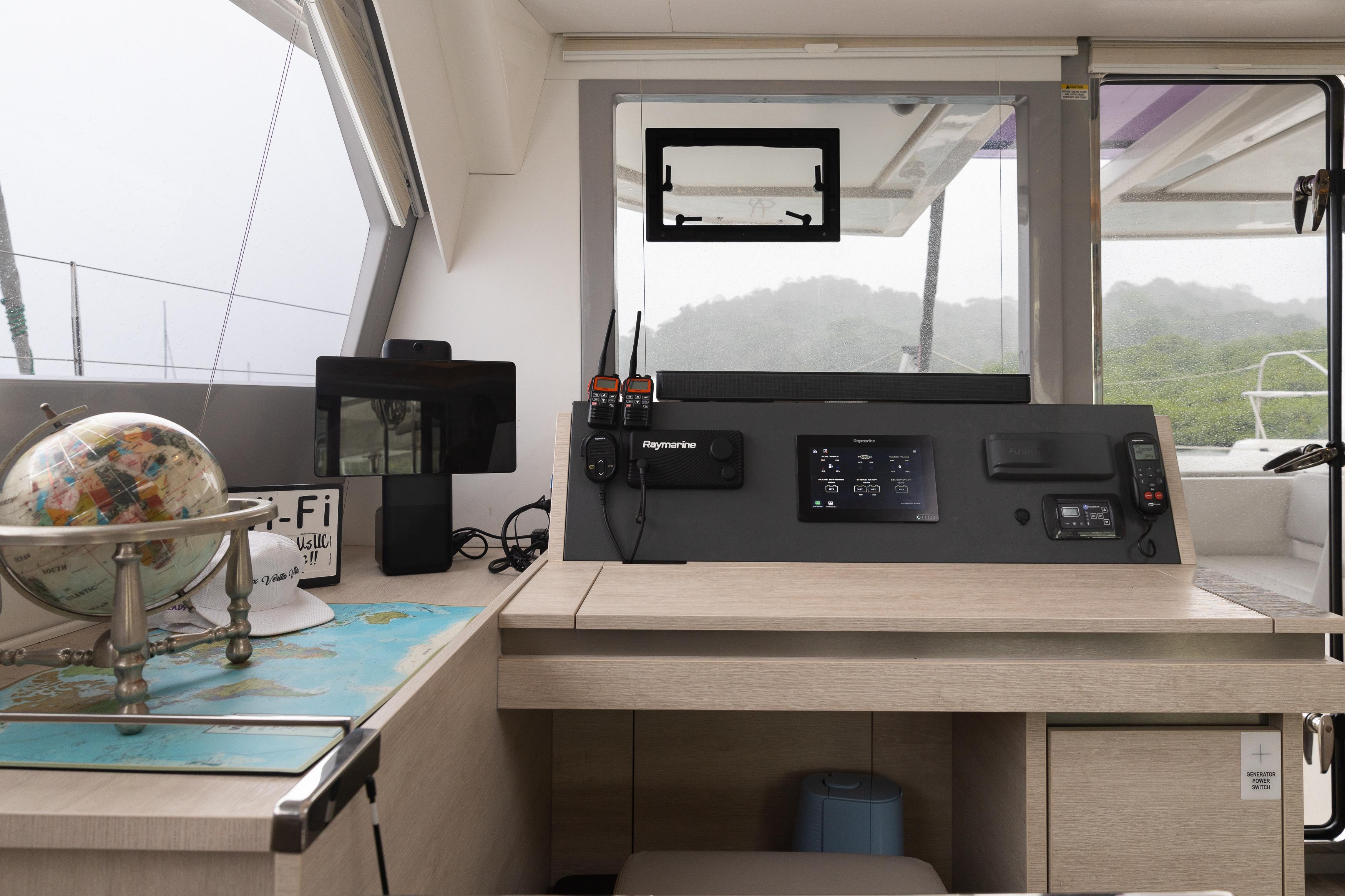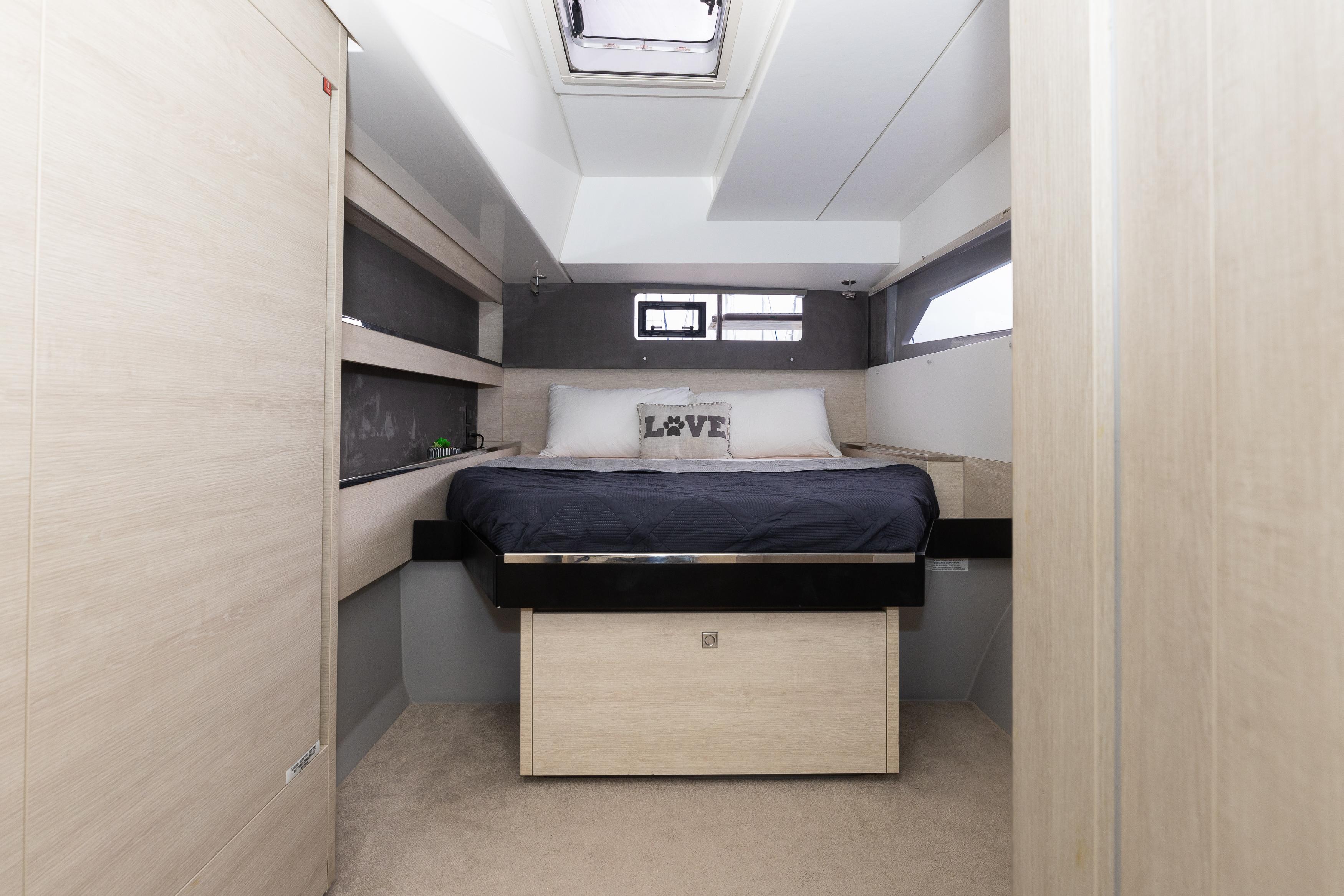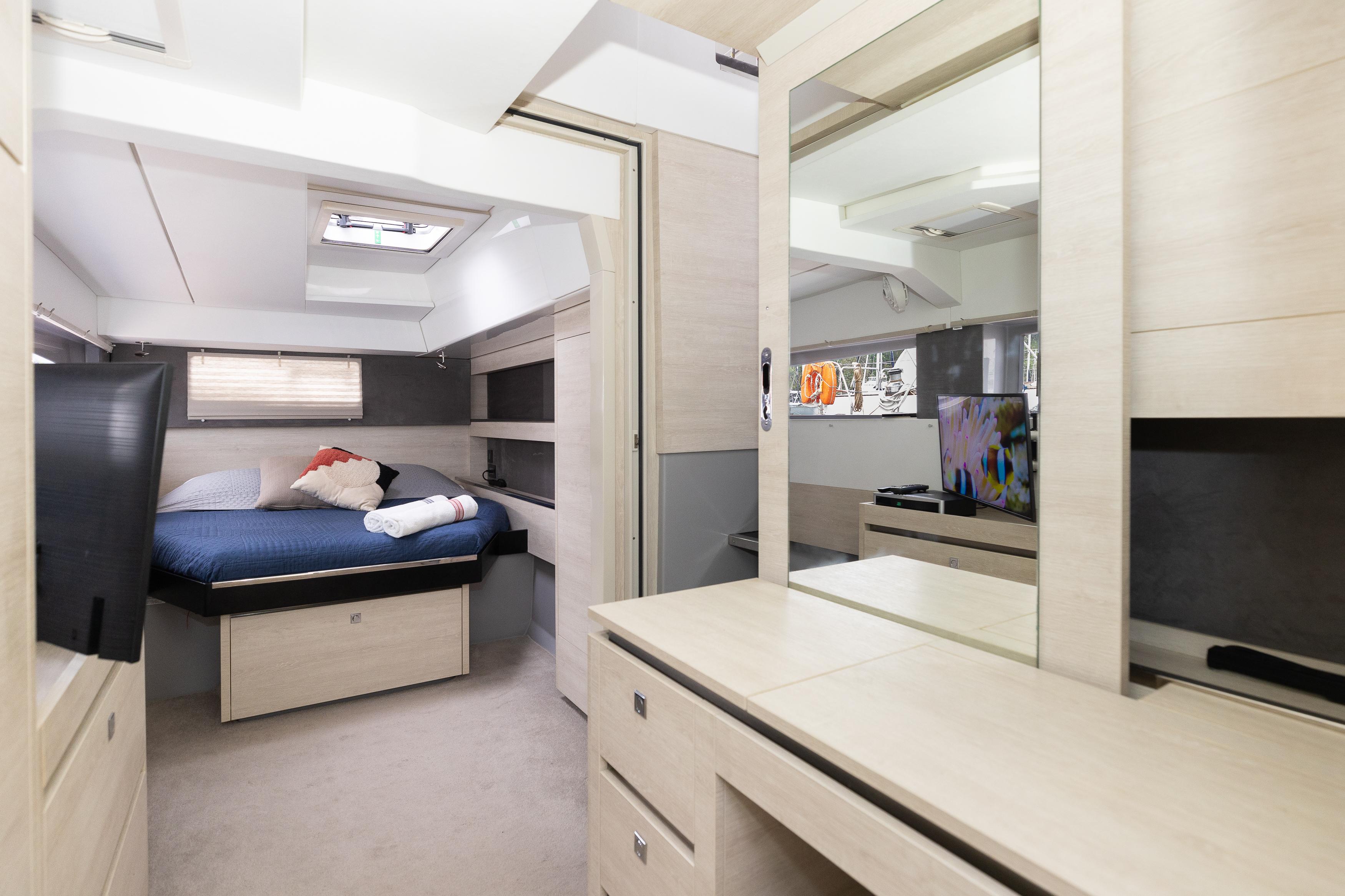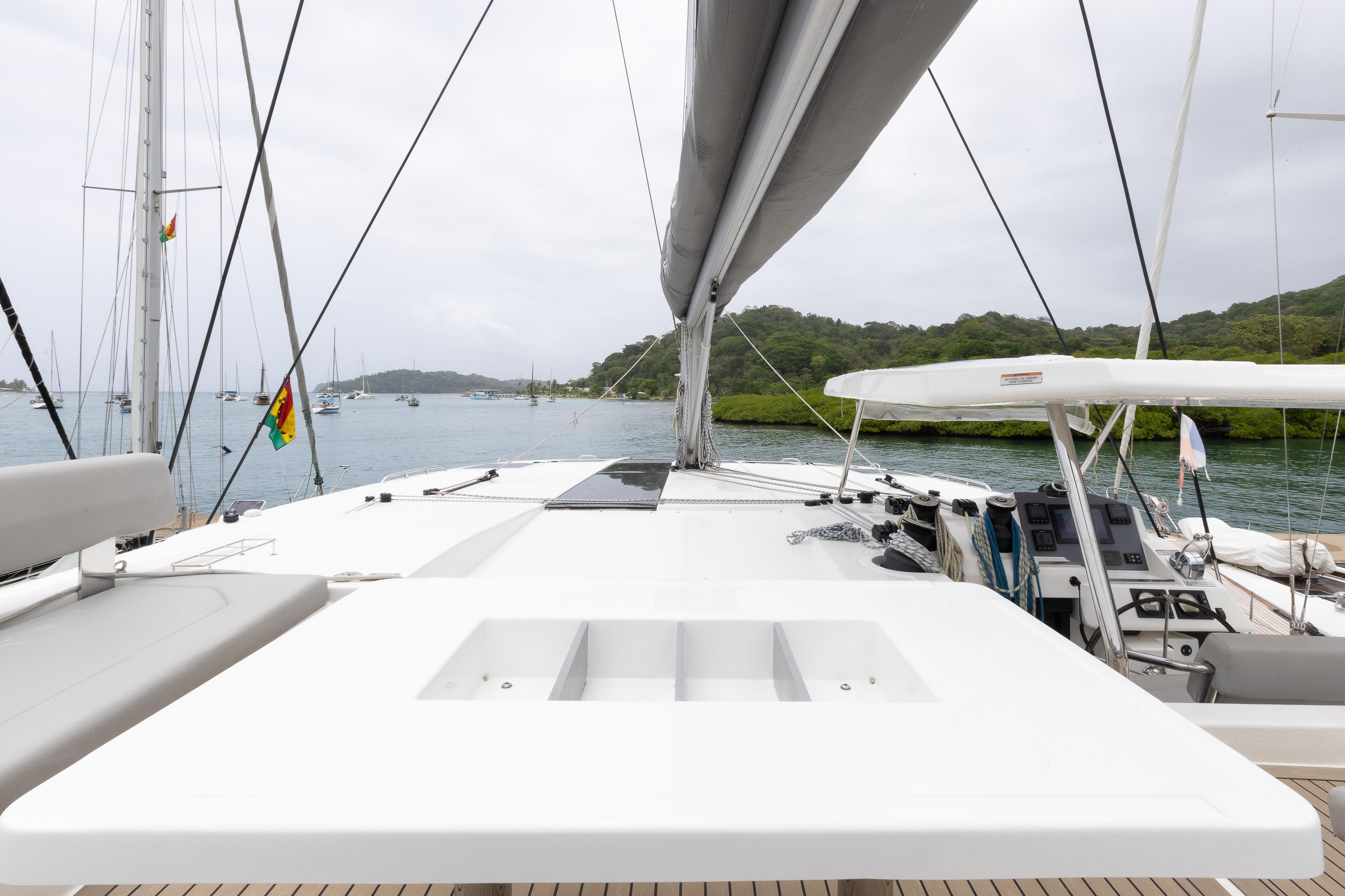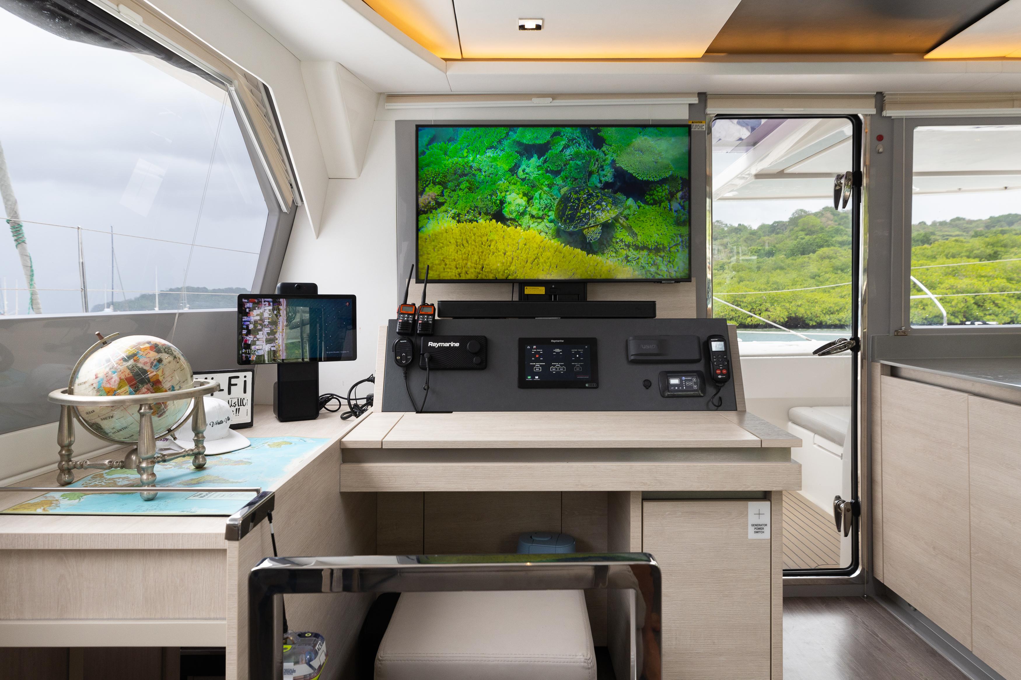 Le Leopard 50 est l’agencement idéal pour tous ceux qui recherchent plus d’espace de vie à l’extérieur car il est équipé d’un flybridge qui comprend un coin salon, une table, un bain de soleil et, en option, des haut-parleurs extérieurs et un store d’ombrage. L’accès se fait par des escaliers flottants partant du cockpit arrière. Une distinction importante par rapport aux configurations de flybridge de voiliers similaires est que lorsque le bateau est sous voiles, les passagers peuvent se déplacer sur le flybridge en bénéficiant d’un espace suffisant pour la tête et sans se soucier des interférences de la bôme. Le flybridge est également situé de manière à rester en contact avec le poste de pilotage, une caractéristique importante que l’on retrouve sur tous les catamarans Leopard.