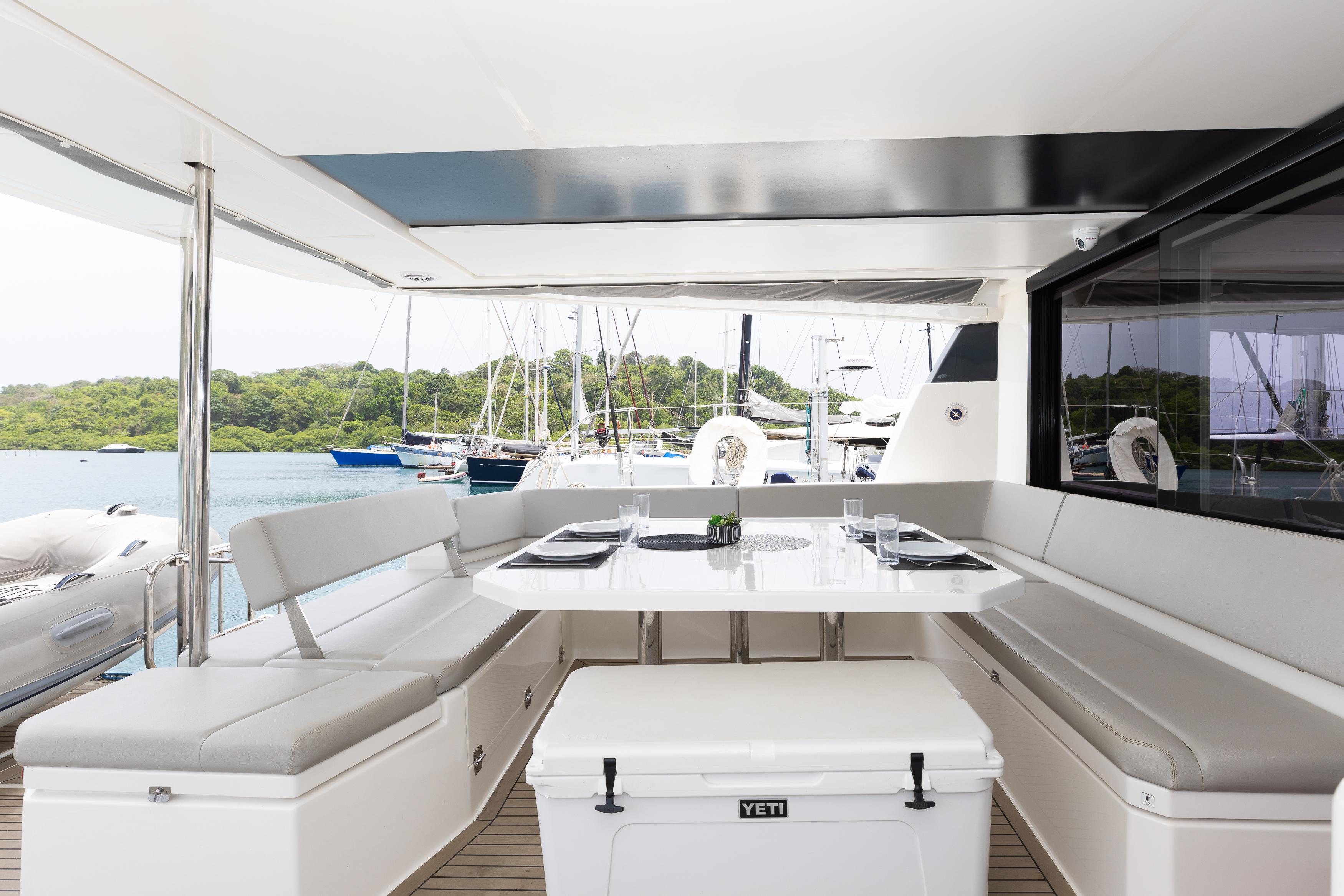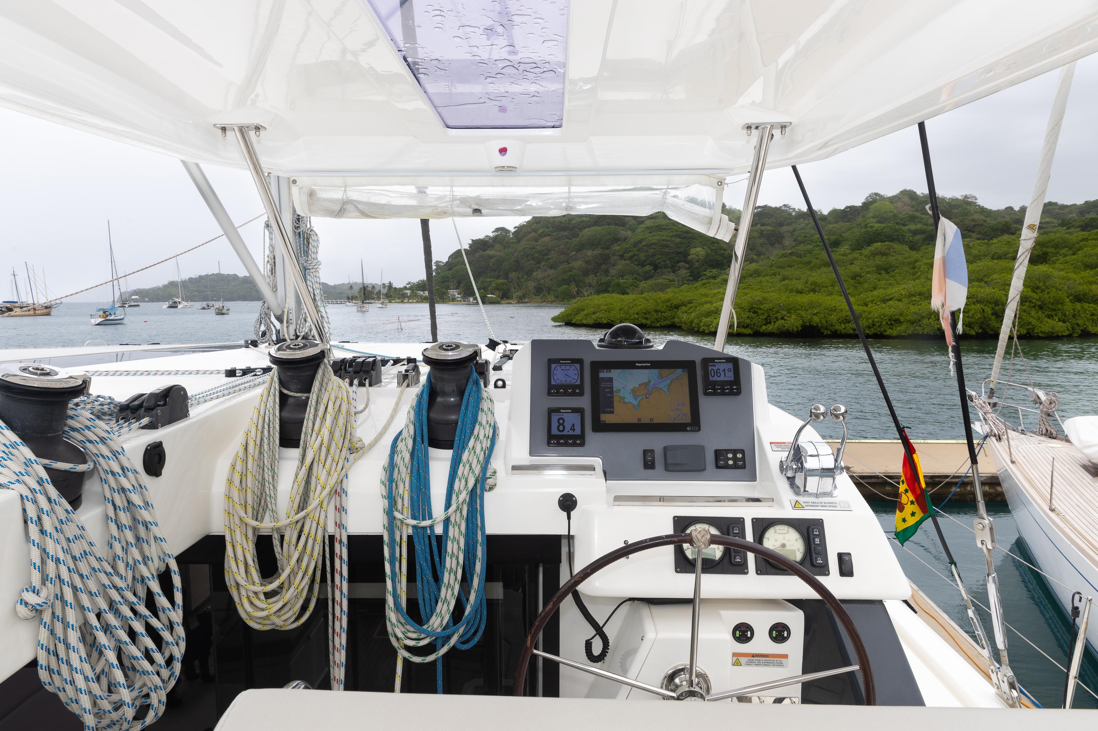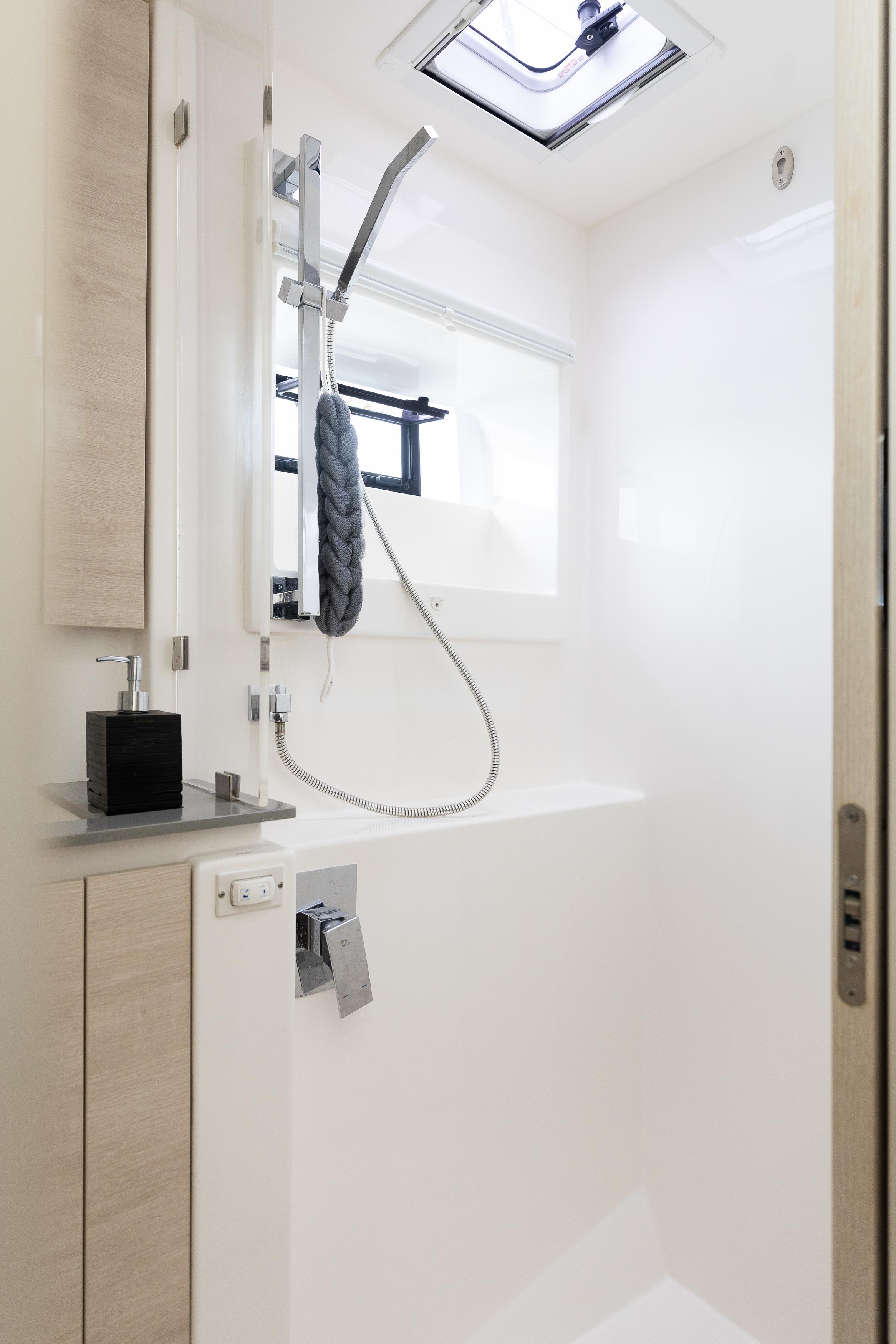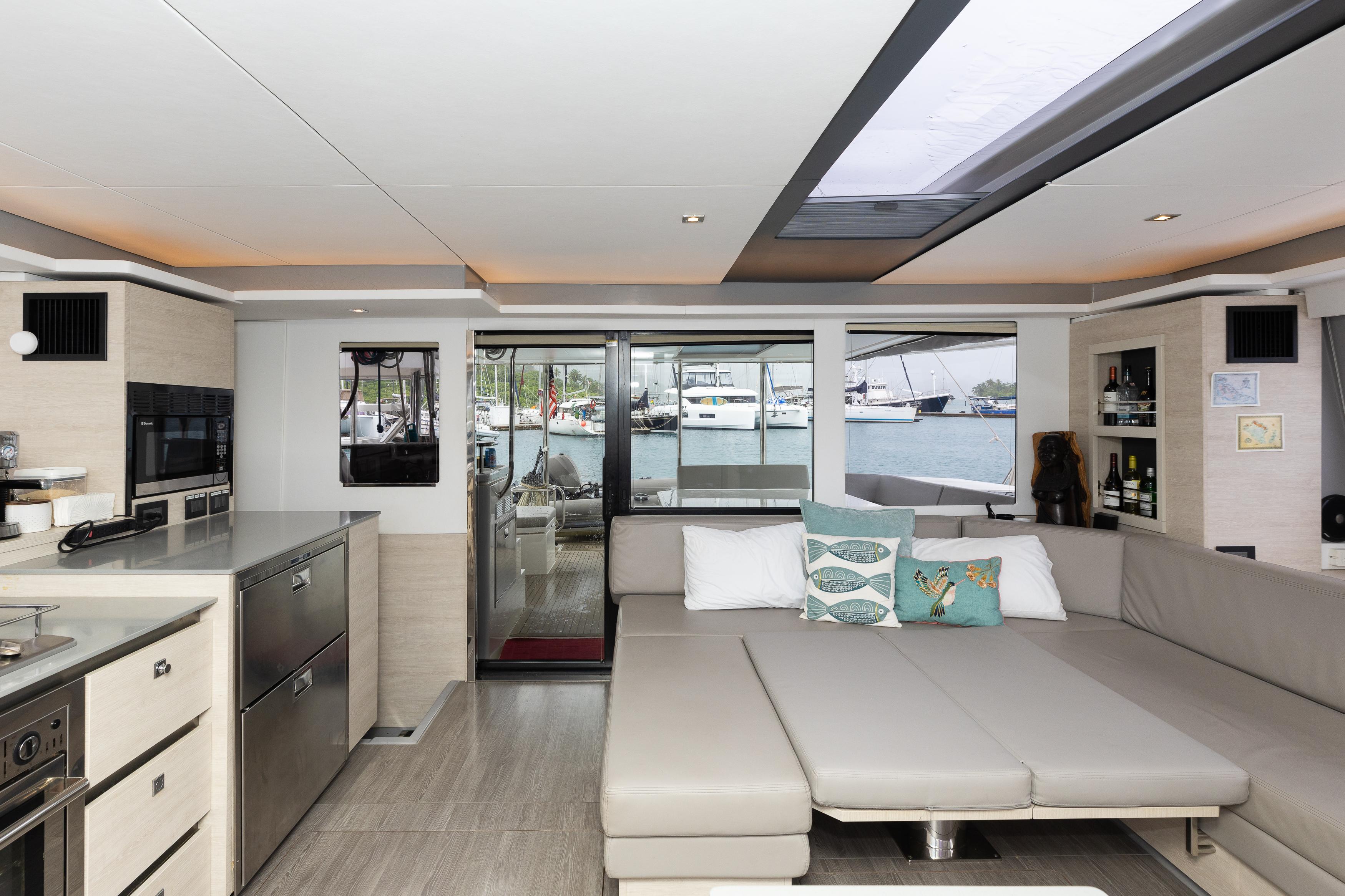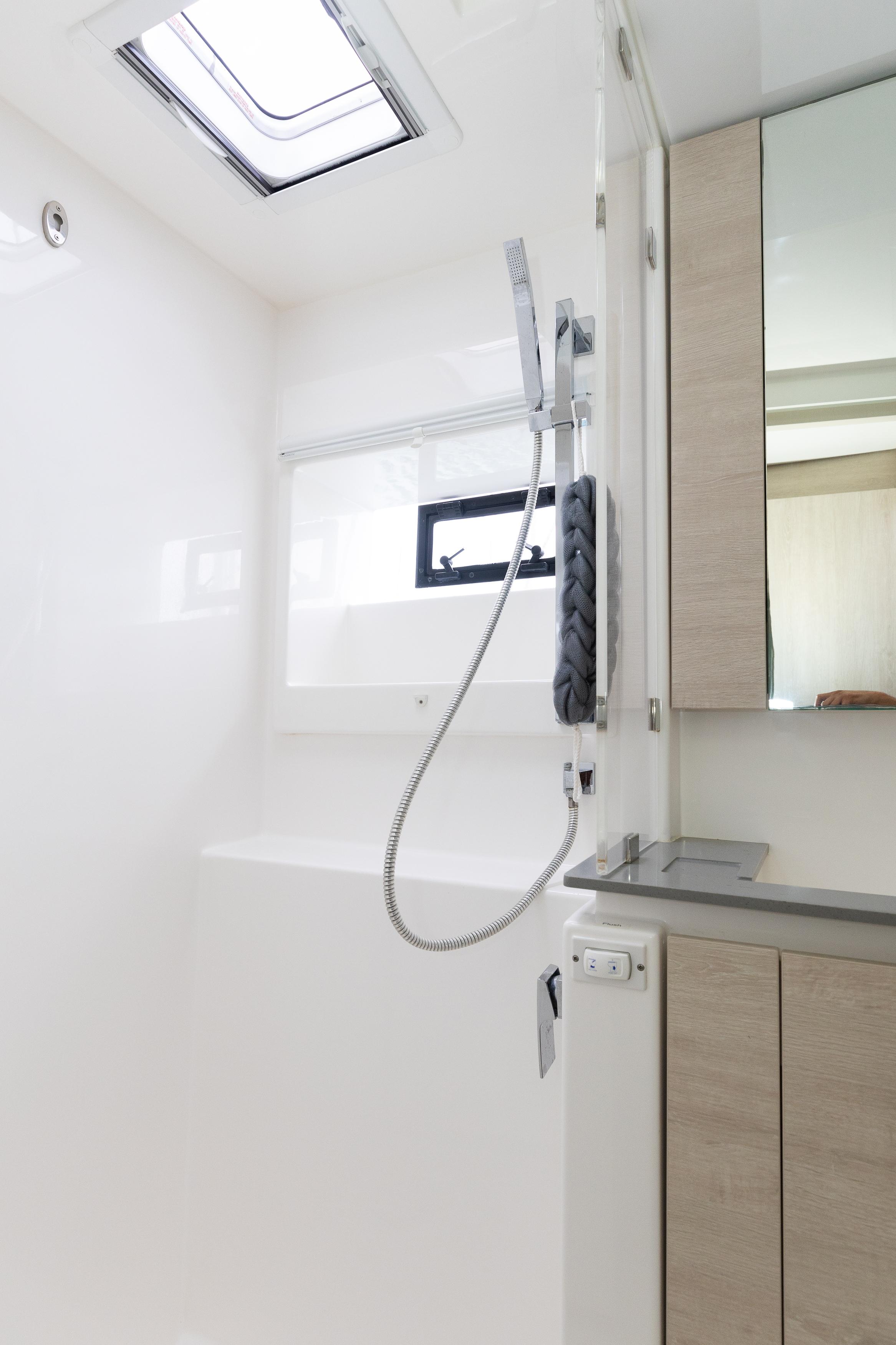 Le Leopard 50 est l’agencement idéal pour tous ceux qui recherchent plus d’espace de vie à l’extérieur car il est équipé d’un flybridge qui comprend un coin salon, une table, un bain de soleil et, en option, des haut-parleurs extérieurs et un store d’ombrage. L’accès se fait par des escaliers flottants partant du cockpit arrière. Une distinction importante par rapport aux configurations de flybridge de voiliers similaires est que lorsque le bateau est sous voiles, les passagers peuvent se déplacer sur le flybridge en bénéficiant d’un espace suffisant pour la tête et sans se soucier des interférences de la bôme. Le flybridge est également situé de manière à rester en contact avec le poste de pilotage, une caractéristique importante que l’on retrouve sur tous les catamarans Leopard.