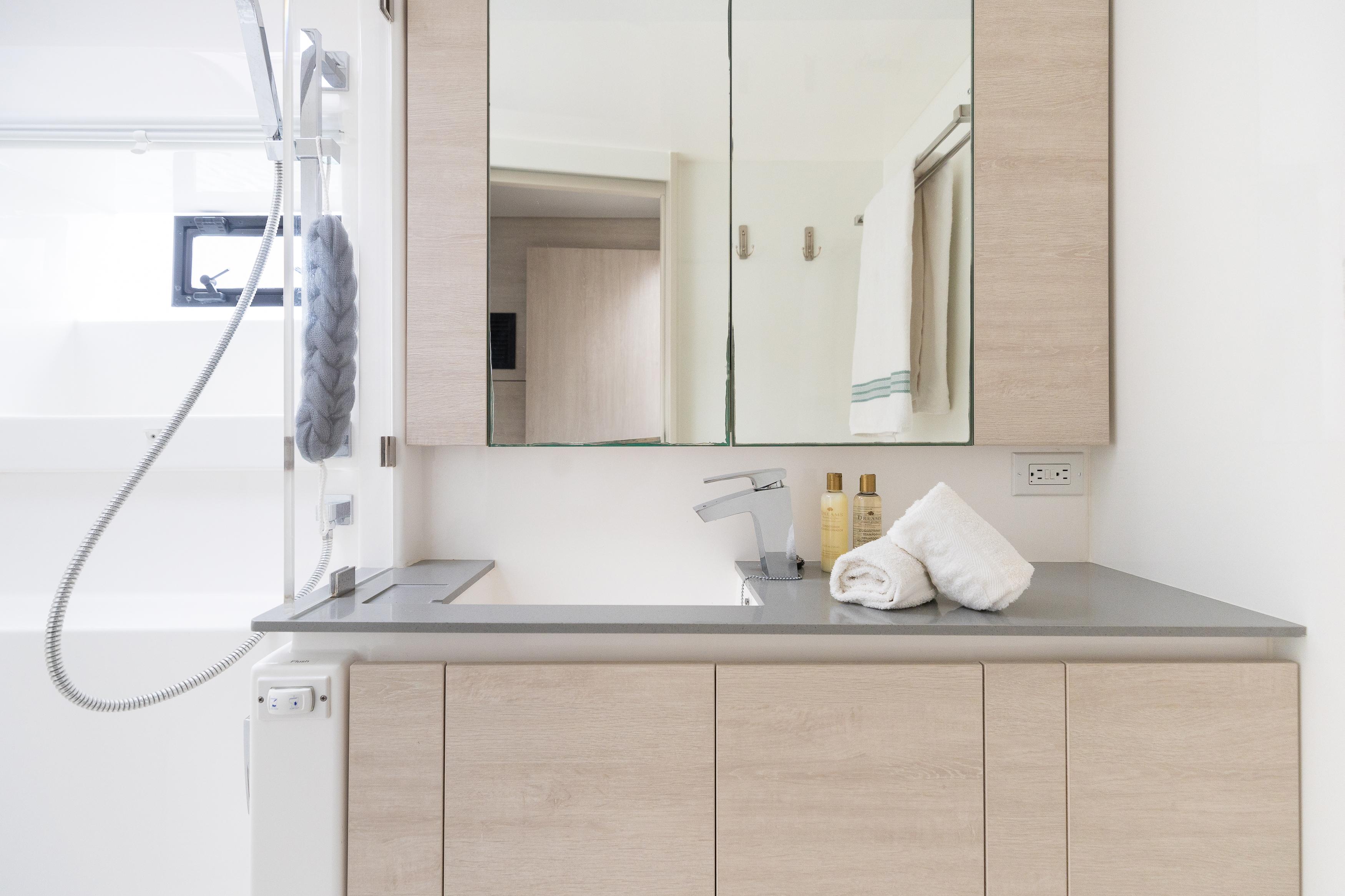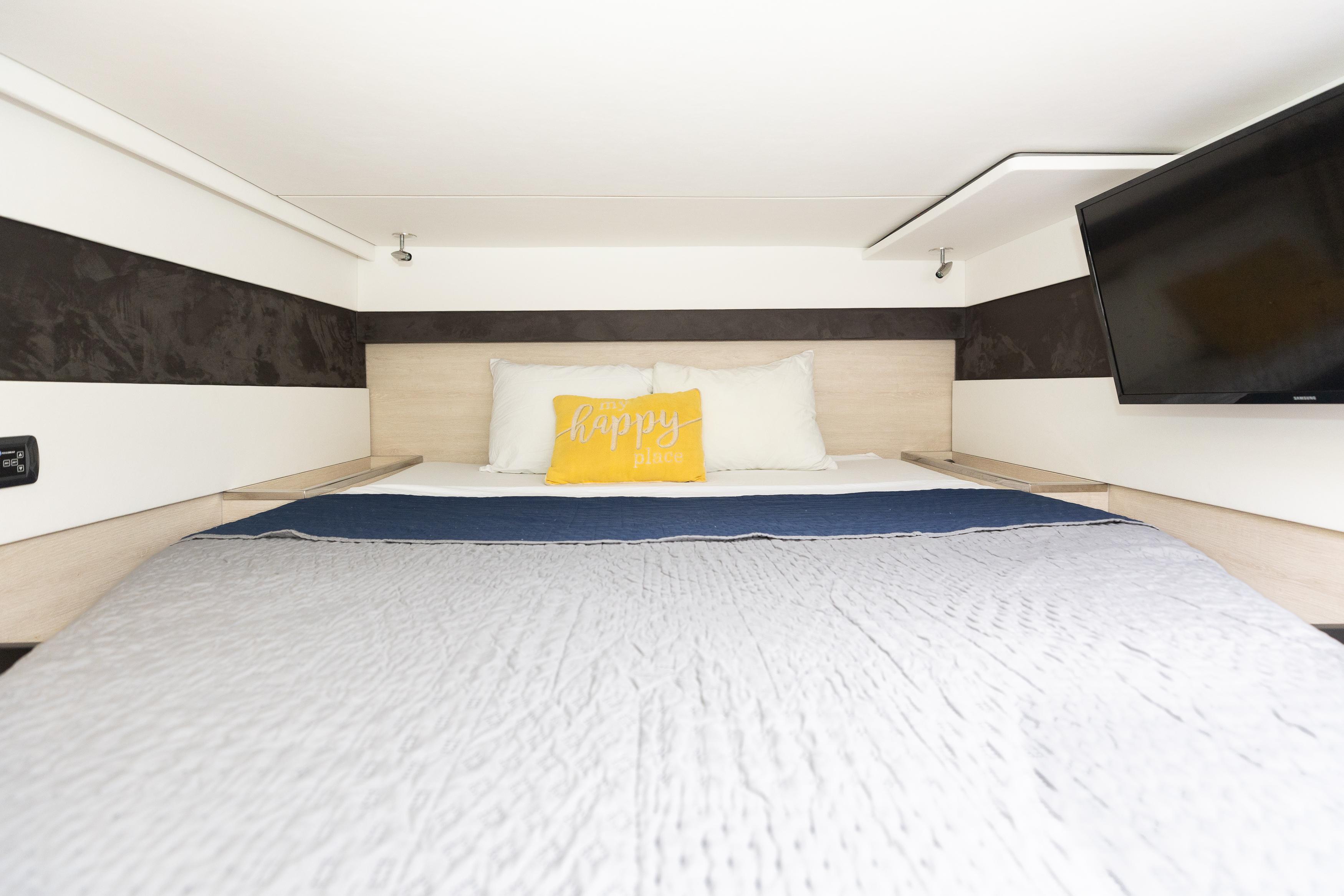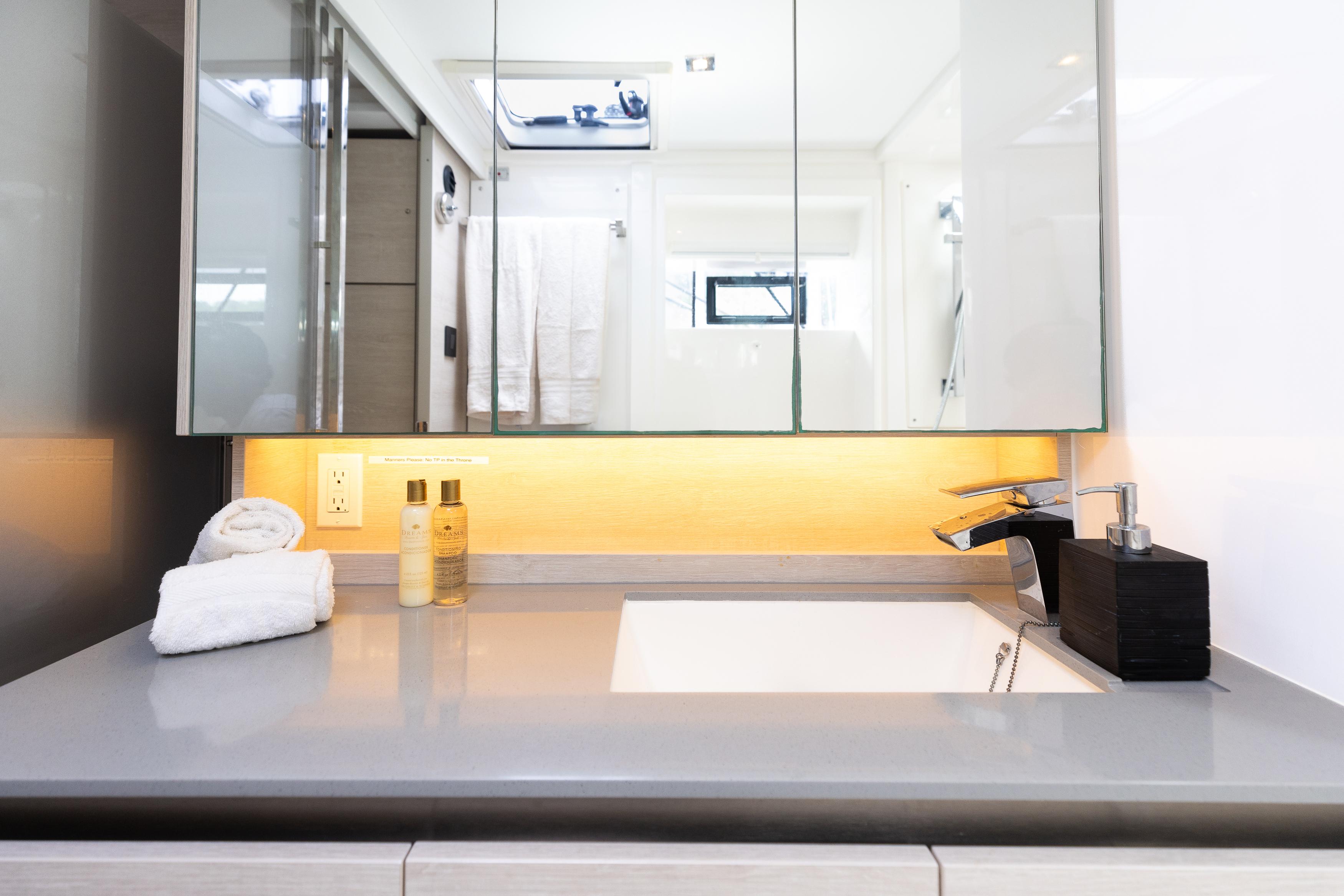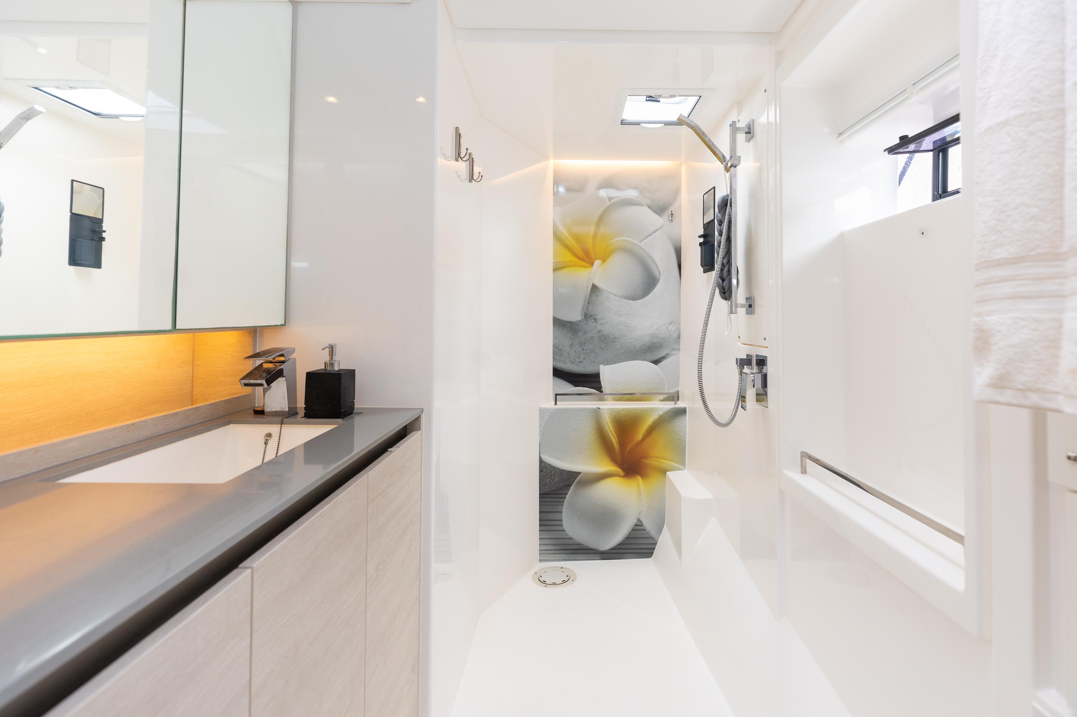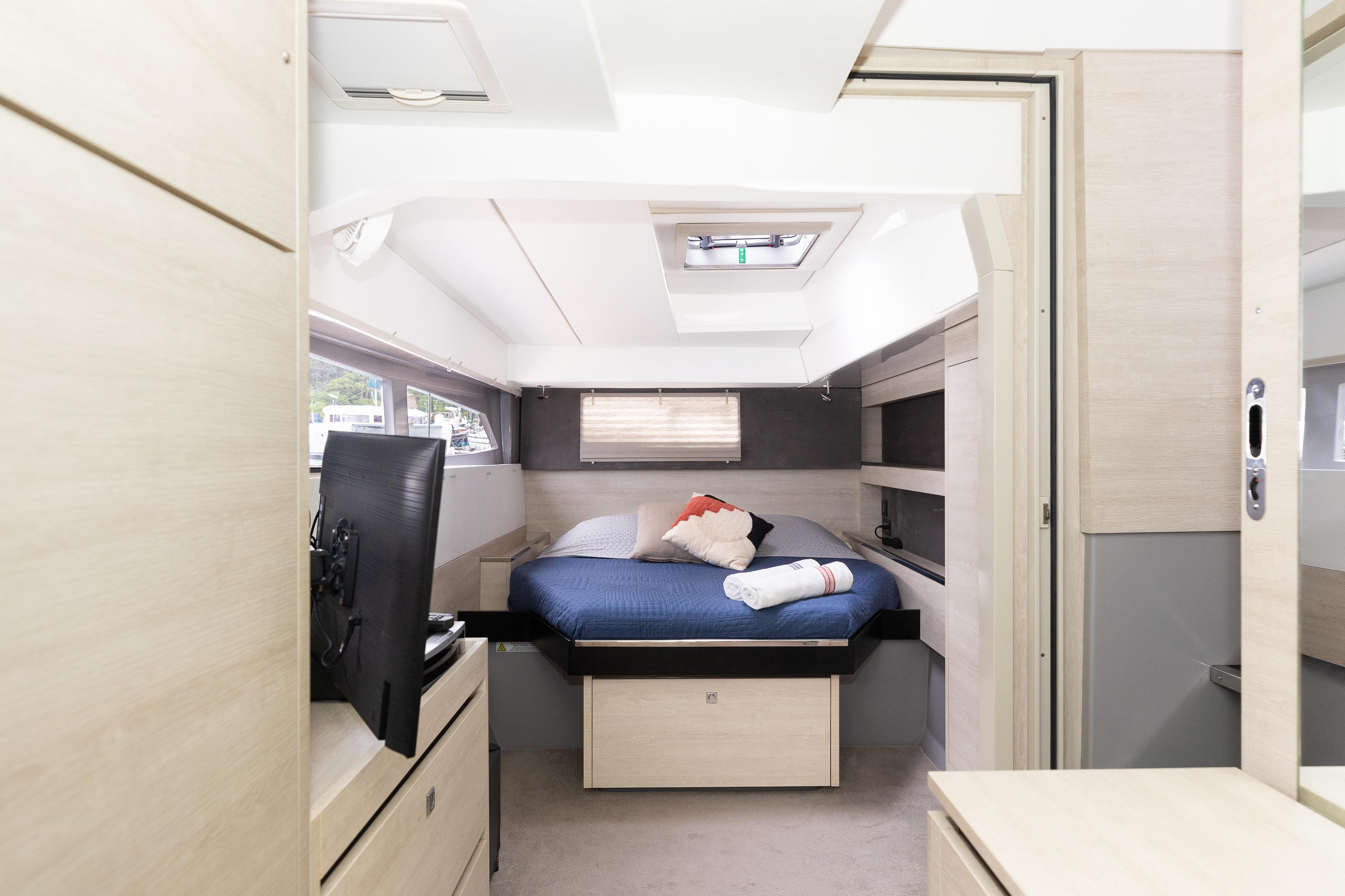 Le Leopard 50 est l’agencement idéal pour tous ceux qui recherchent plus d’espace de vie à l’extérieur car il est équipé d’un flybridge qui comprend un coin salon, une table, un bain de soleil et, en option, des haut-parleurs extérieurs et un store d’ombrage. L’accès se fait par des escaliers flottants partant du cockpit arrière. Une distinction importante par rapport aux configurations de flybridge de voiliers similaires est que lorsque le bateau est sous voiles, les passagers peuvent se déplacer sur le flybridge en bénéficiant d’un espace suffisant pour la tête et sans se soucier des interférences de la bôme. Le flybridge est également situé de manière à rester en contact avec le poste de pilotage, une caractéristique importante que l’on retrouve sur tous les catamarans Leopard.