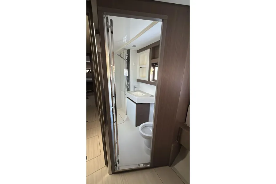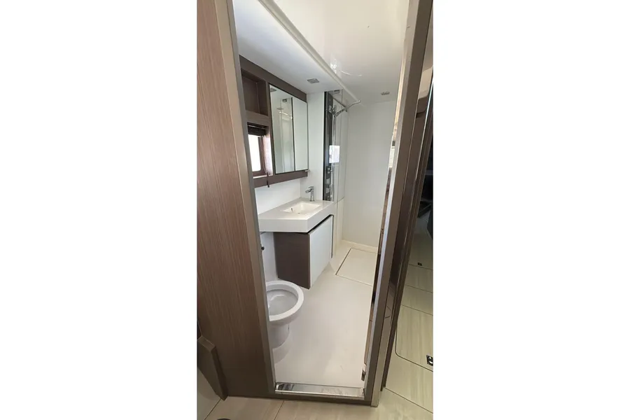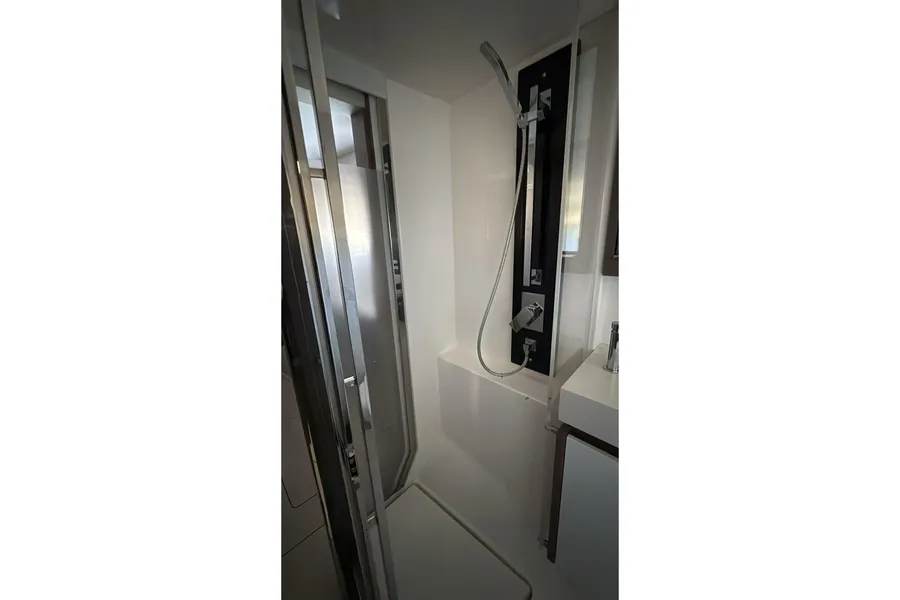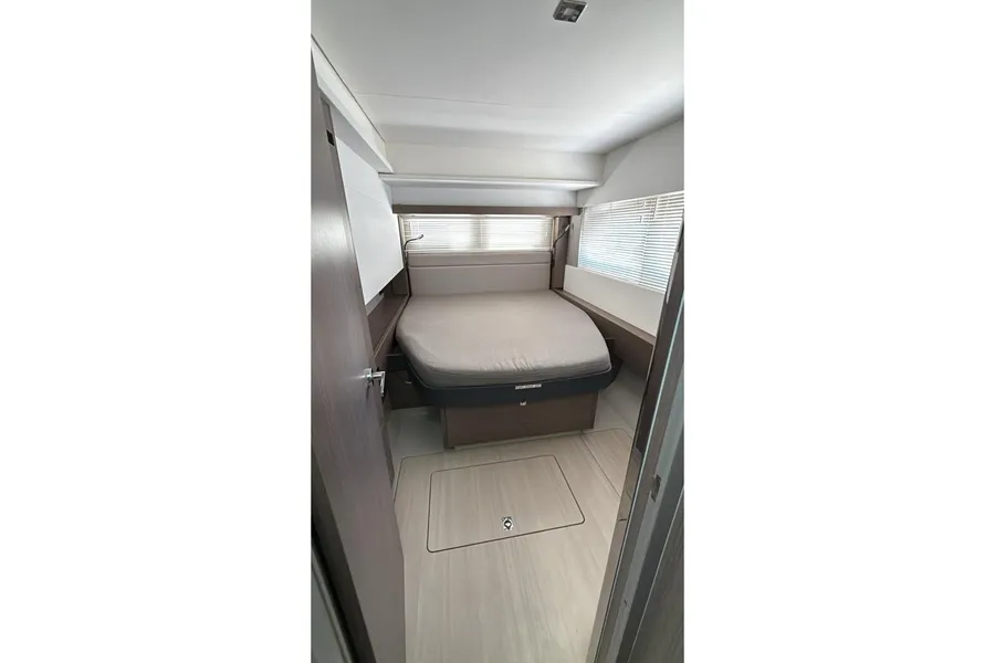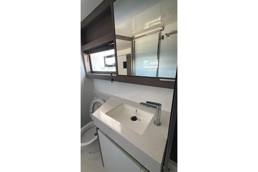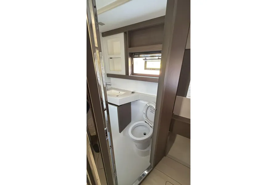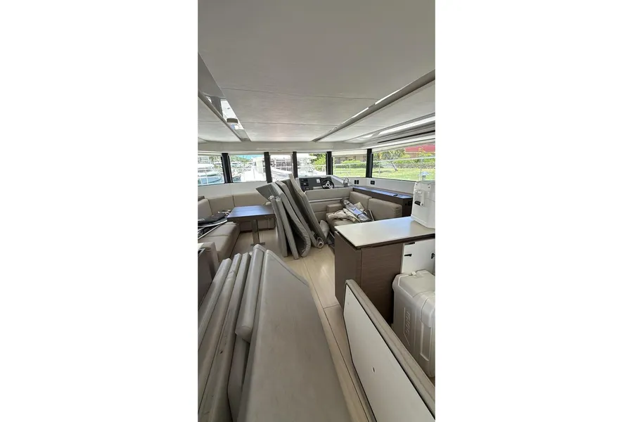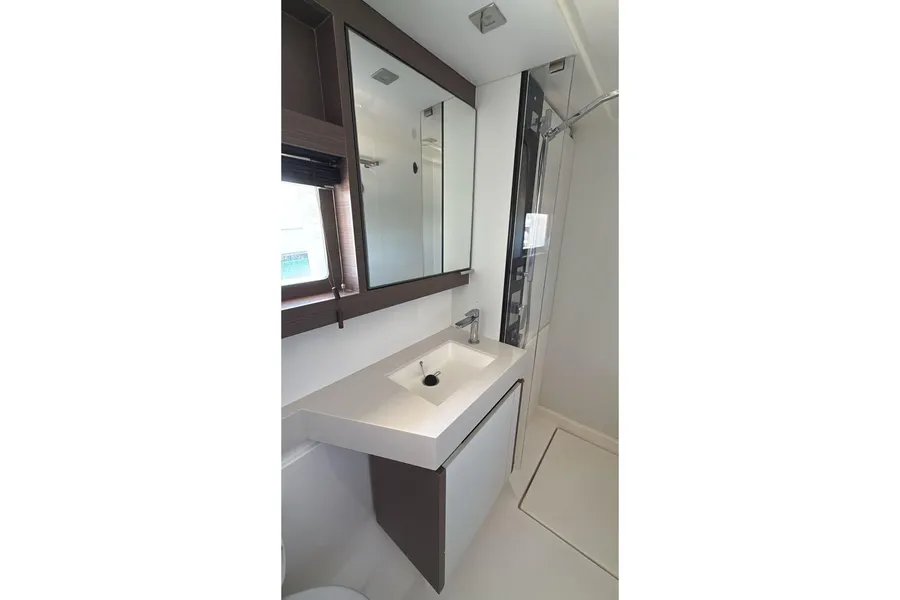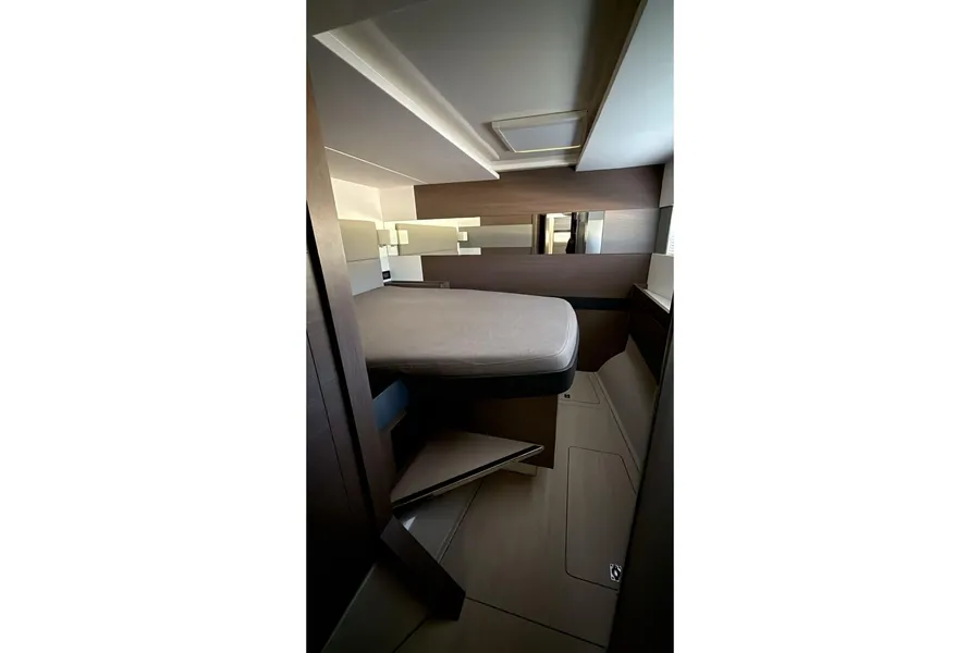 The saloon offers large, panoramic windows, an L-shaped lounge to port and a 2-person settee to starboard with an option to add an interior navigation station.  The flow is seamless with access to foredeck through the forward saloon door.