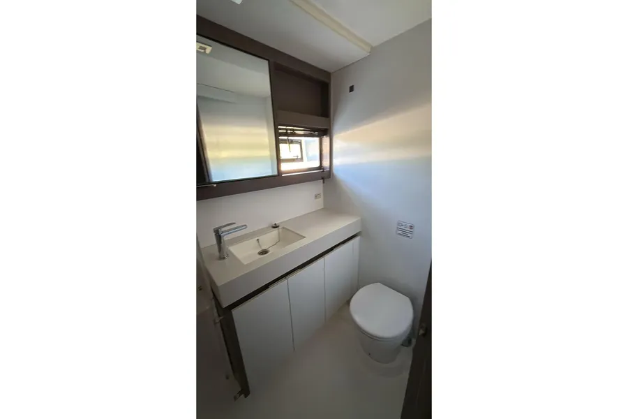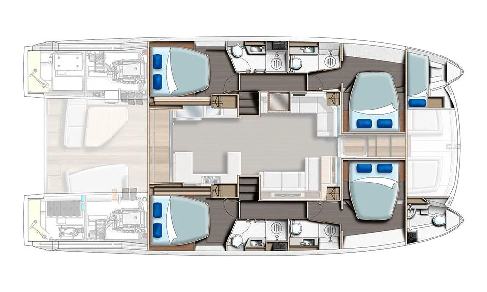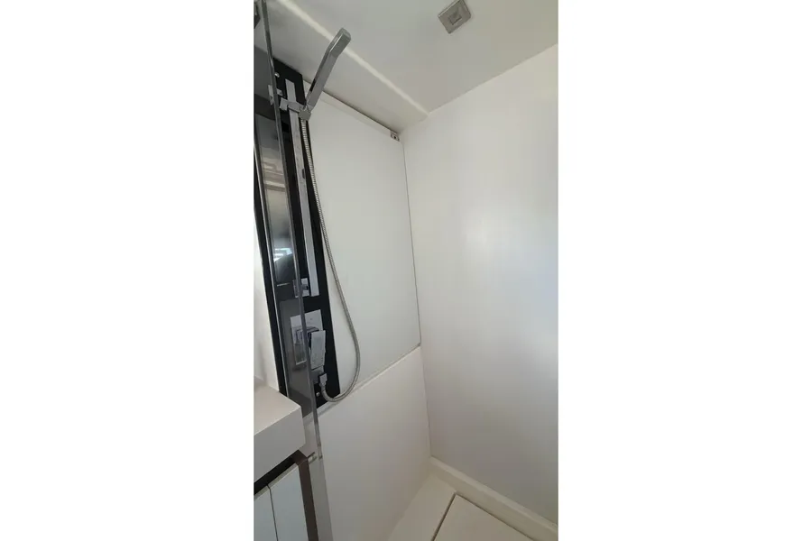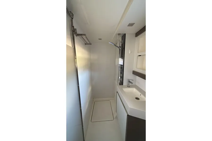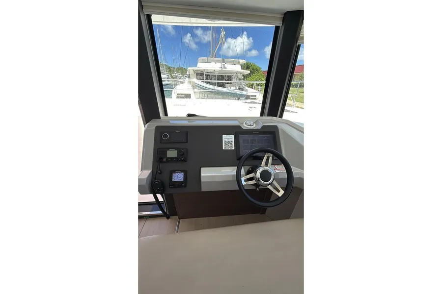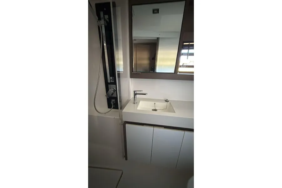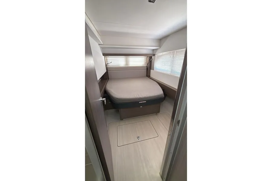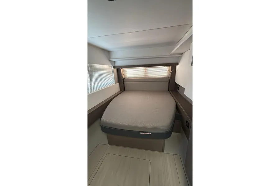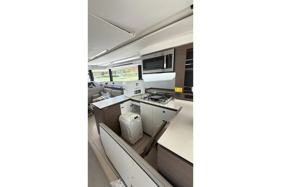 The saloon offers large, panoramic windows, an L-shaped lounge to port and a 2-person settee to starboard with an option to add an interior navigation station.  The flow is seamless with access to foredeck through the forward saloon door.