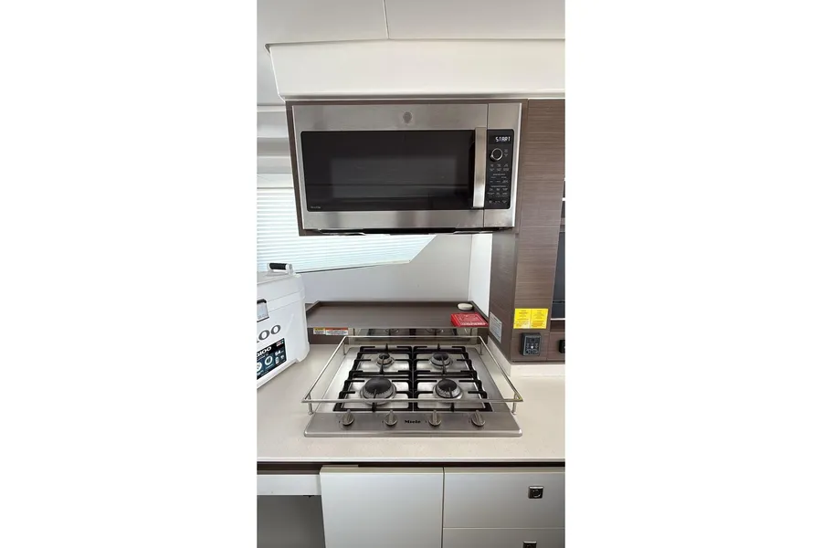 The galley is outfitted with a domestic-sized refrigerator/freezer, Staron® worktop surfaces, 4-burner stove, microwave oven, sink and faucet, and ample amounts of storage.