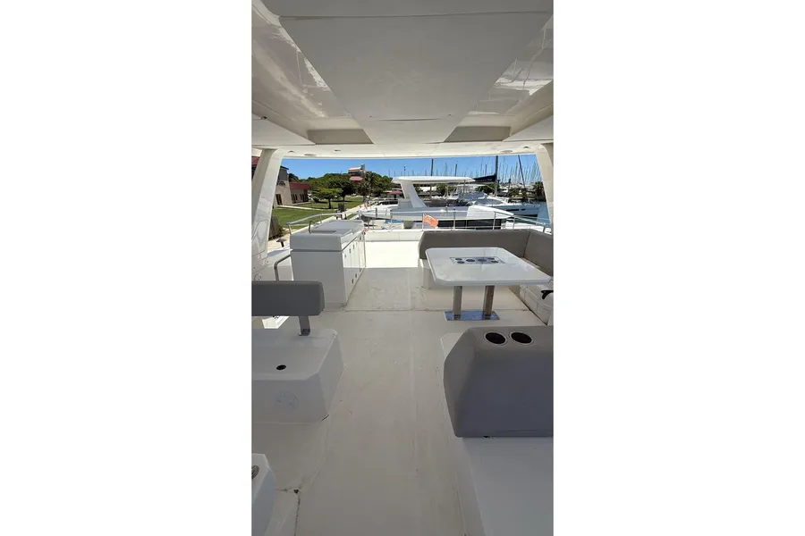 The flybridge provides a well-thought-out helm station with great visibility. Spacious seating and a large table allow for a great place to entertain family and friends and enjoy a meal with spectacular views.