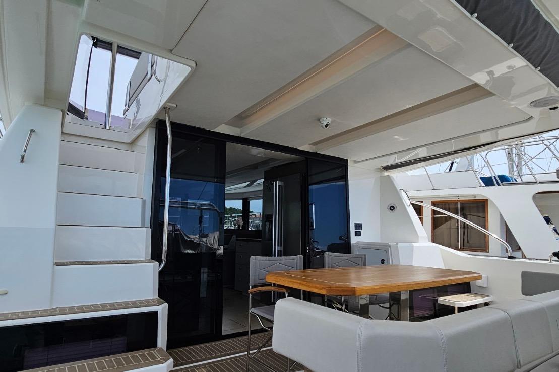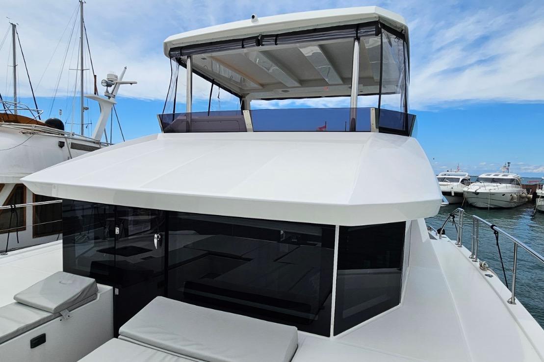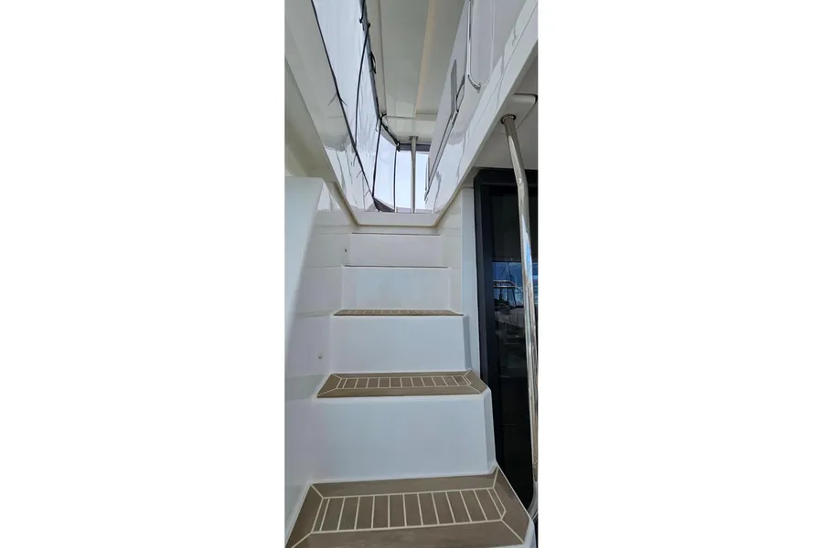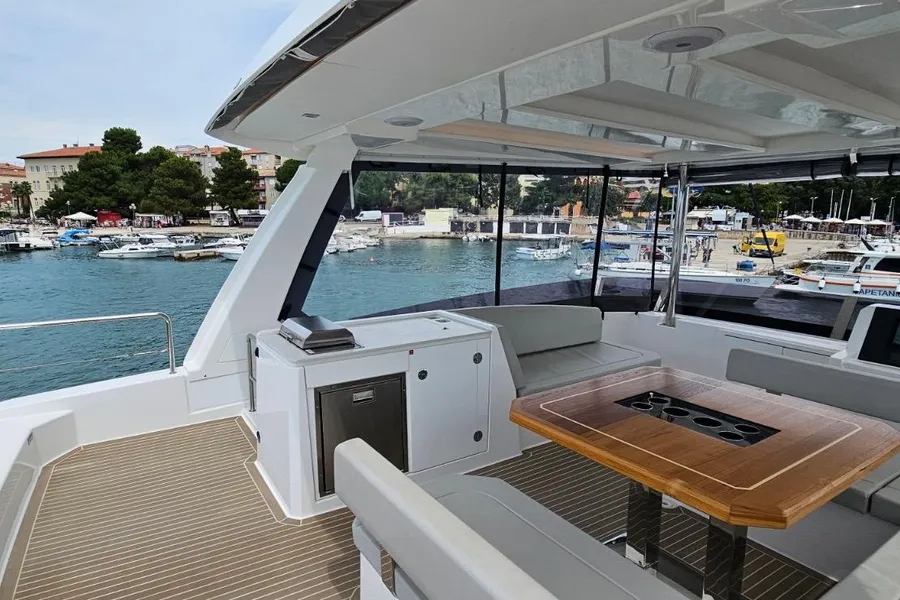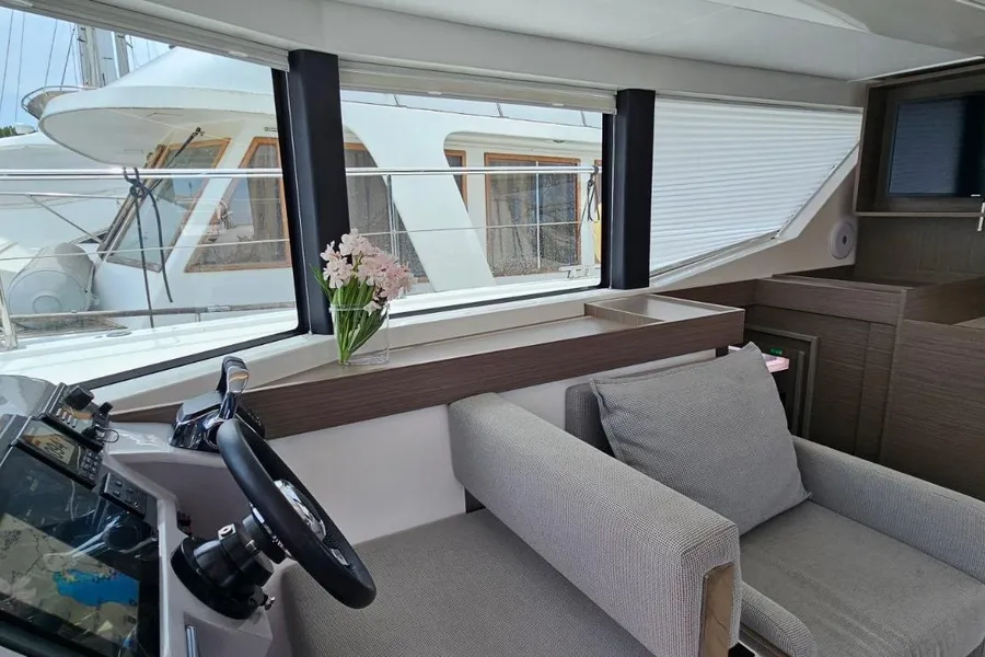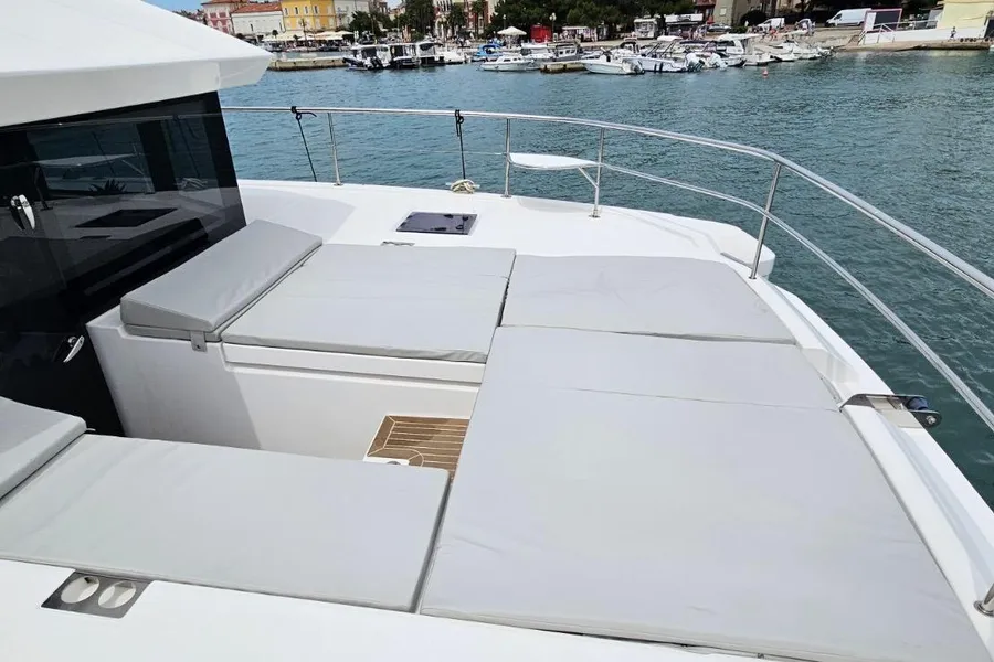 The Leopard 40PC features a spacious flybridge, the largest ever seen on a 40-foot vessel, as well as multiple outside spaces including an aft cockpit, flybridge, aft decks, and sunbathing areas. Inside, the L-shaped galley is fully equipped for gourmet cruising, with high-quality finishes providing a luxurious feel. The vessel offers 360-degree visibility, allowing for stunning panoramic views, and boasts 3 cabins each with generous island beds and 2 heads with separate showers. The engine rooms are easily accessible from the outside.