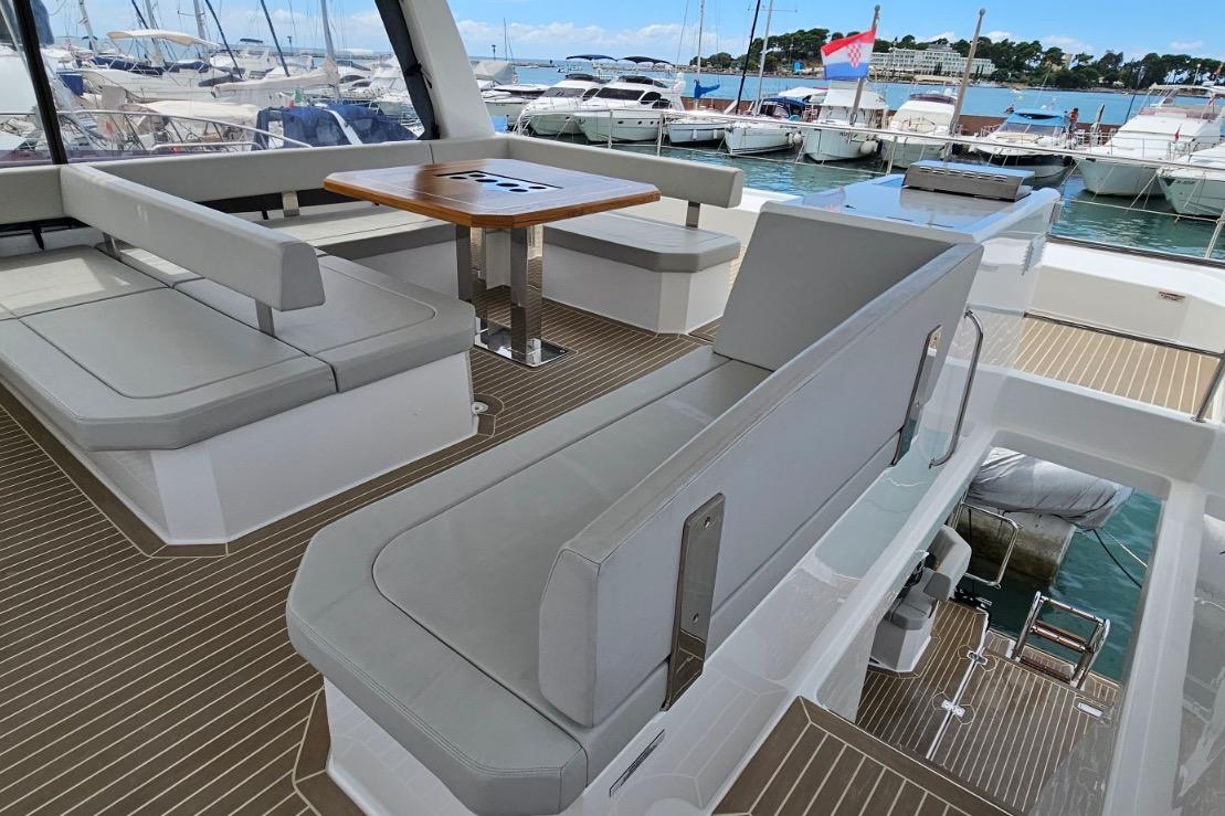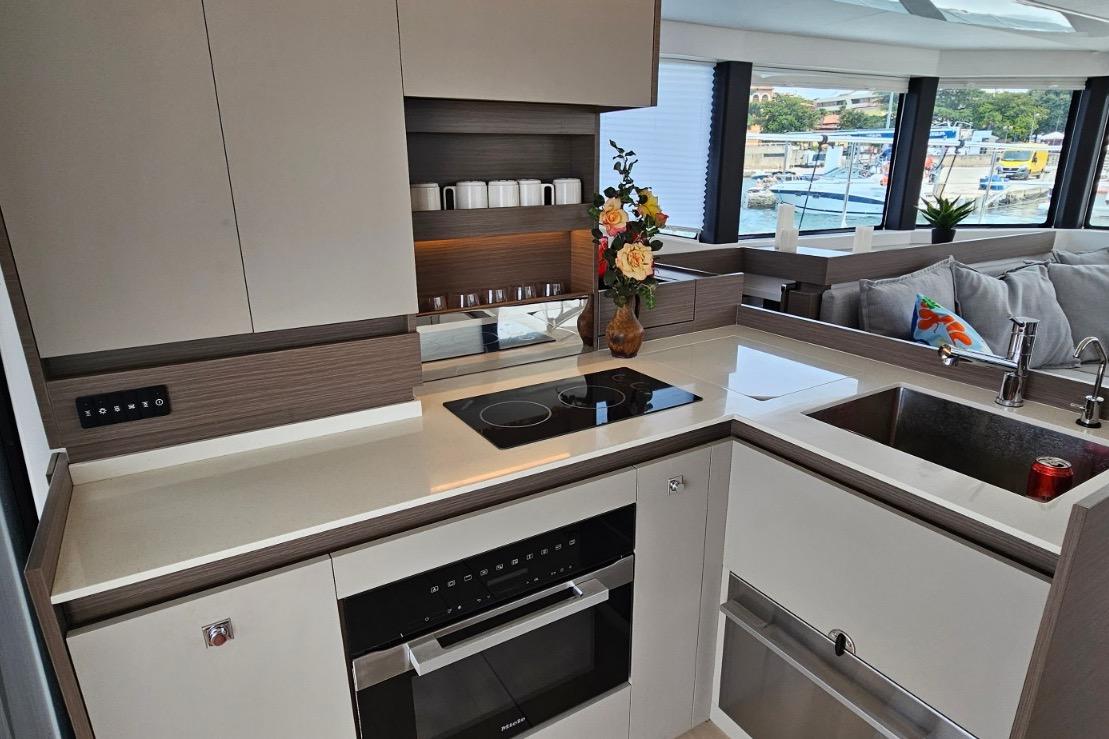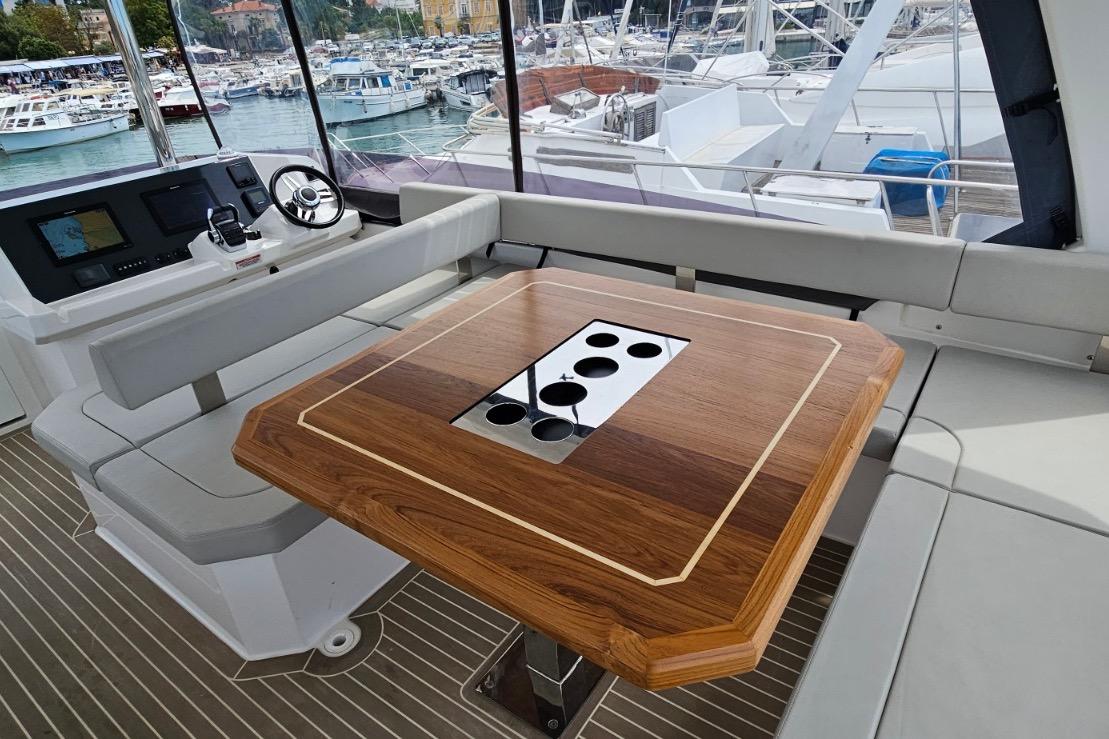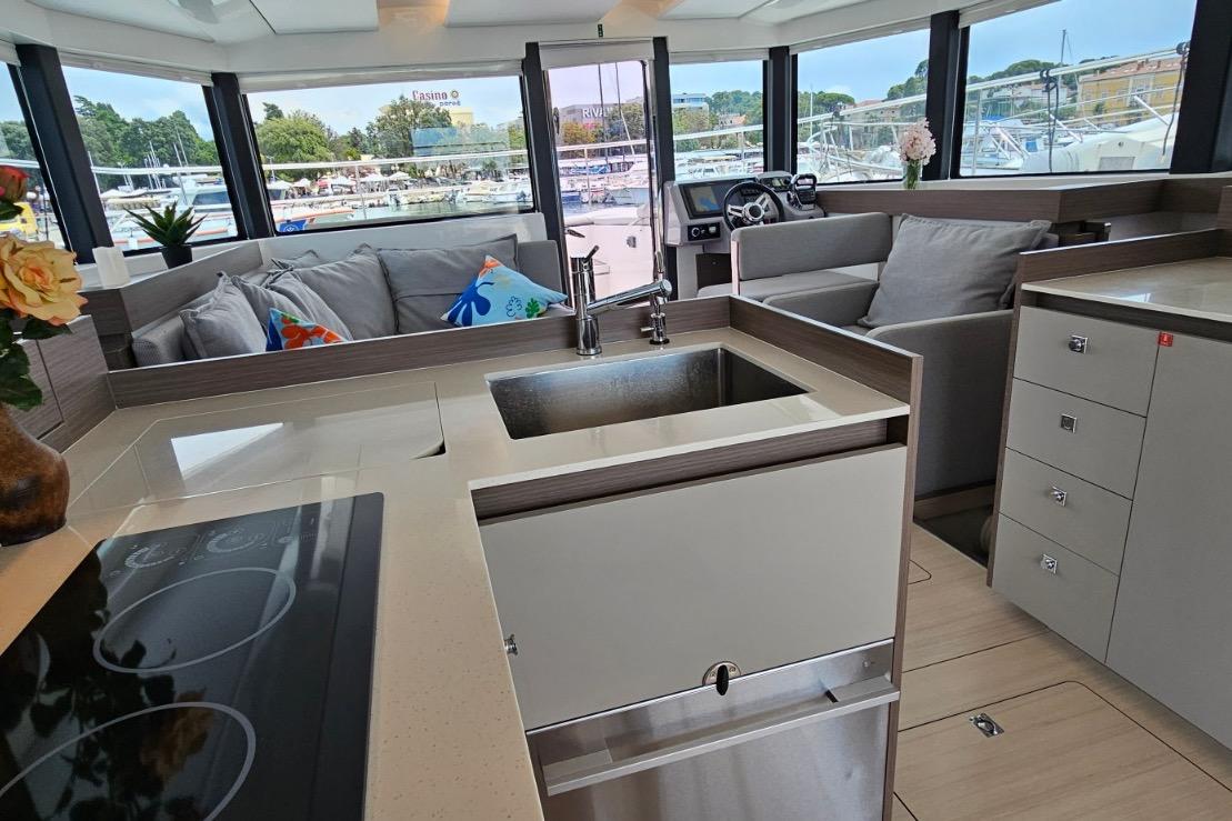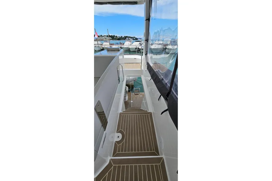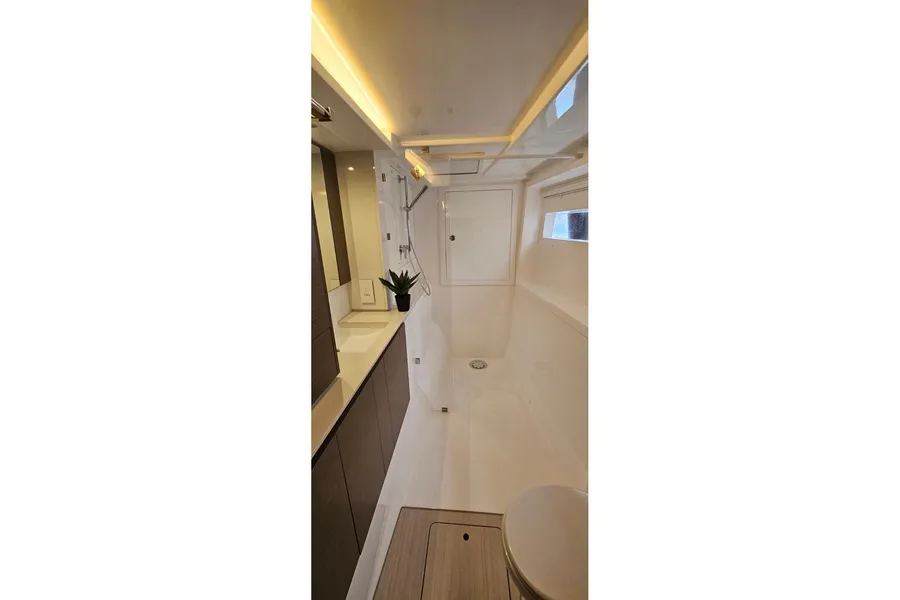 The Leopard 40PC features a spacious flybridge, the largest ever seen on a 40-foot vessel, as well as multiple outside spaces including an aft cockpit, flybridge, aft decks, and sunbathing areas. Inside, the L-shaped galley is fully equipped for gourmet cruising, with high-quality finishes providing a luxurious feel. The vessel offers 360-degree visibility, allowing for stunning panoramic views, and boasts 3 cabins each with generous island beds and 2 heads with separate showers. The engine rooms are easily accessible from the outside.