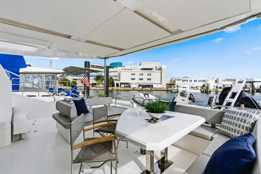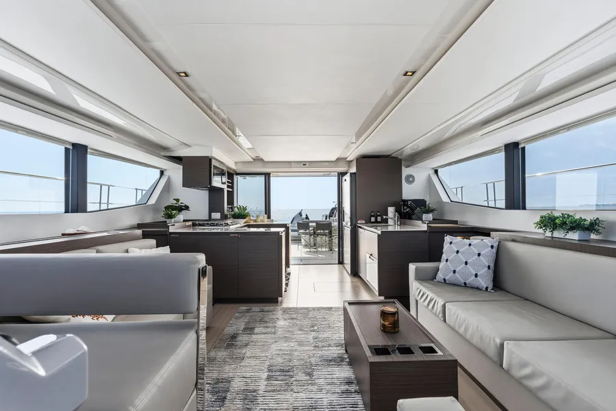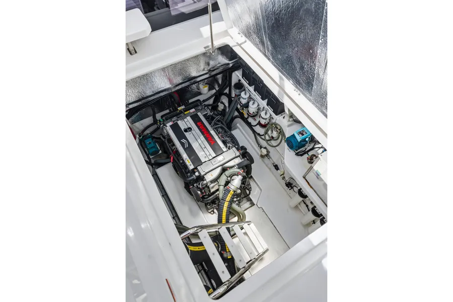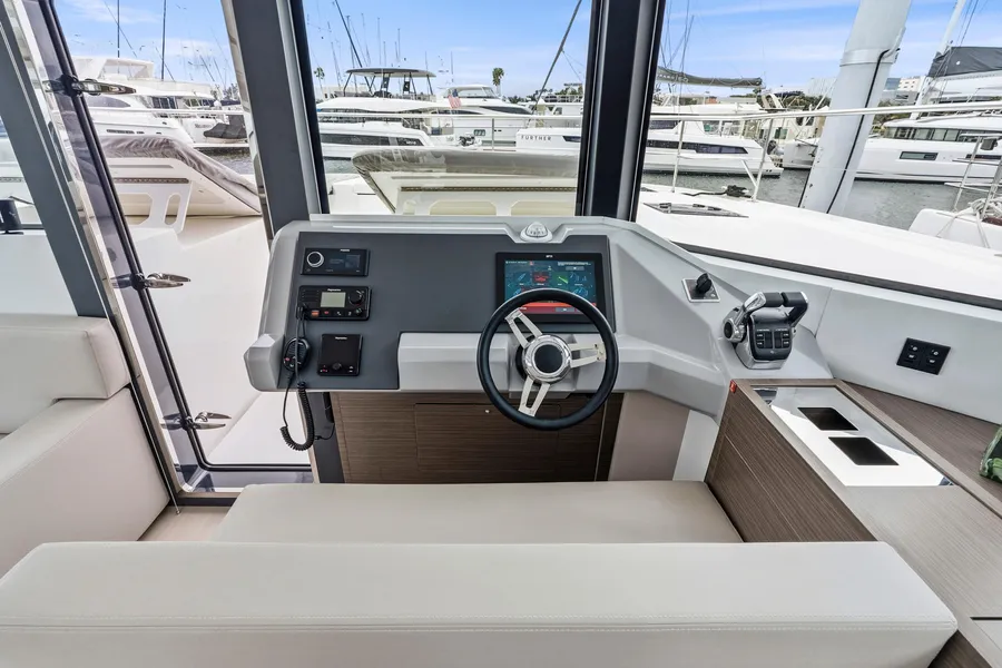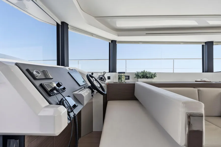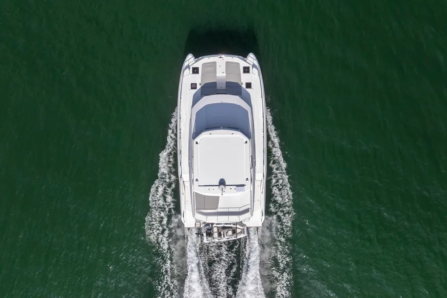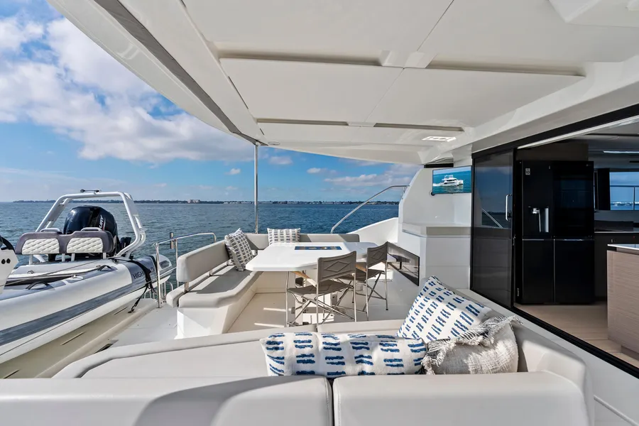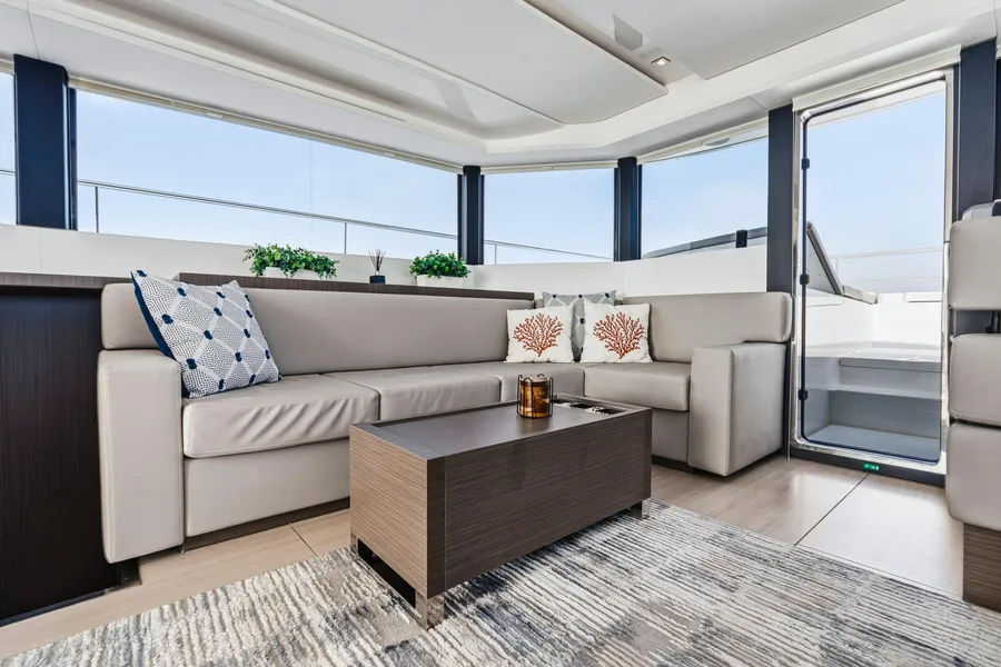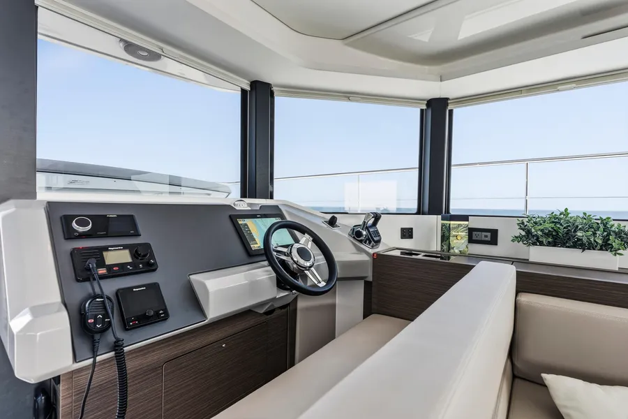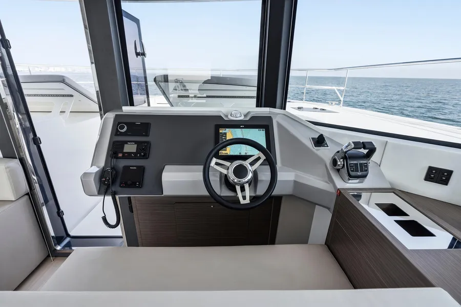 Equipped with a premium Raymarine package, including dual Axiom XL 19″ displays, Axiom 12″ at the interior helm, radar, GPS, bow thruster, and autopilot.