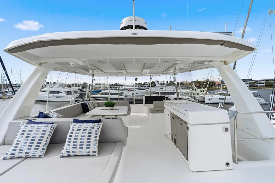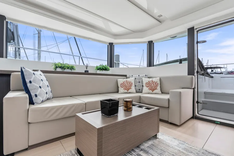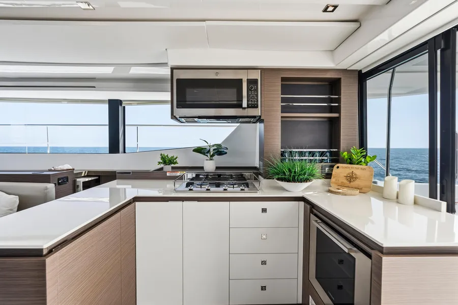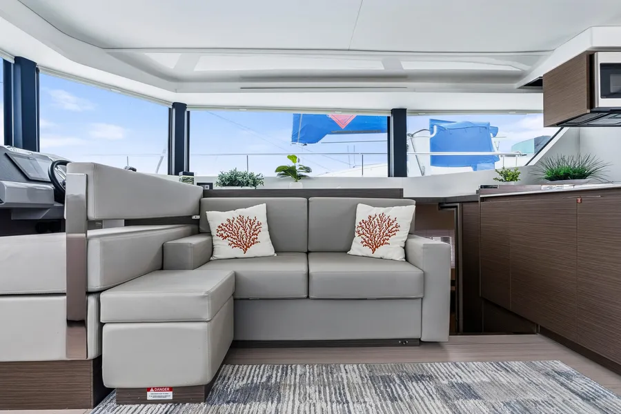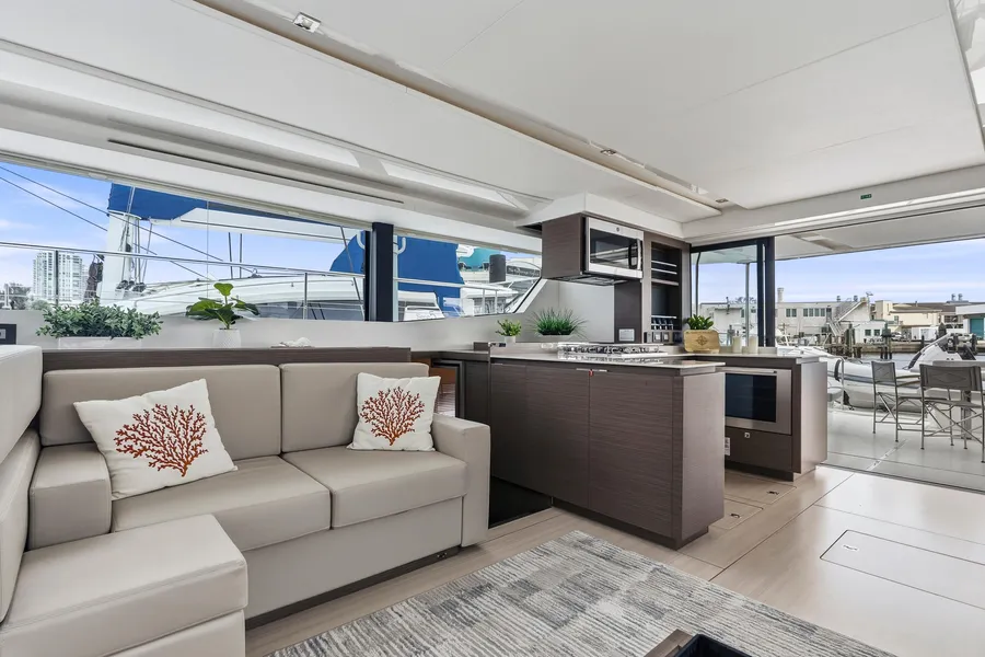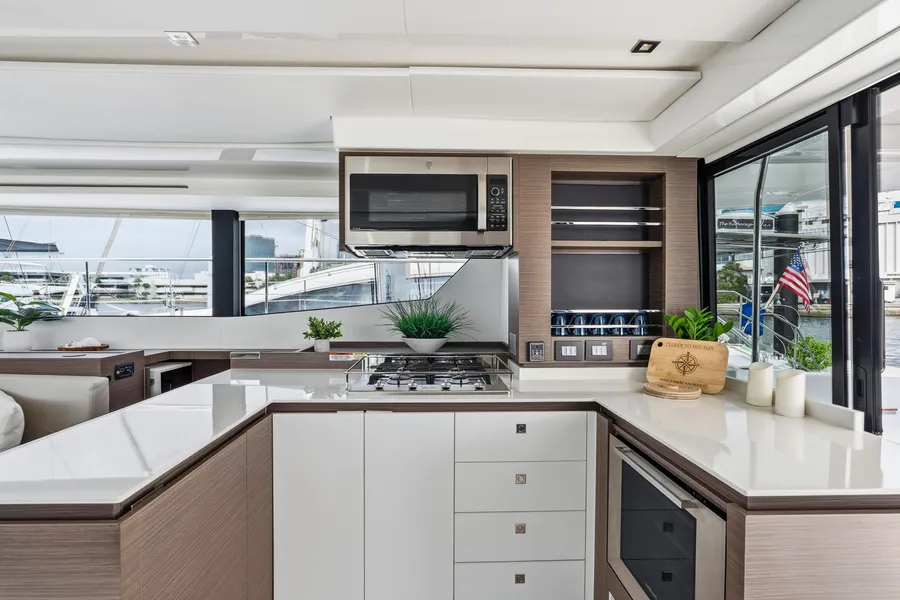Interior upgrades include Silvertex Macadamia upholstery, dark wood cabinetry, light flooring, and flat-screen TVs in all cabins, the saloon, and the aft cockpit. The galley features a residential refrigerator/freezer, wine cooler, dishwasher, and microwave oven. The port hull offers two guest cabins, two heads, and a washer/dryer combo.
