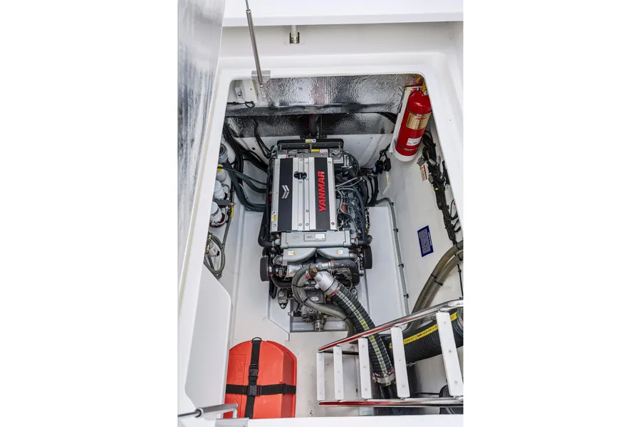 Powered by twin Yanmar 8LV370s, she cruises at ~17 knots with a top speed of 24–25 knots. With 562 gallons of fuel, the range is approximately 402 nm at cruise and ~1,155 nm at the most fuel-efficient speeds (7-8 knots). A Voyager 600 watermaker adds long-range autonomy.