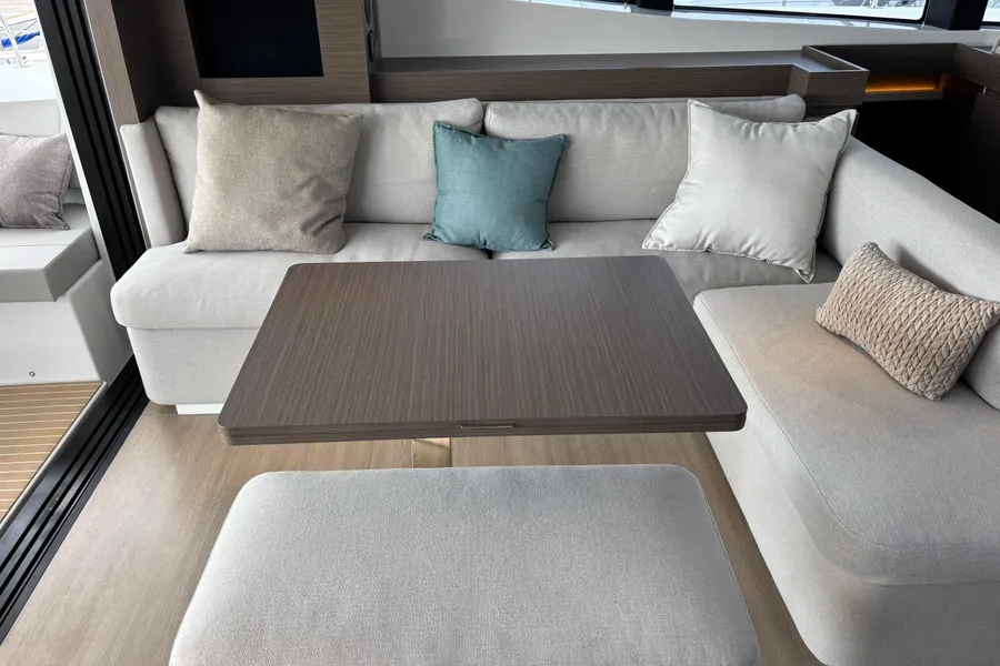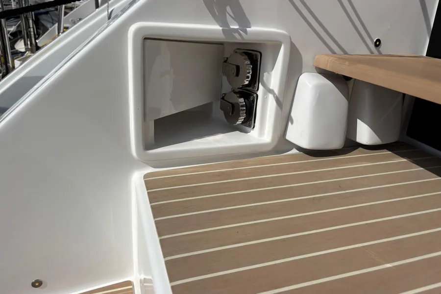 Composite teak decking (Colour – Bleached with White Caulking): aft cockpit, fwd cockpit, helm platform, transom steps and coachroof lounge and lifting platform