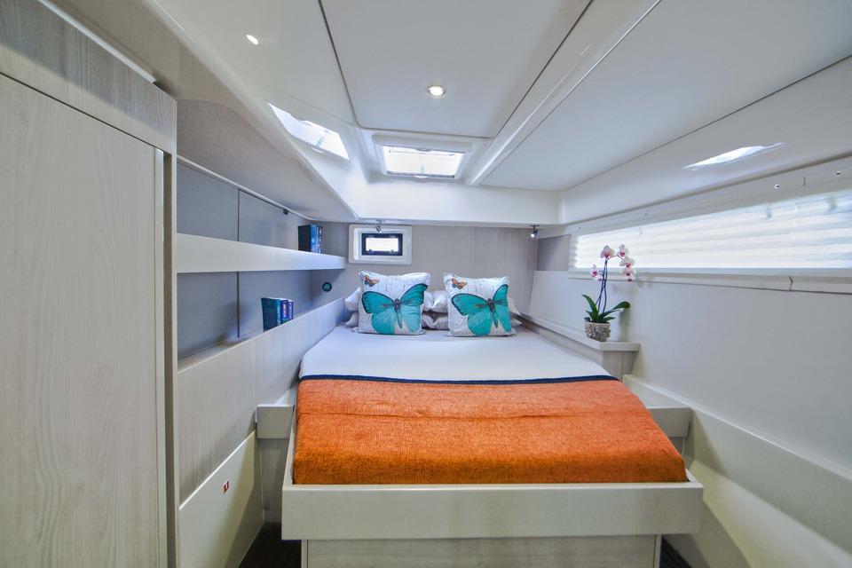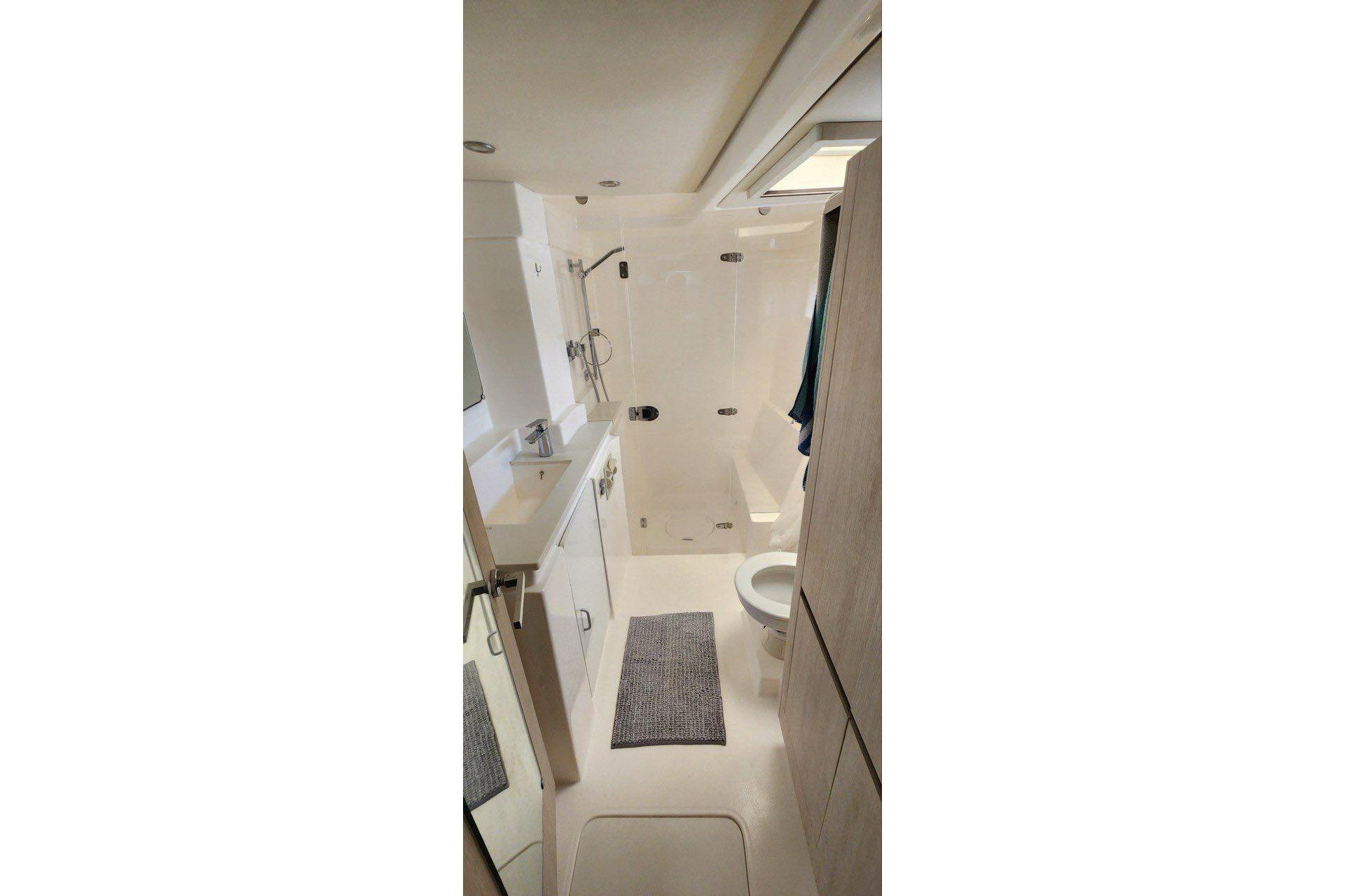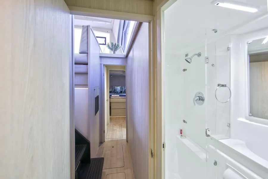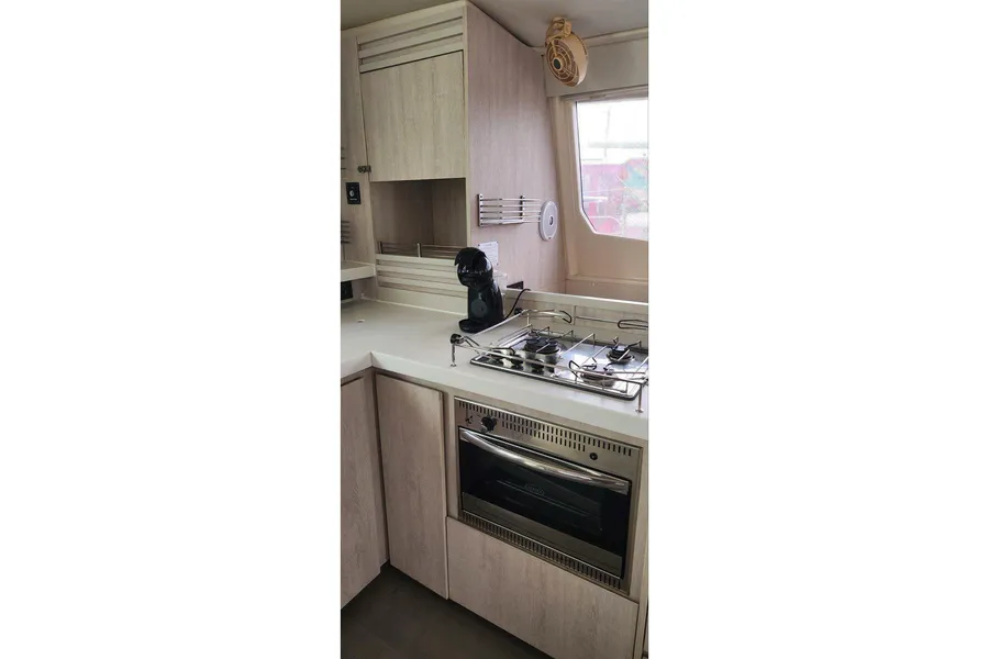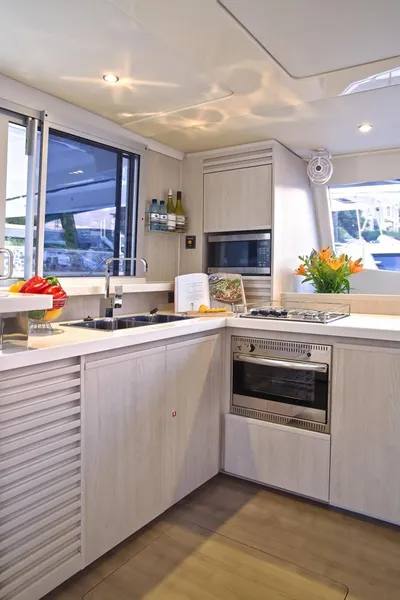 The interior of the Leopard 48 combines modern design with practical functionality. The galley is fully equipped with quality appliances, generous preparation space, and smart storage solutions. The open-plan saloon layout creates a bright, spacious atmosphere, while the modern lines and high-quality finishes deliver a premium onboard living experience — ideal for long-term cruising or charter operation.