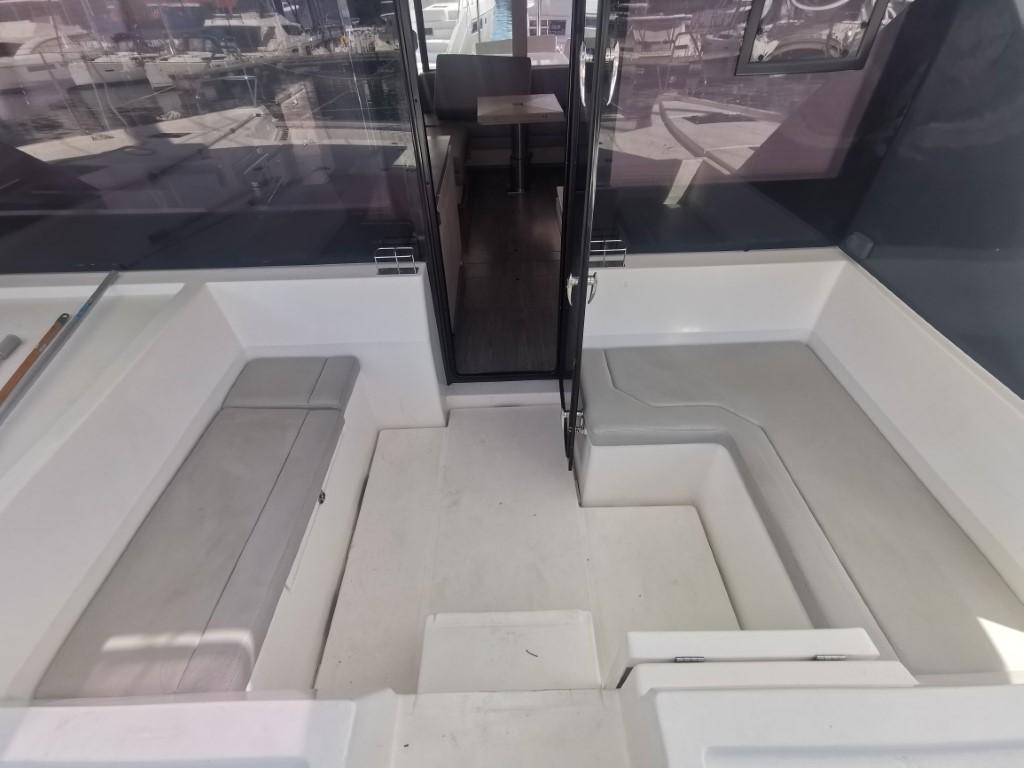 The Leopard 50 has the ideal layout for anyone looking for more outdoor living space as she comes equipped with a flybridge that includes a lounge area, table, sunbed and optional exterior speakers and shade awning. Access is provided by floating stairs leading up from the aft cockpit. An important distinction compared to similar sailboat flybridge configurations is that while under sail, passengers can move about the flybridge with ample headroom and never worry about interference from the boom. The flybridge is also situated to still maintain contact with the helm station, an important feature found on all Leopard Catamarans.