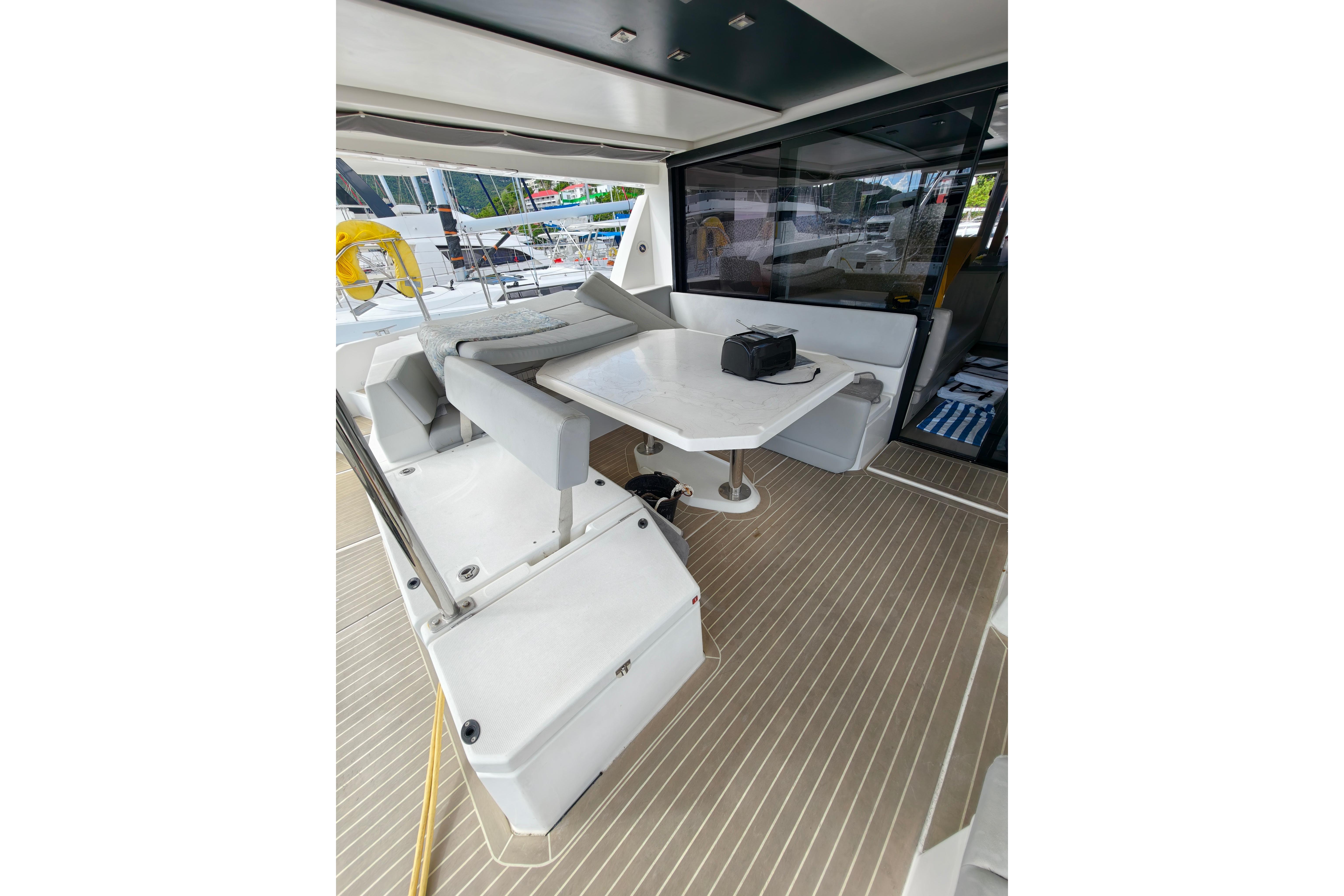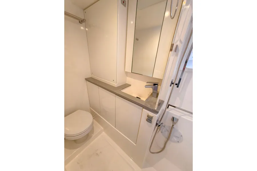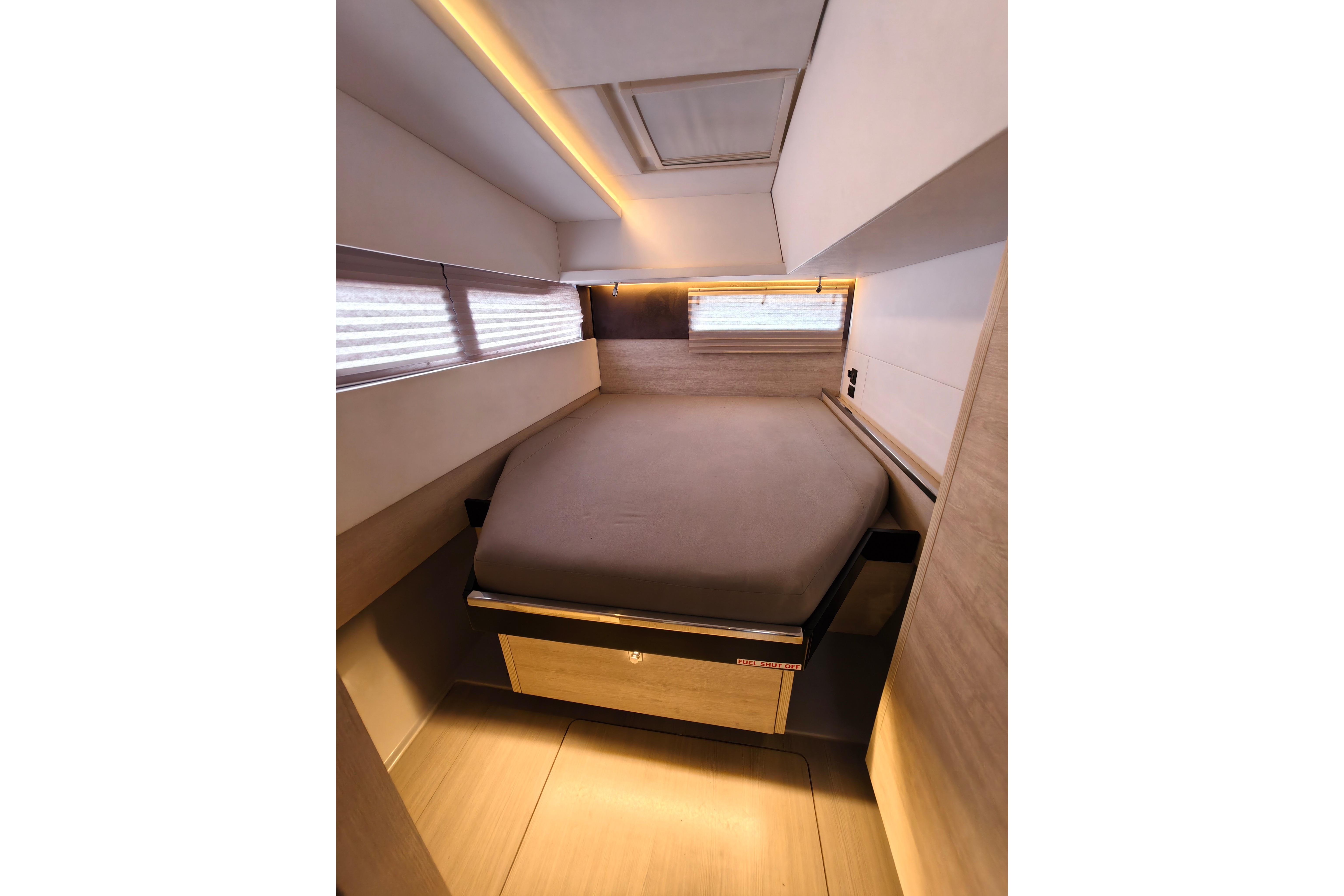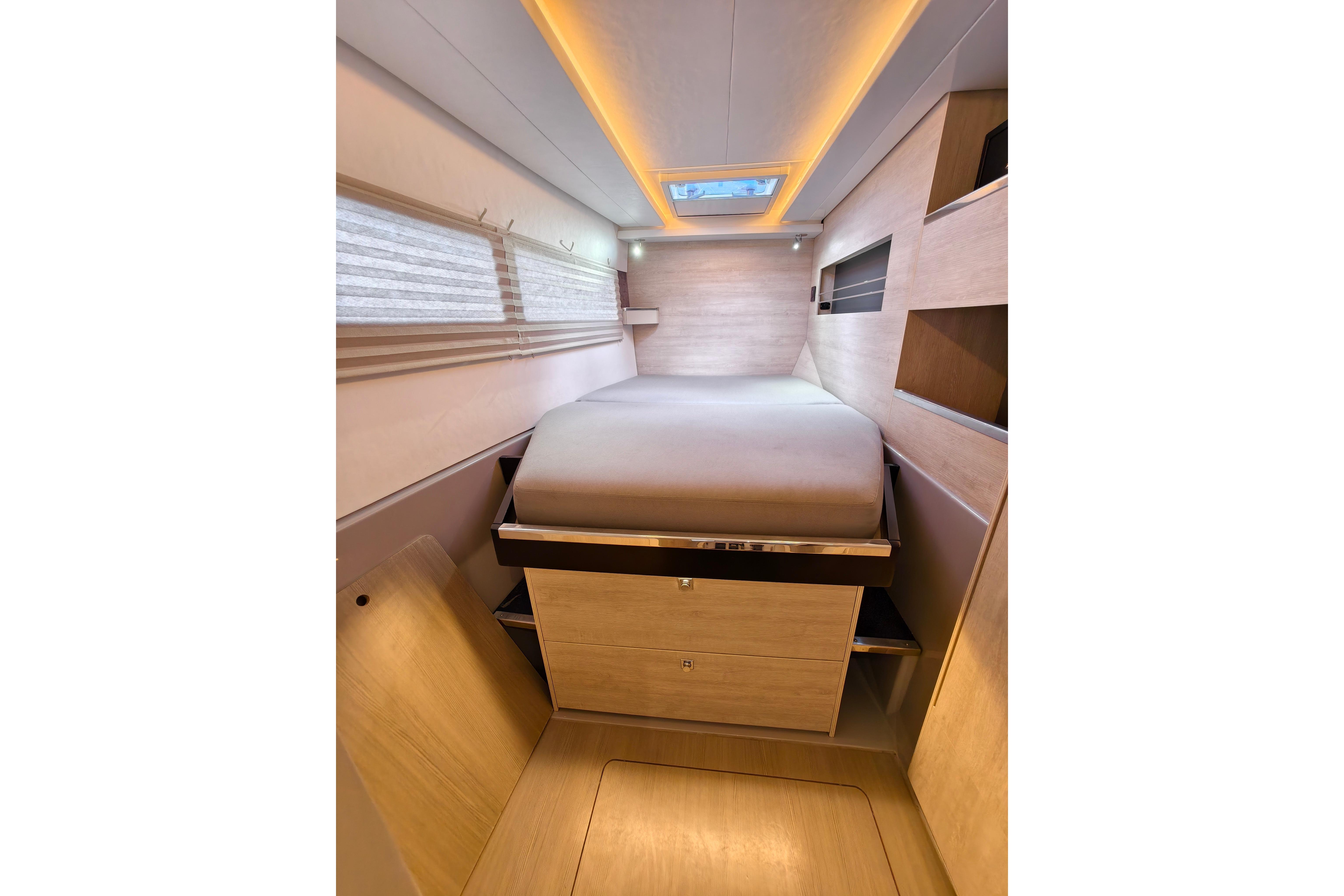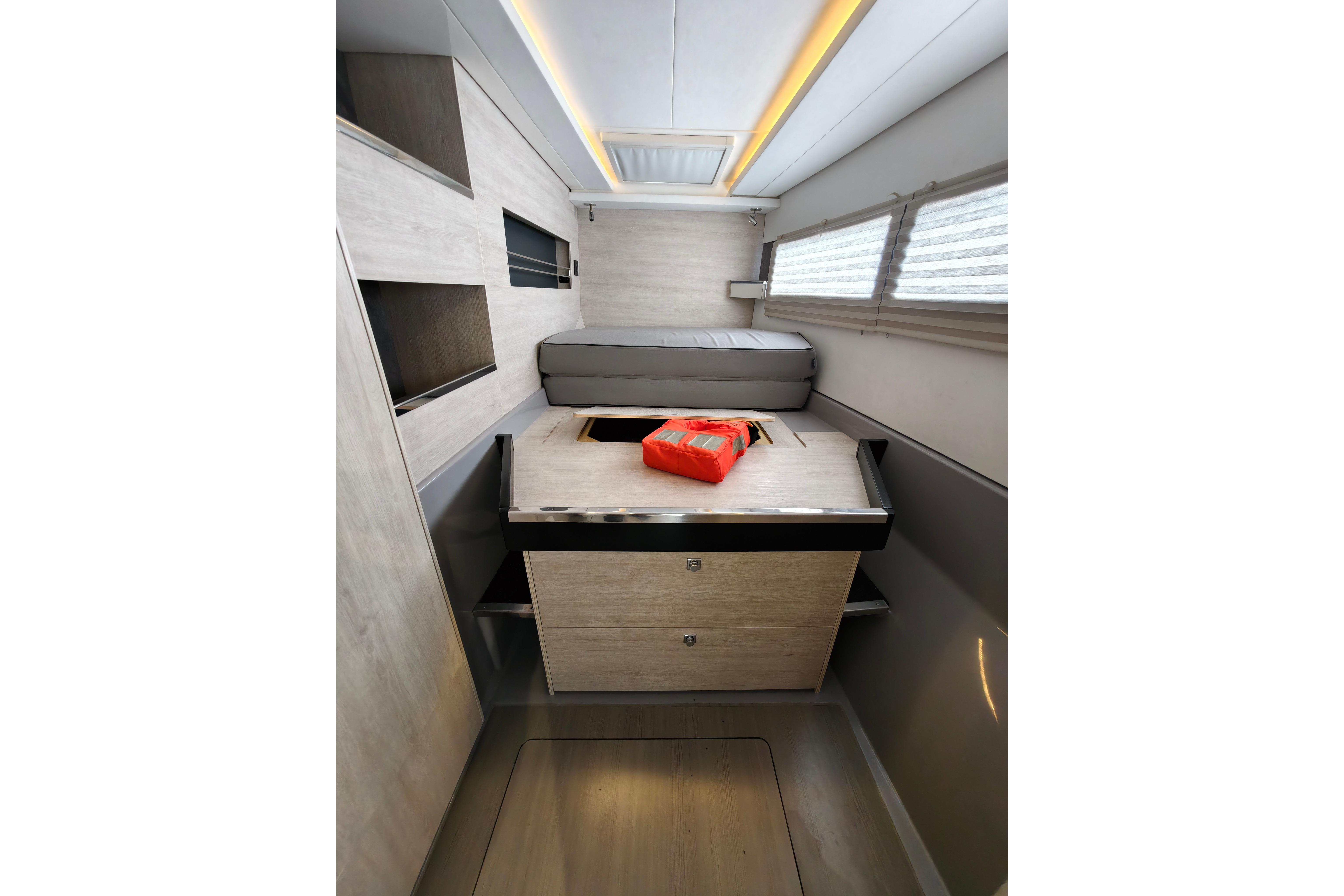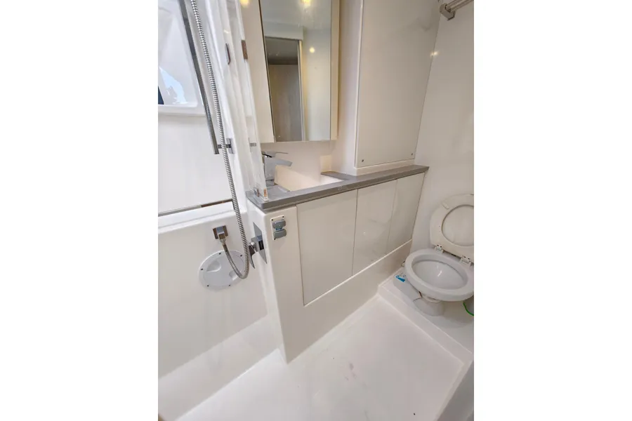 Onboard entertaining is accentuated with ample dining space, and forward facing L shaped seating communicating directly with the galley, situated forward. Wide sliding saloon doors afford panoramic views towards the stern, allowing the interior saloon to flow naturally towards the outside aft and forward cockpit.