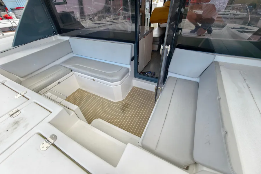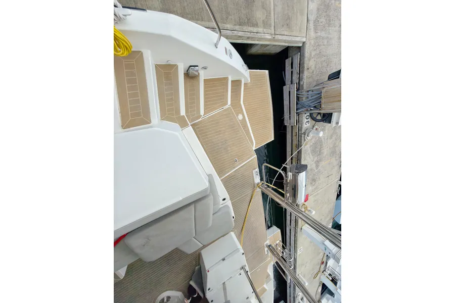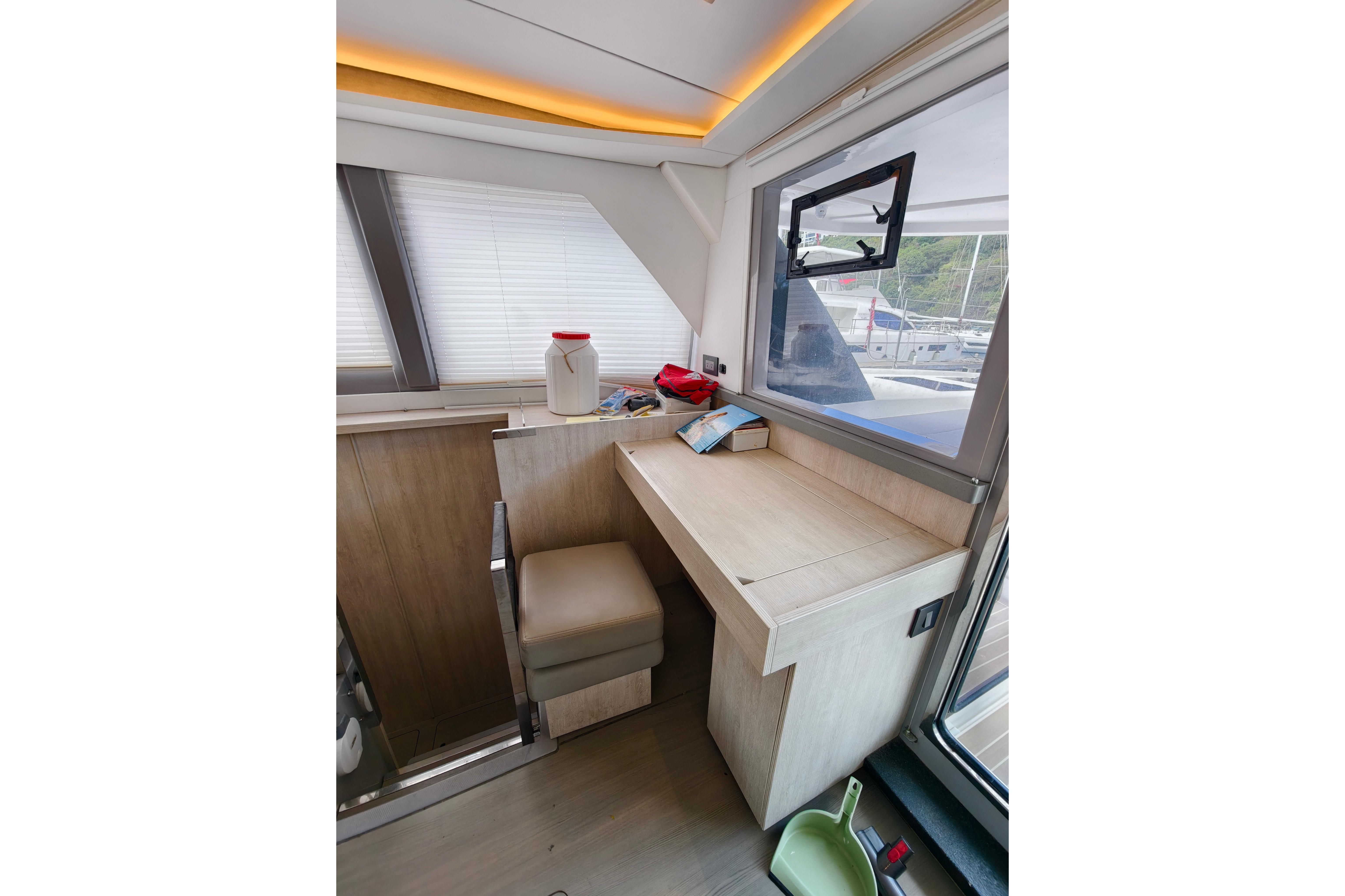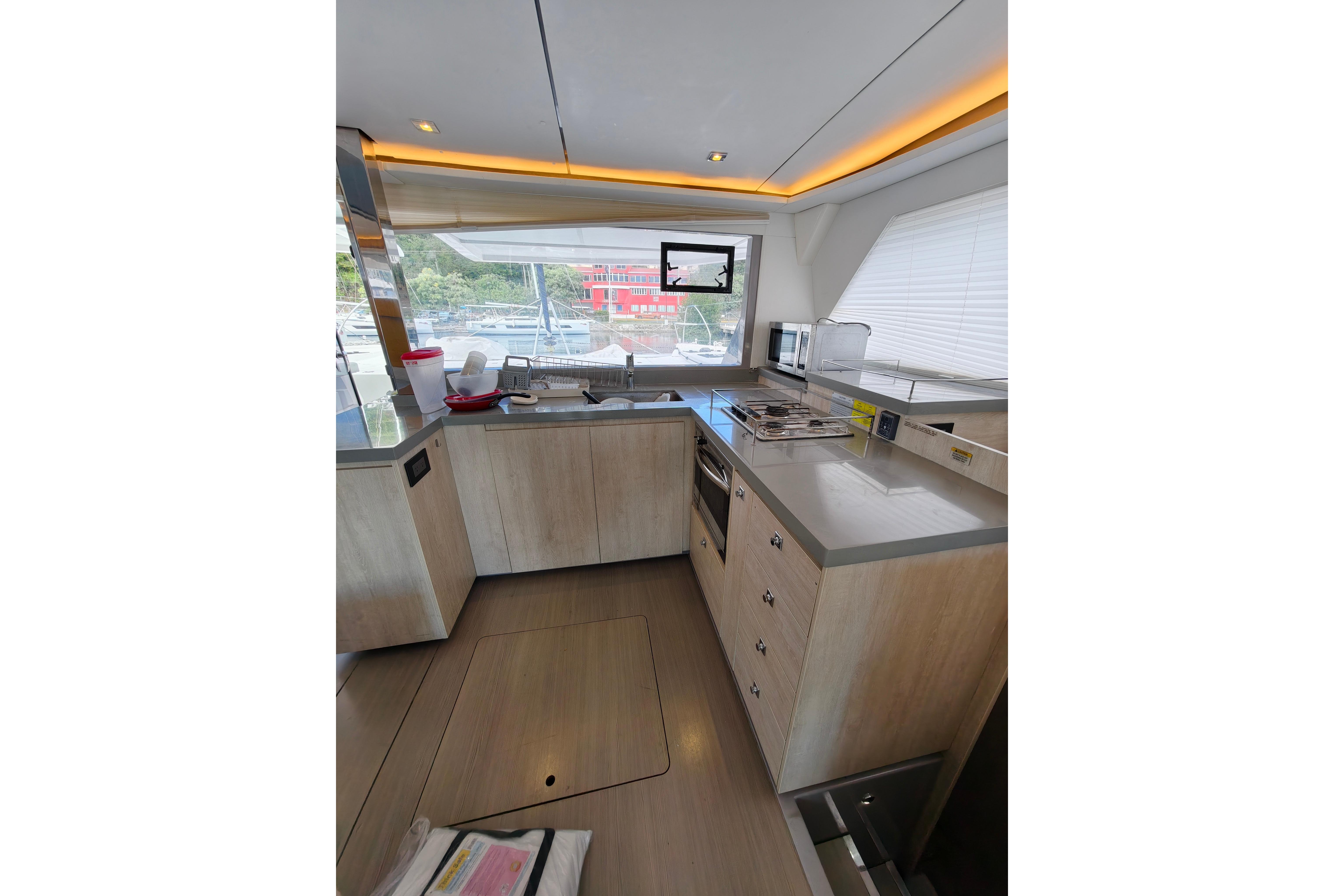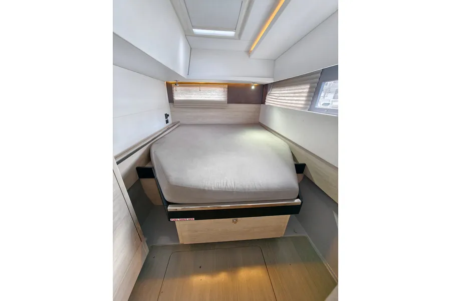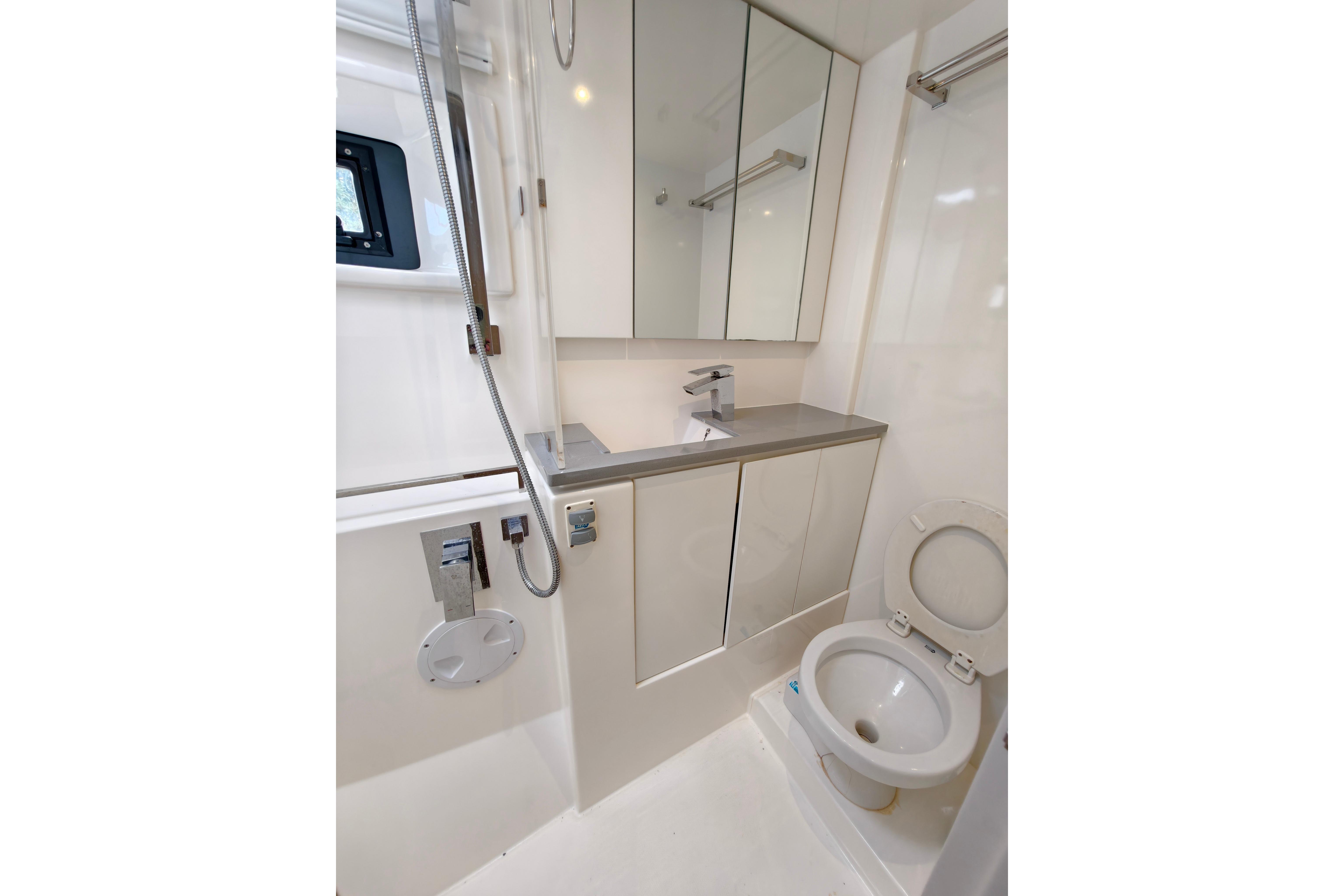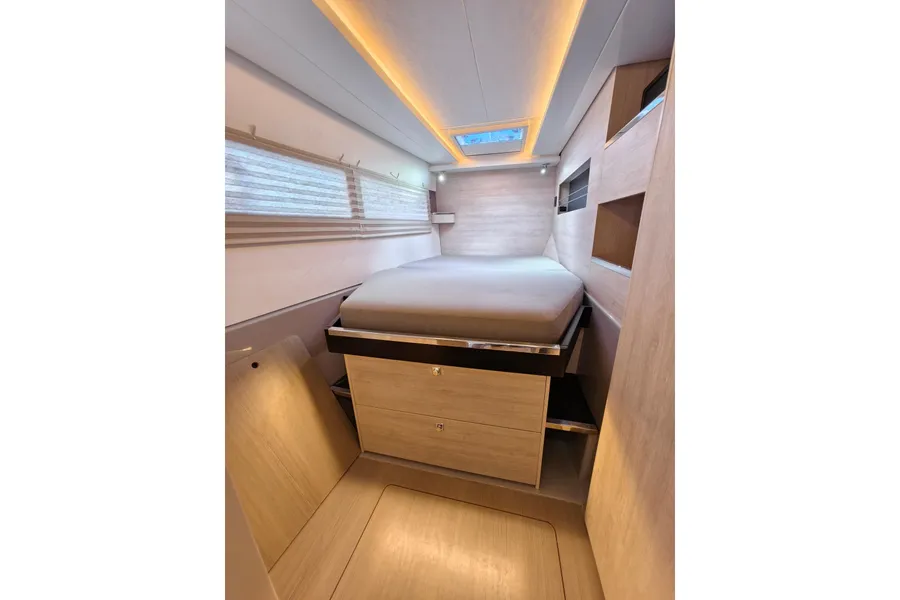 Onboard entertaining is accentuated with ample dining space, and forward facing L shaped seating communicating directly with the galley, situated forward. Wide sliding saloon doors afford panoramic views towards the stern, allowing the interior saloon to flow naturally towards the outside aft and forward cockpit.