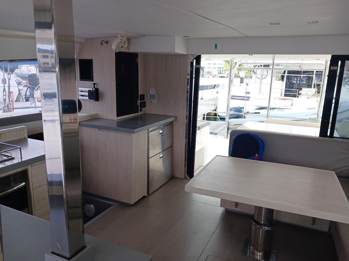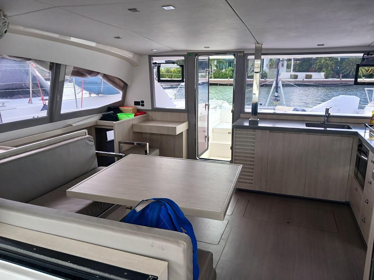BUILDERS REMARKS: The Leopard 40, a product of South African boat builders Robertson & Caine, features a unique, modern design thanks to experienced naval architects Simonis and Voogd as well as Robertson & Caine’s design team. She resembles her predecessors in speed, agility, and blue-water performance, but her enhancements include an increased hull volume and an innovative interior layout, which is unlike any Leopard before her. Her galley is located forward and the forward-facing settee and window and an access door to the forward platform of the boat. This allows for a panoramic view with large sliding glass doors between the saloon and the aft cockpit. This arrangement promotes easy communication for guests and an open flow between the saloon and the aft cockpit, creating a fusion of indoor and outdoor living space.