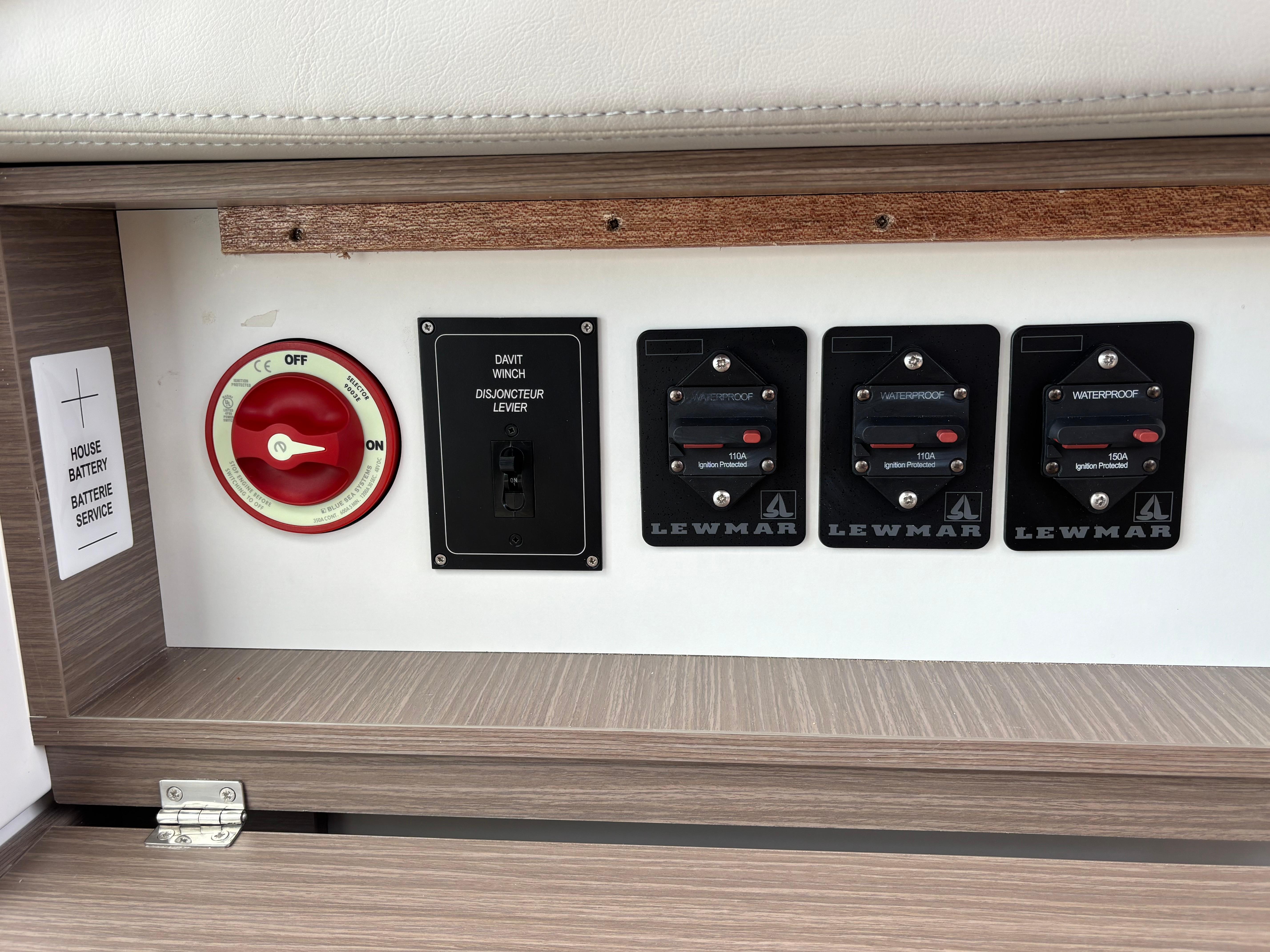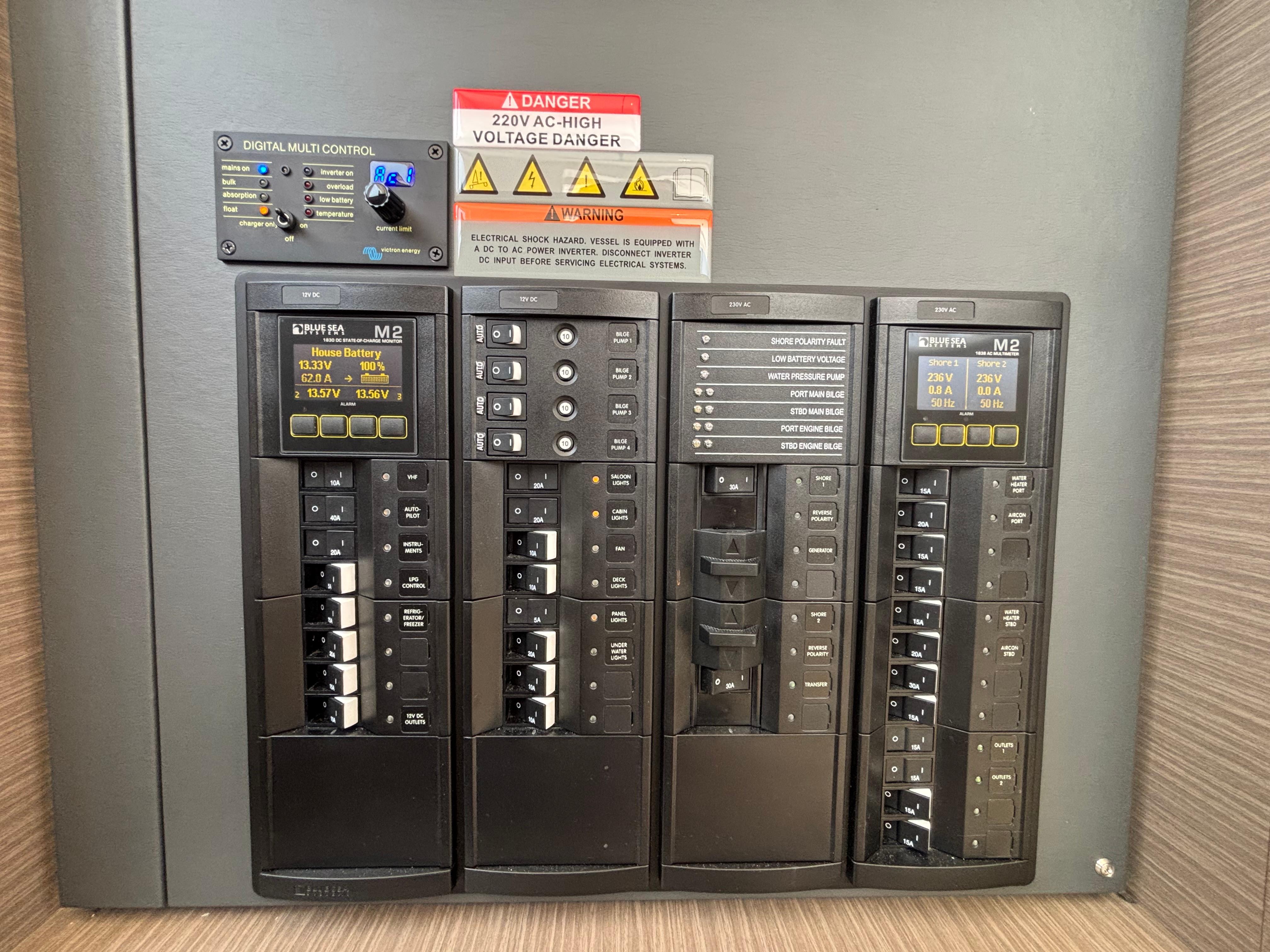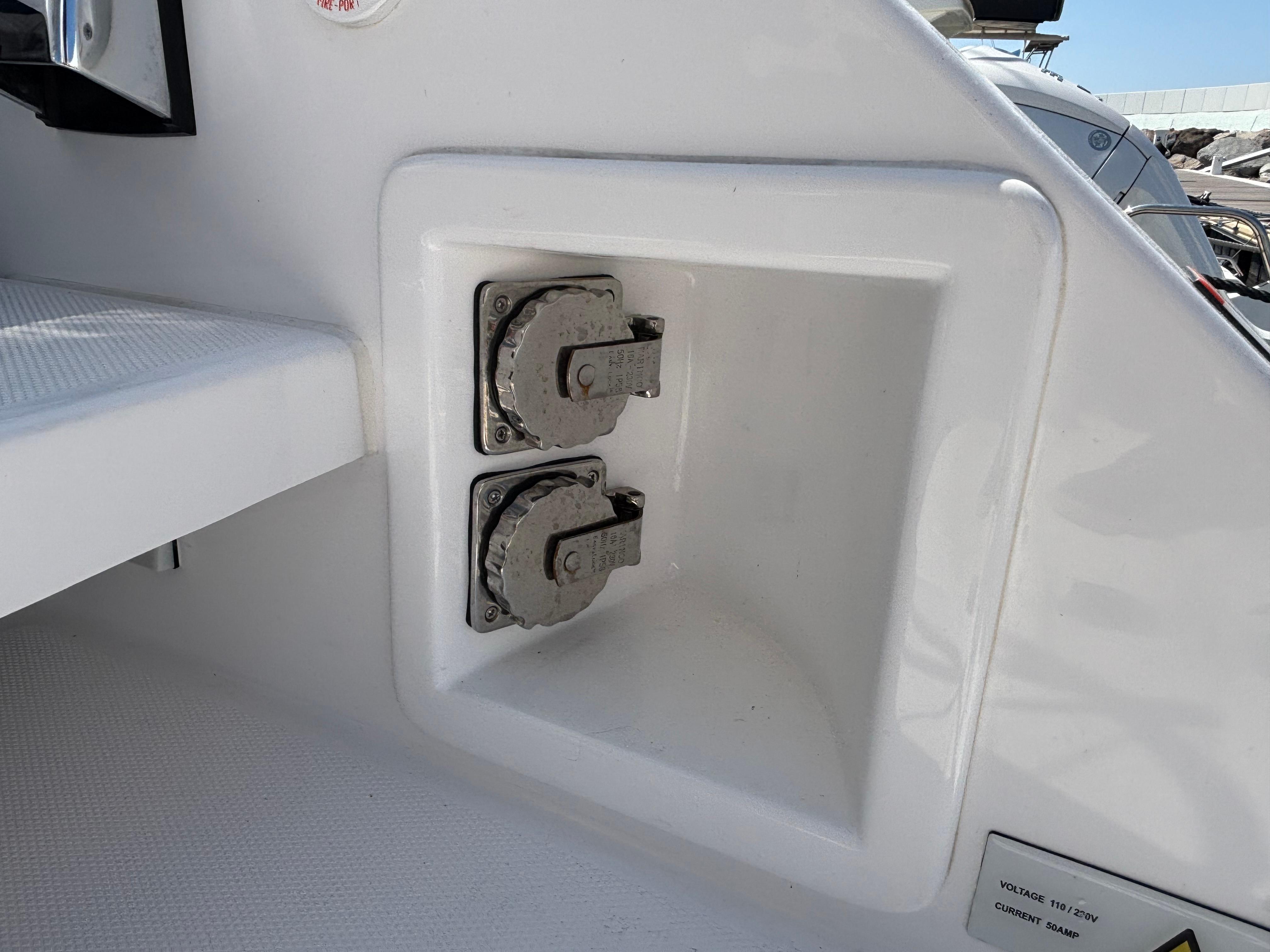220V Shore Power Pack: Includes 2 x 16A port and 2 x 16A stbd shore power inlets with 2 x heavy duty 50ft shore powerlines. AC switch panel, HWC 220V conversion and AC outlets in cabins, saloon, galley and nav station