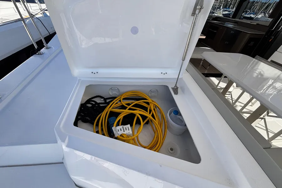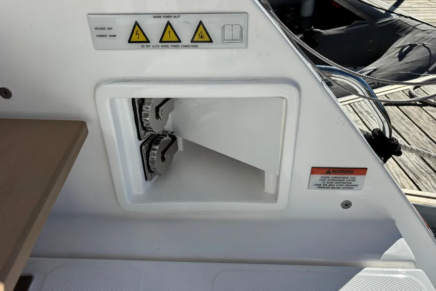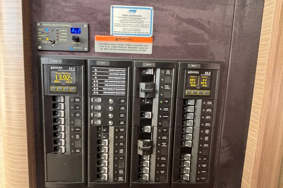 220V Shore power pack: Includes 2 x 220V 32A port and 2 x 220V 32A stbd shore power inlets with 2 x heavy duty 50ft shore power lines, AC switch panel, 5000W 220V inverter/charger (in lieu of standard inverter), hot water cylinder and Convection microwave voltage conversion to 220V, Battery management system allowing monitoring on Multifunction display, AC outlets in cabins, saloon and galley