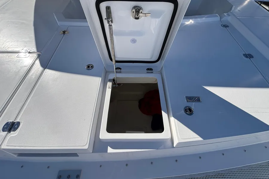 Available with two standard 45hp Yanmar diesel engines (or optional upgraded 57hp versions), the Leopard 46 also ushers in a new era of sustainability with the optional HYBRID ELECTRIC DRIVE SYSTEM: The system includes a power management box, electric propulsion pod, high-voltage lithium-ion battery, solar array, and range-extending generator. The boat’s power can be sourced from solar panels, sailing regeneration, shore power, and a range extender. The system can manage charging and discharging, providing power for both propulsion and house loads. Testing shows speeds over 8 knots and regeneration capabilities up to 1.8 KW per hour per hull.
