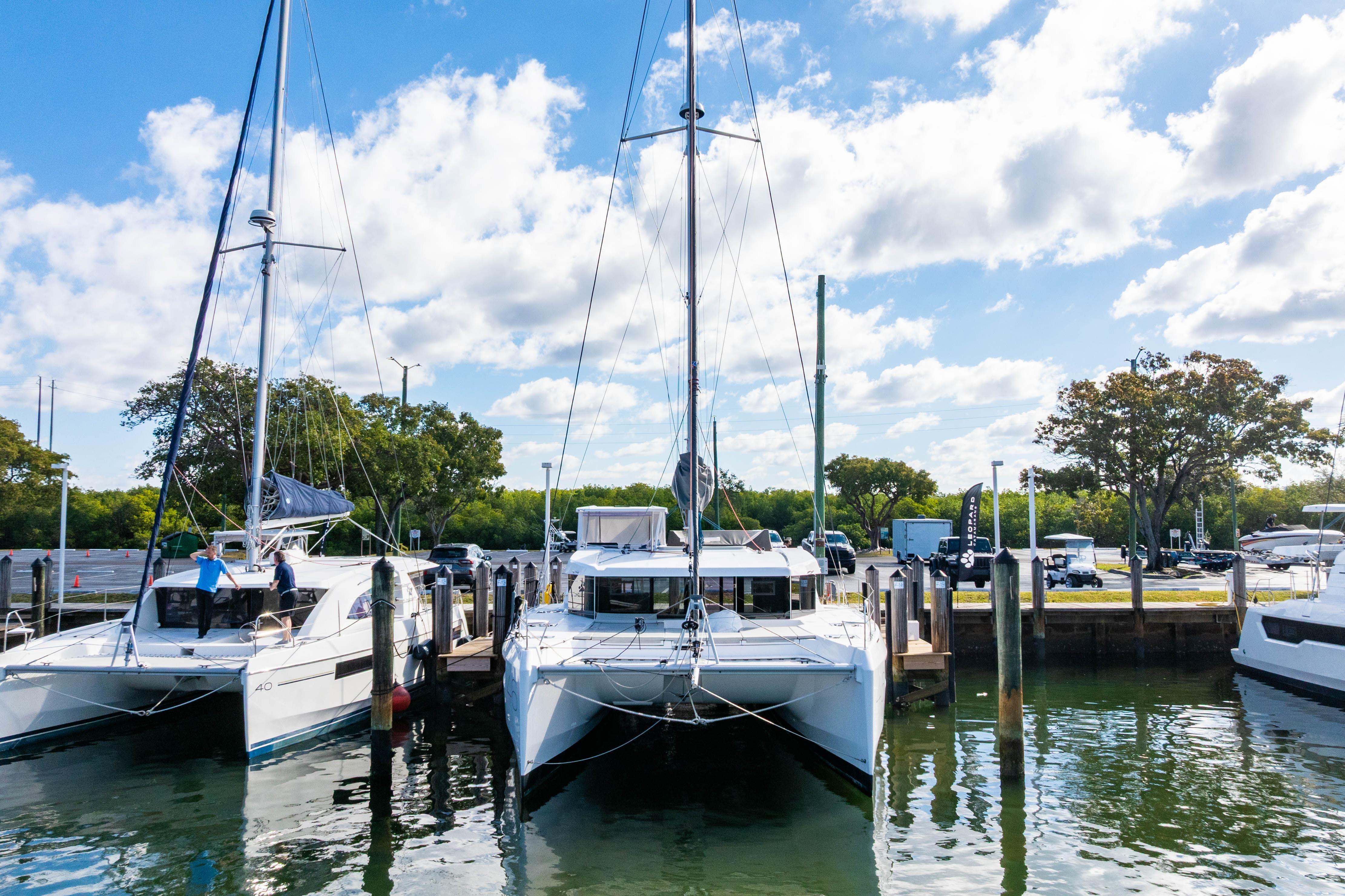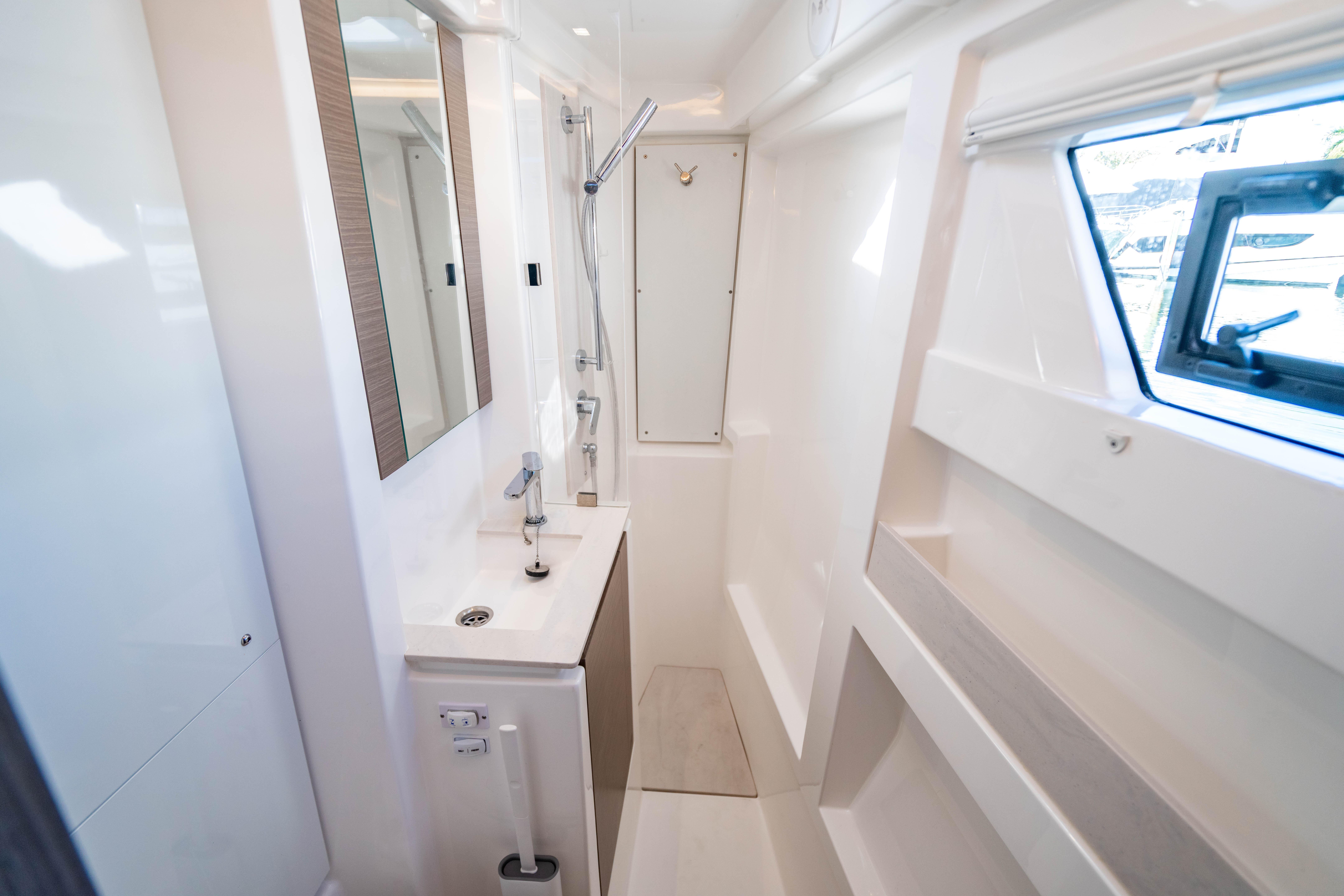 The stepped hulls and powerful rig with overlapping genoa provide superior handling in all wind conditions. The protected helm station is designed for offshore single-handed sailing, making it ideal for long-distance voyages.
